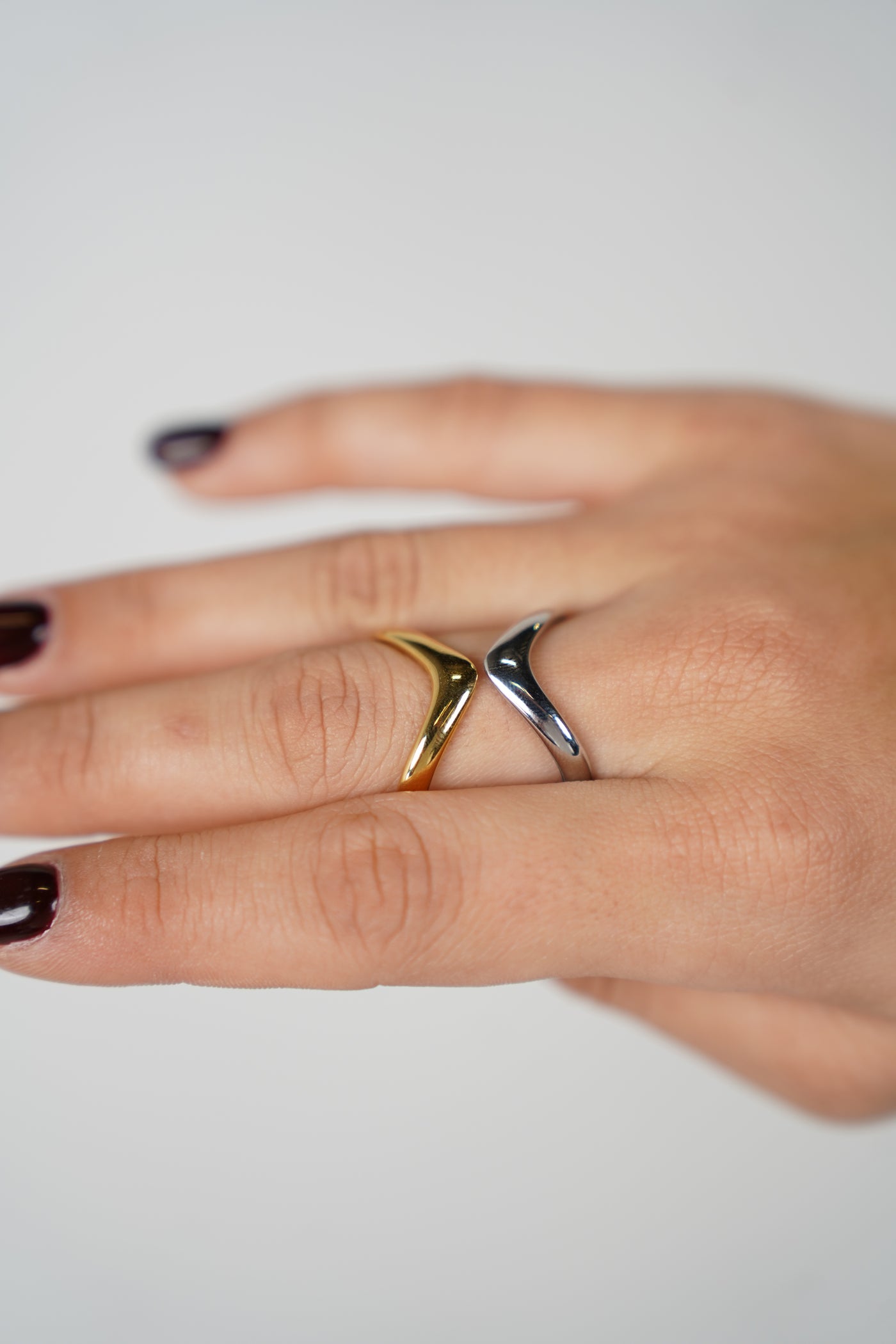 Model is wearing both gold and silver Noriaya Open Rings to demonstrate multiple styling options.