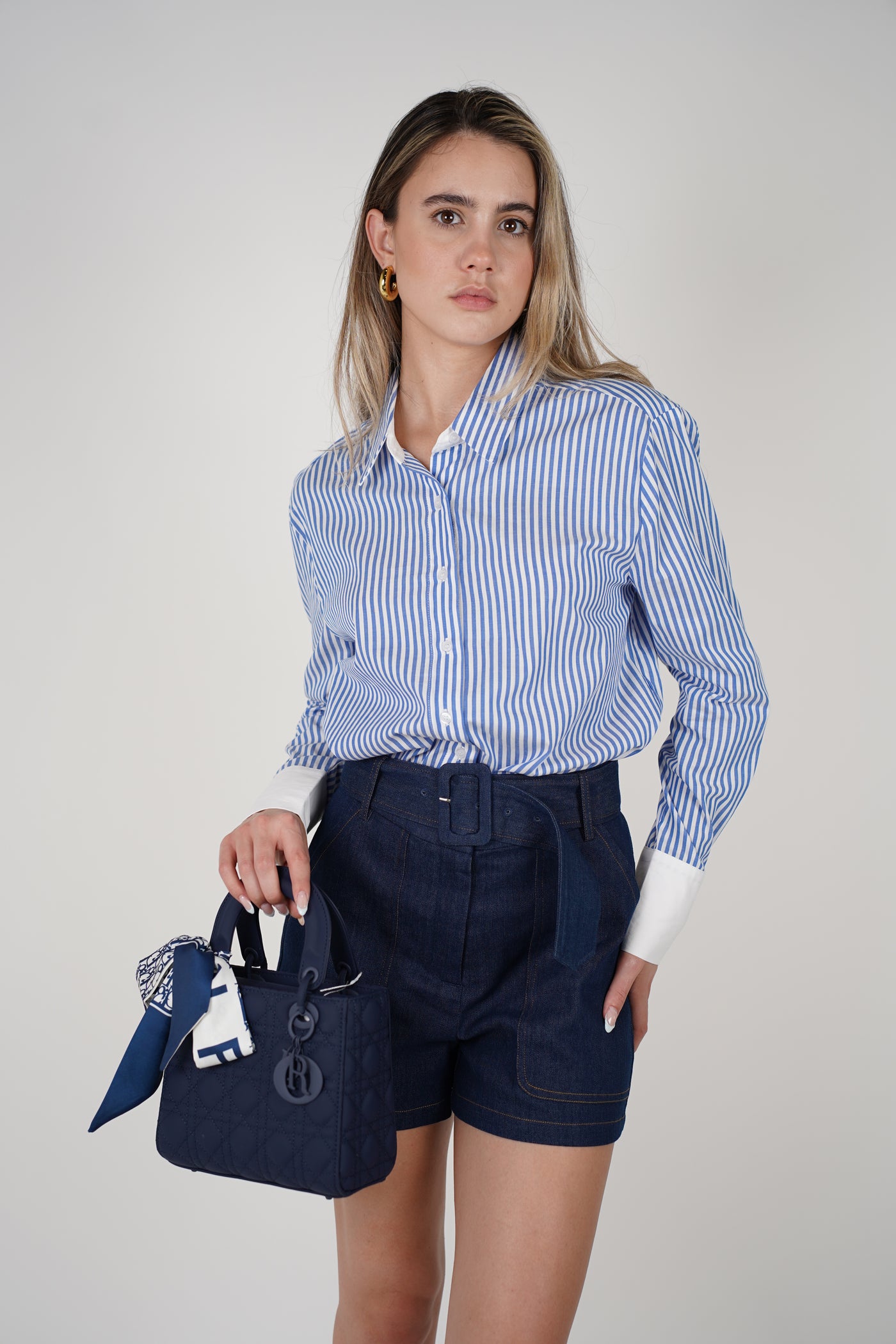Model wearing a blue striped shirt with white cuffs and dark belted denim shorts, paired with a navy handbag and white heels.