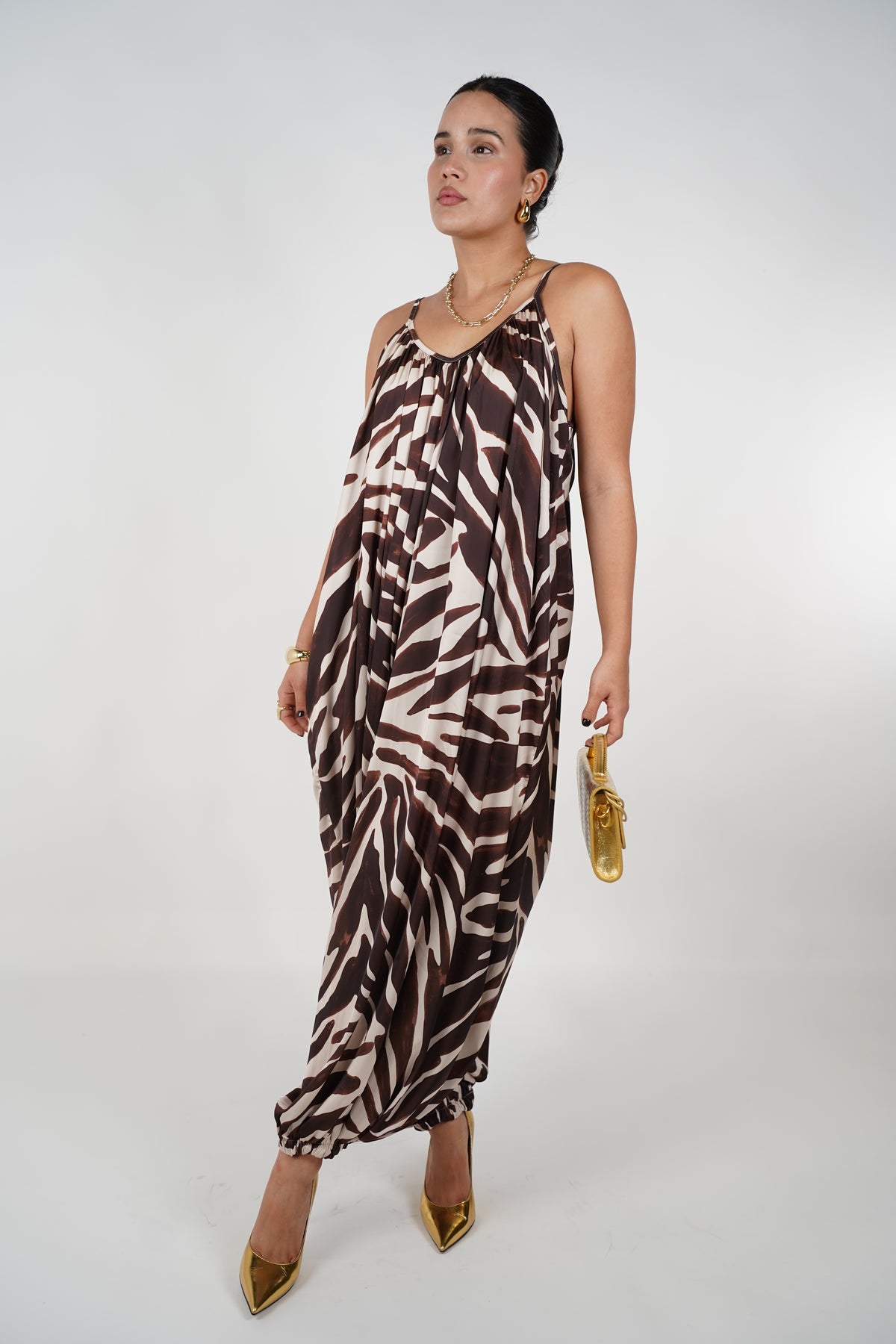 A flowy zebra-print jumpsuit with jogger-style hems for a modern, statement-making look.