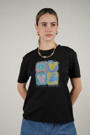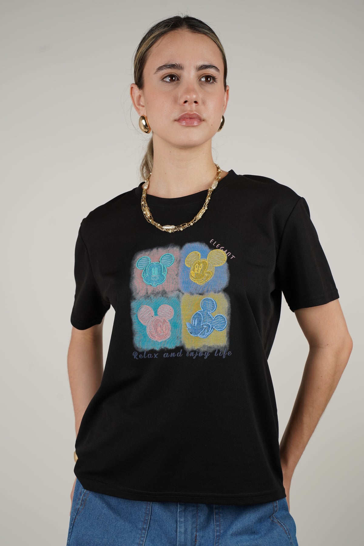 Model wearing a black t-shirt with colorful Mickey Mouse faces and “Relax and enjoy life” text