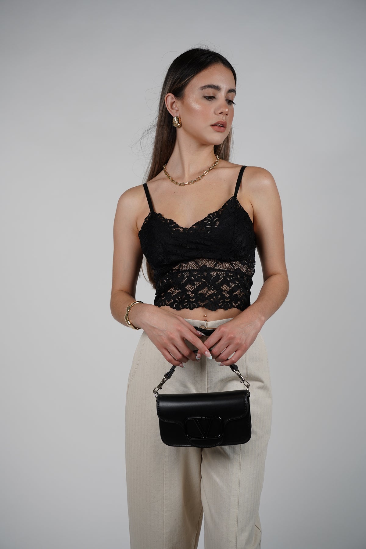 Model wearing black Rielle Lace Bralette with beige pants and black mini handbag