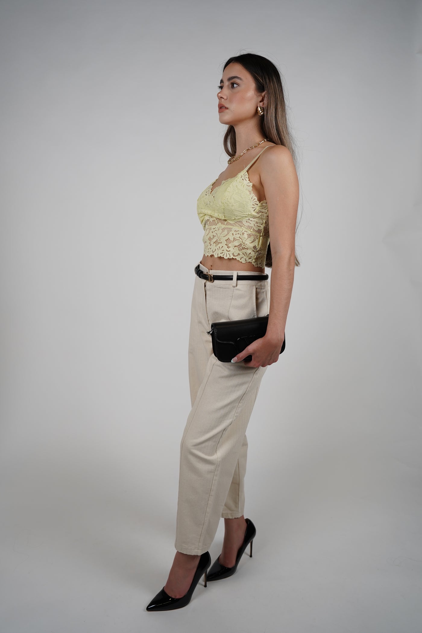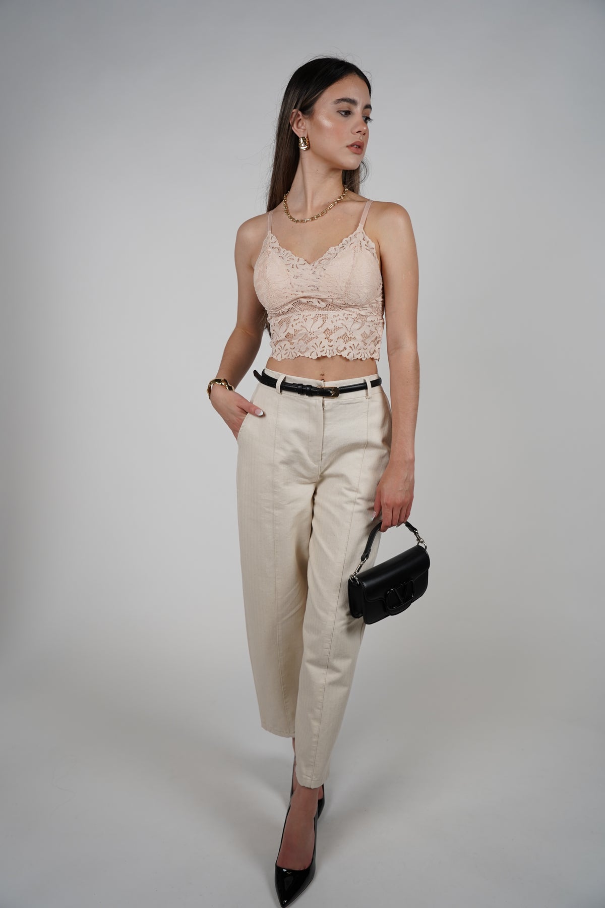 A delicate lace bralette that pairs beautifully with high-waisted pants, skirts, or layered under jackets.