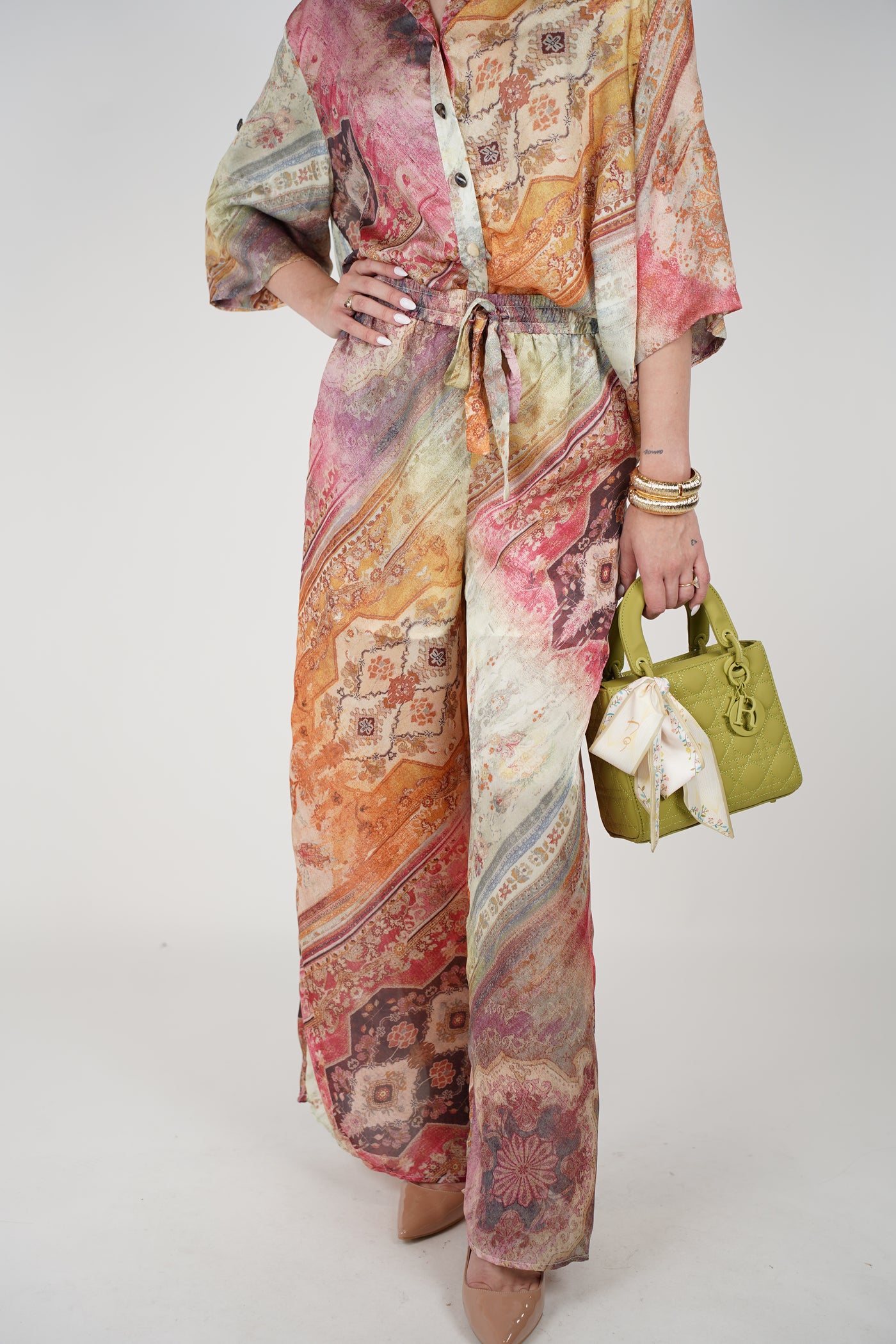 Model wearing a colorful printed two-piece set with button-up top and wide-leg pants.