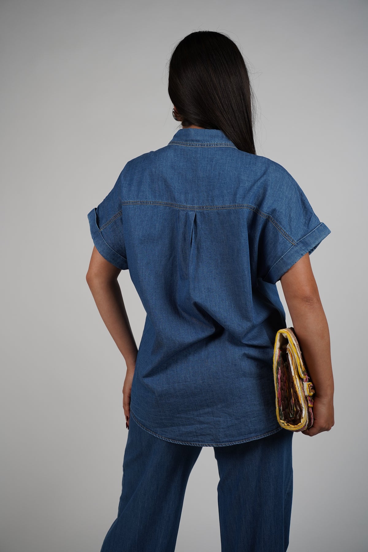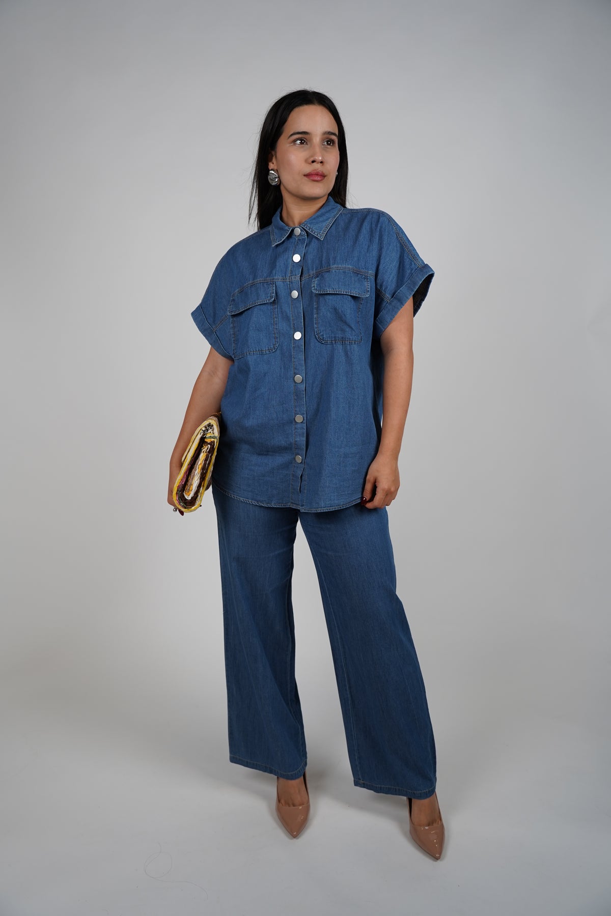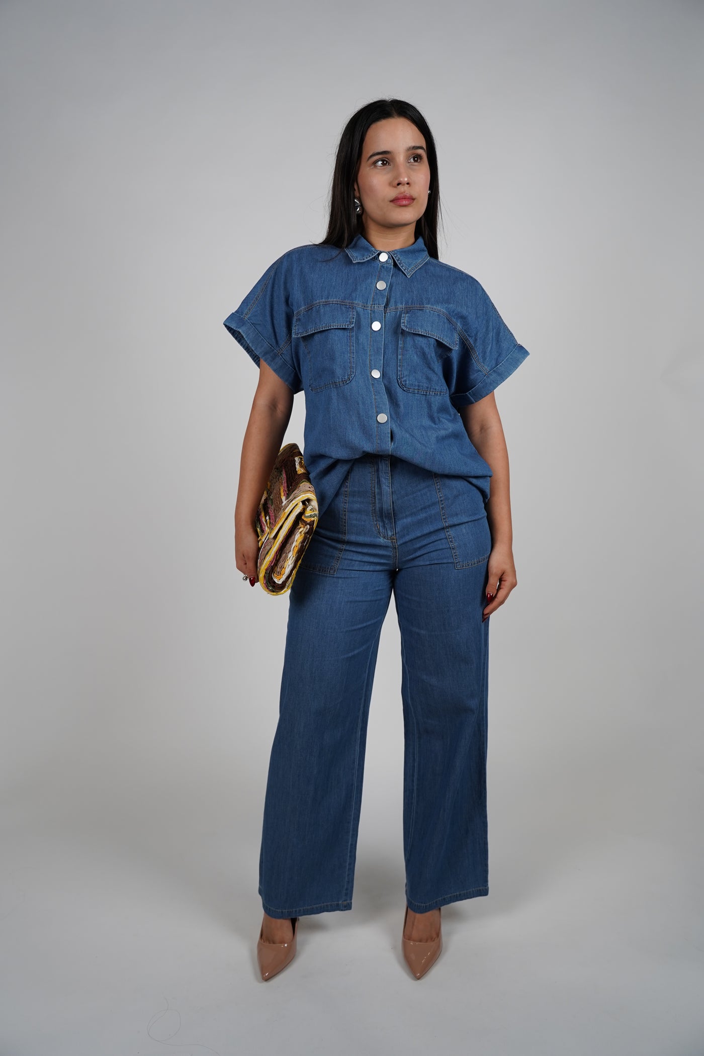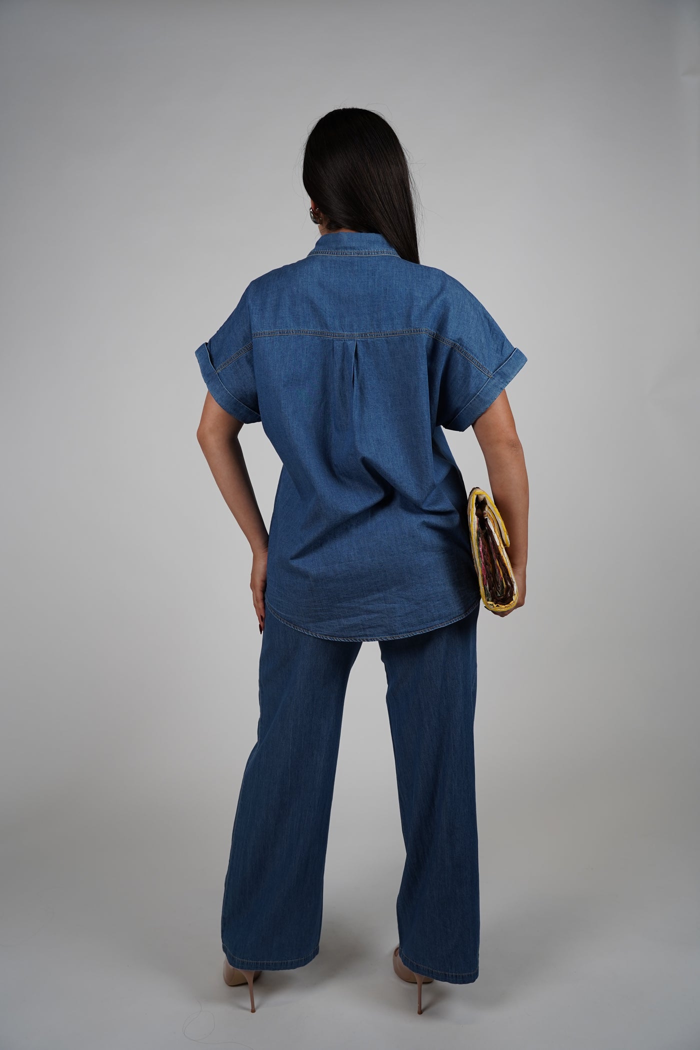 Meta Description: The Romi Soft Denim Pants Set features a relaxed short-sleeve button-up shirt and wide-leg pants in breathable denim. Casual yet chic. Ships fast.