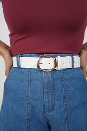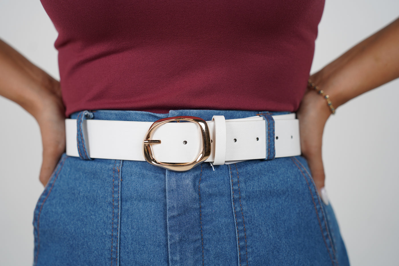 Meta Description: The Savina Belt is a crisp white accessory featuring a rounded gold buckle. A polished staple for any wardrobe. Shop now at Carema Boutique.