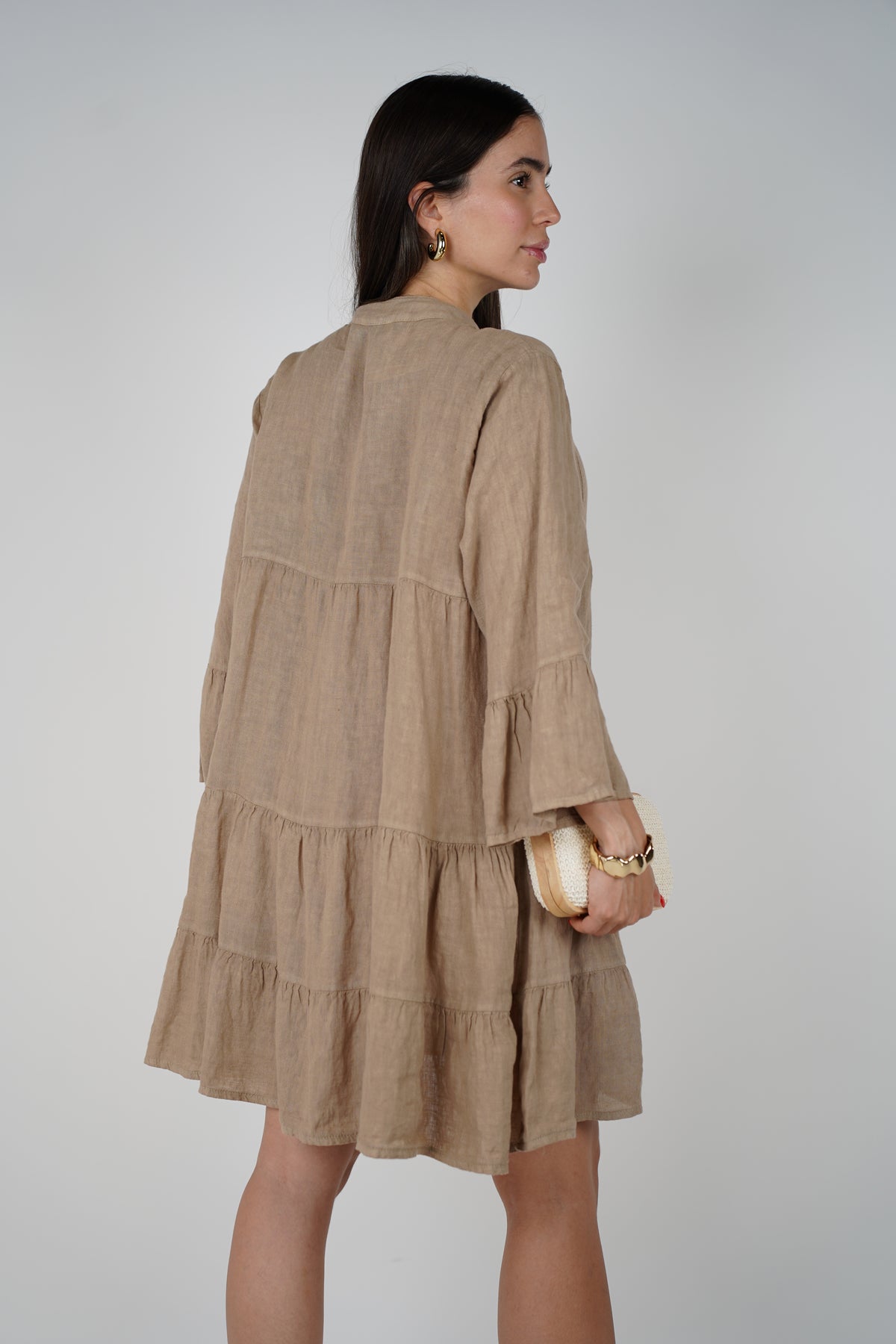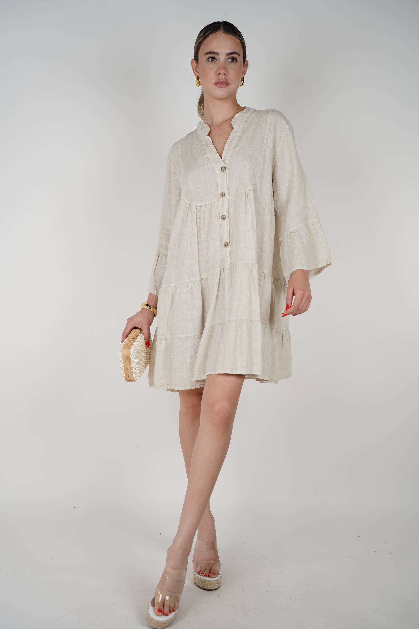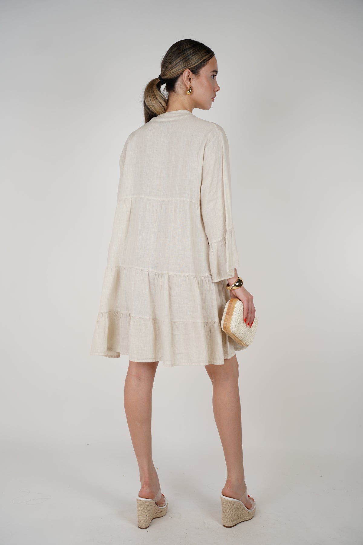 An airy and effortless mini dress with flowy tiers, natural linen texture, and a flattering relaxed silhouette.