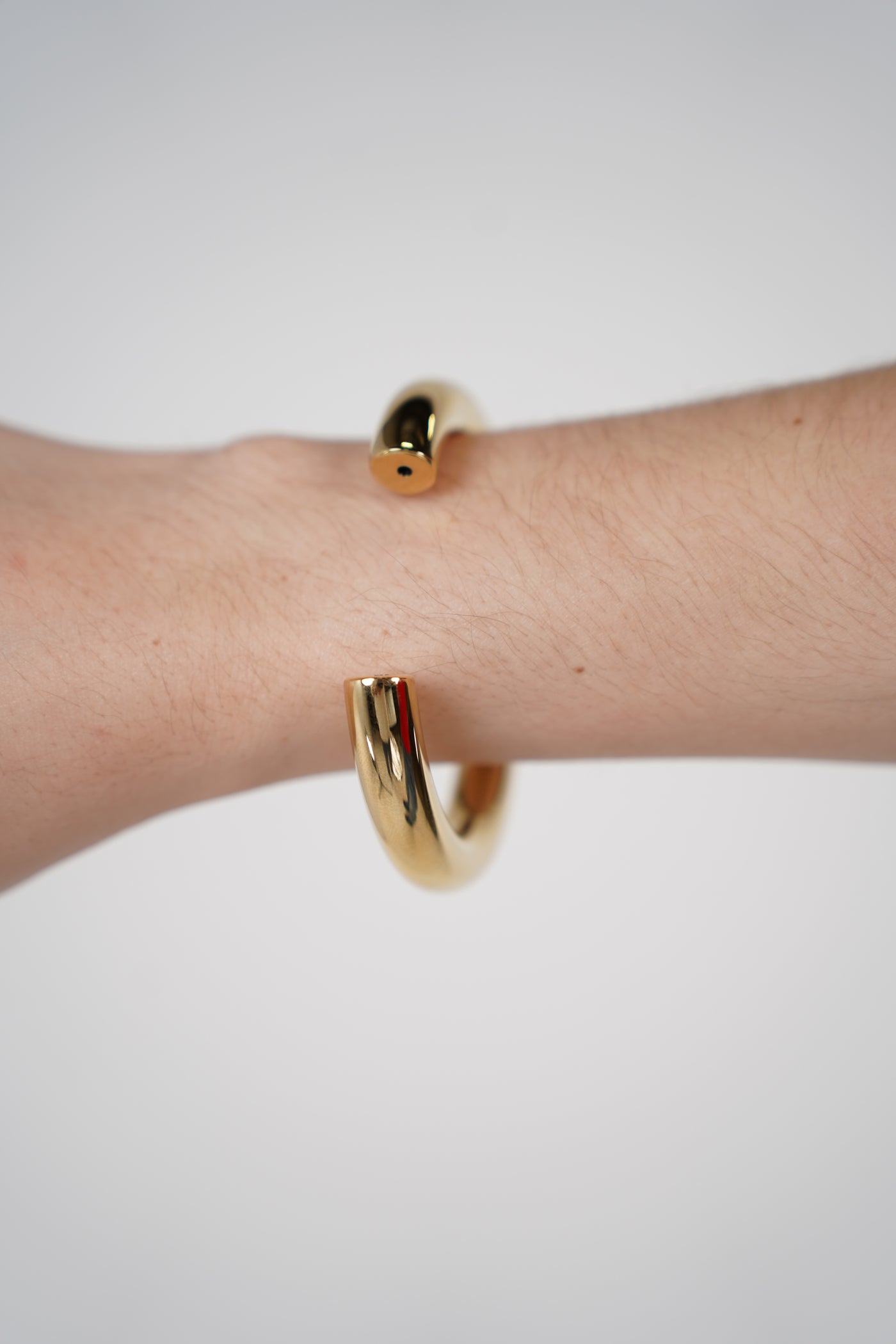 A statement chunky open bangle bracelet in a sleek high-polish gold finish.