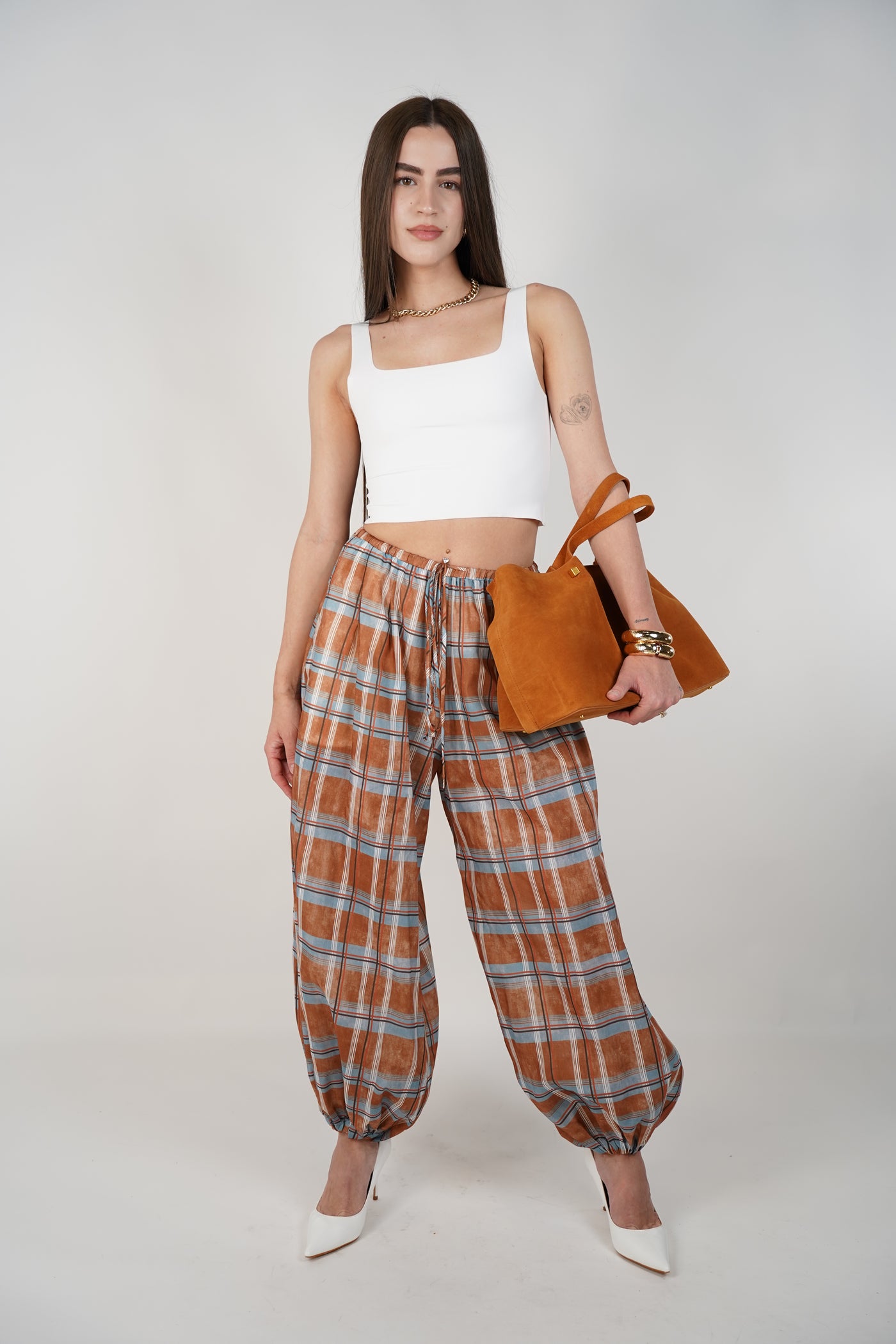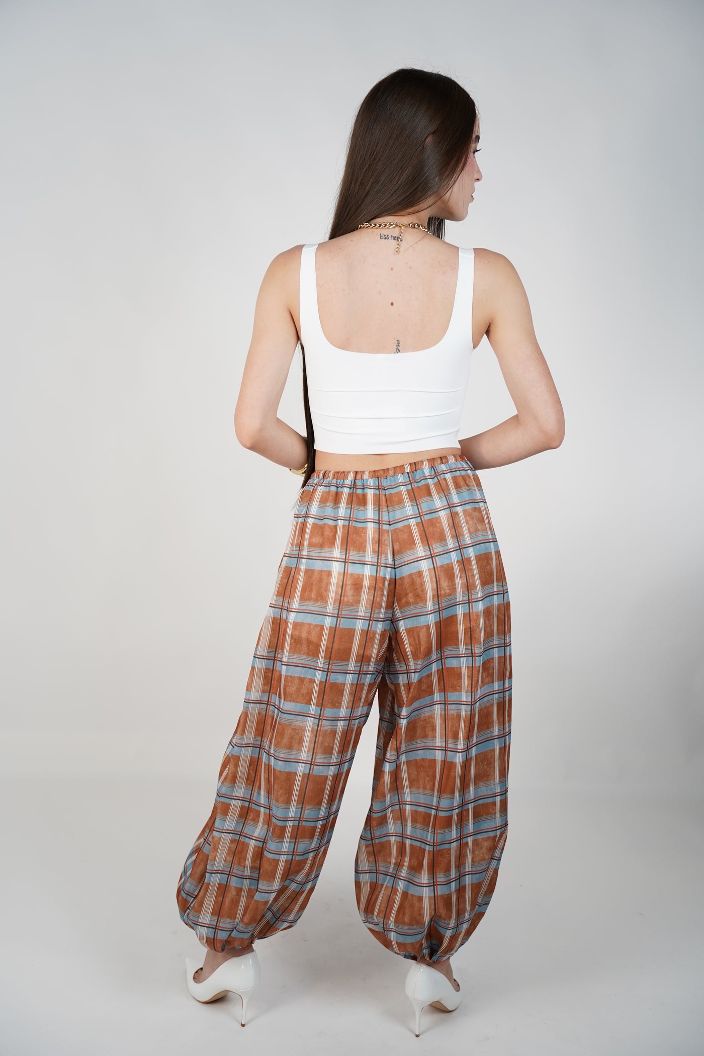 Shop the Syra Plaid Aladdin Pants – relaxed balloon trousers with a boho plaid print, adjustable waist, and cinched ankles. Effortless statement comfort.