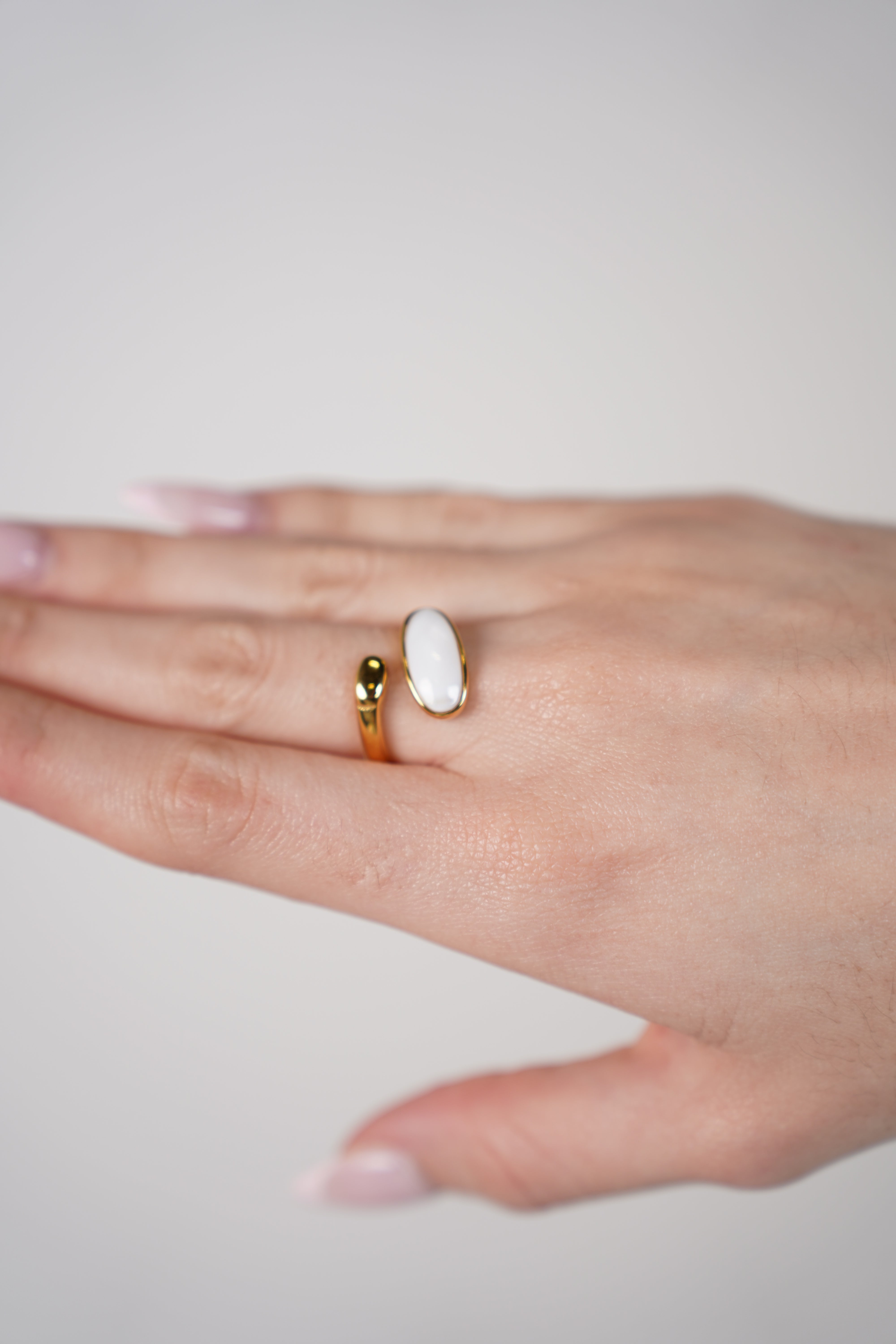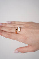Anillo Yalina – anillo de banda abierta dorada con acento de piedra ovalada blanca lisa en la mano del modelo