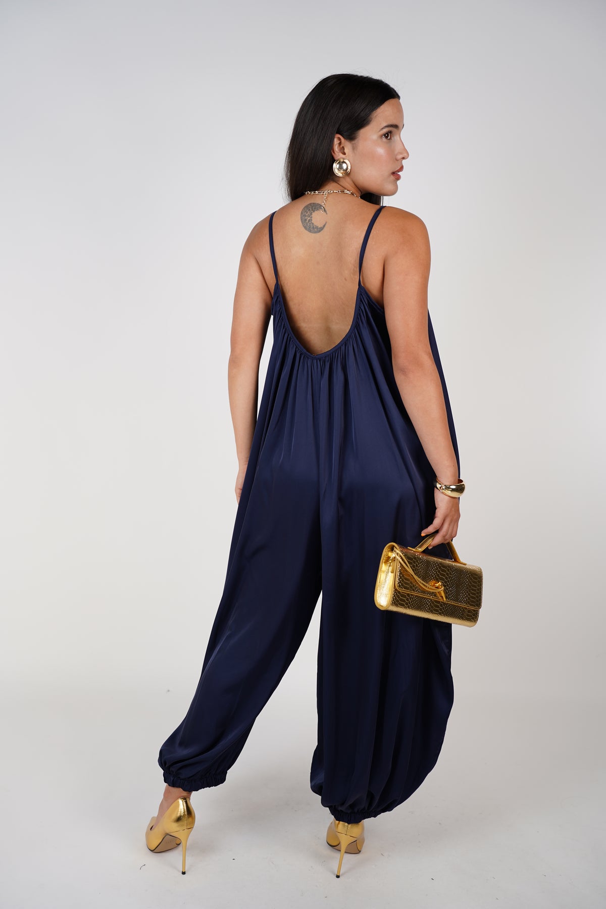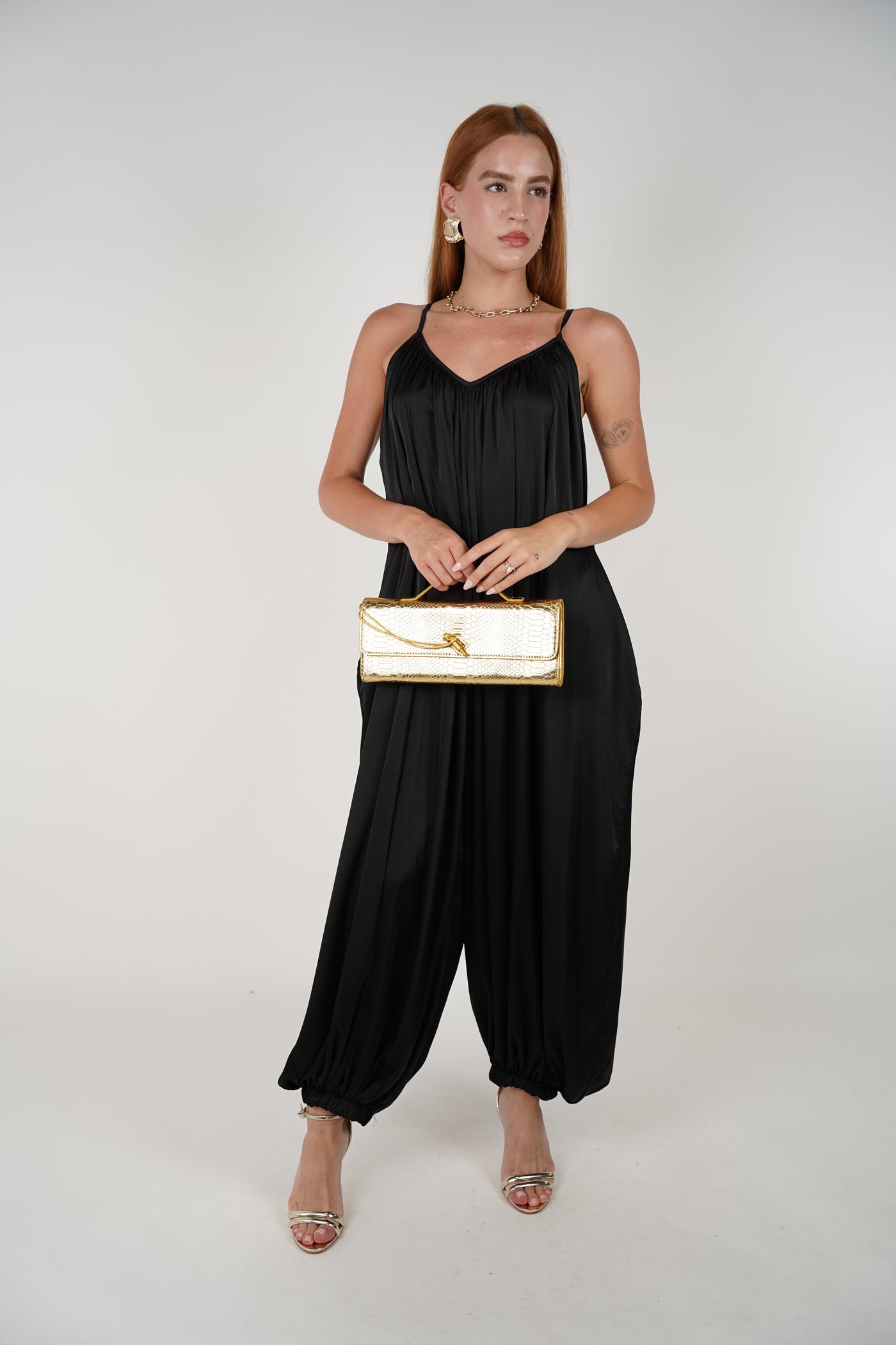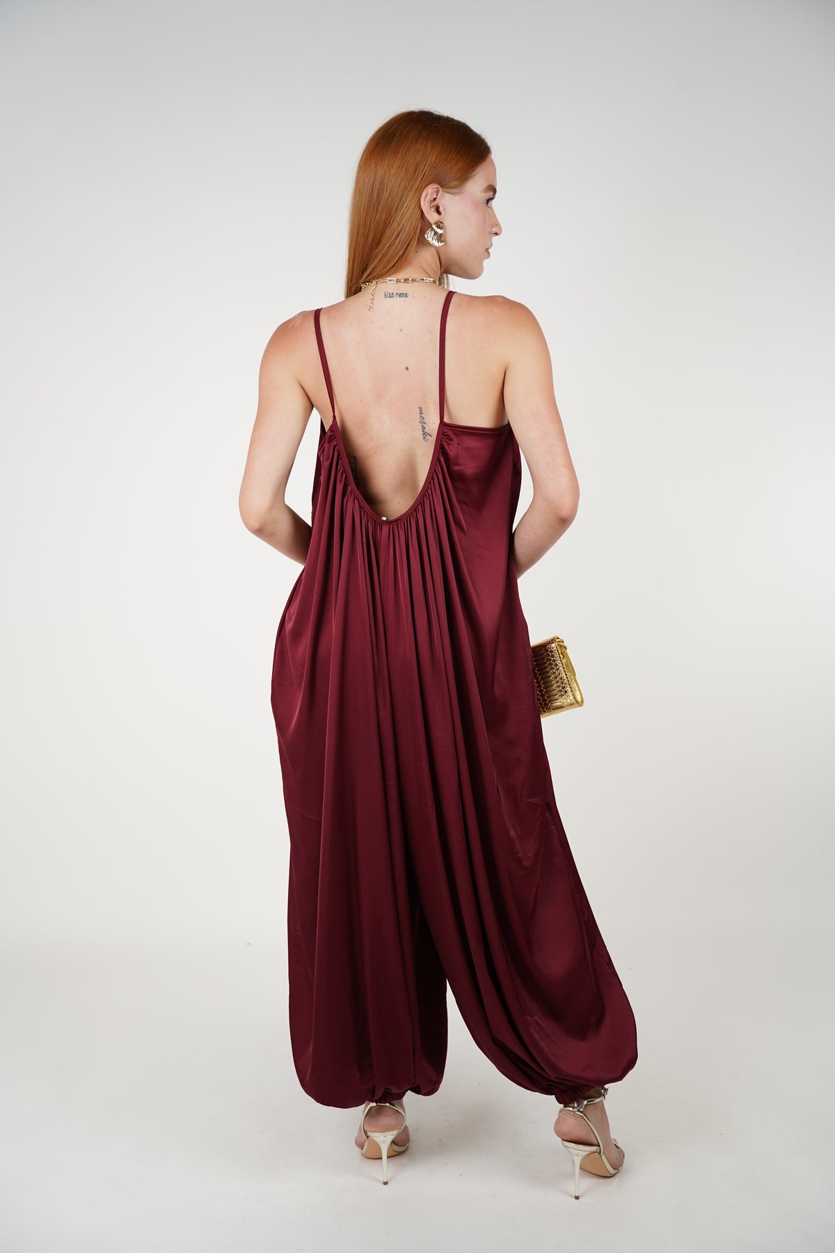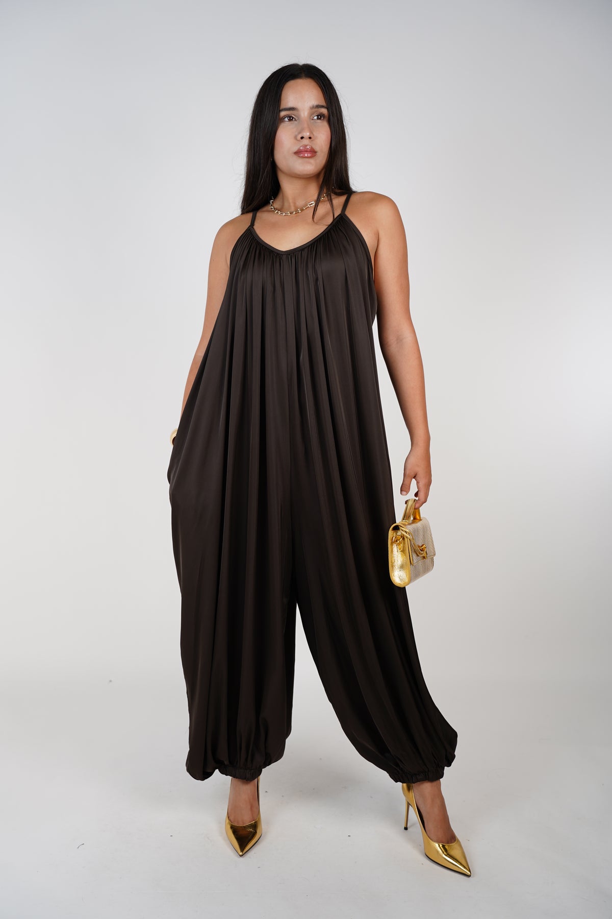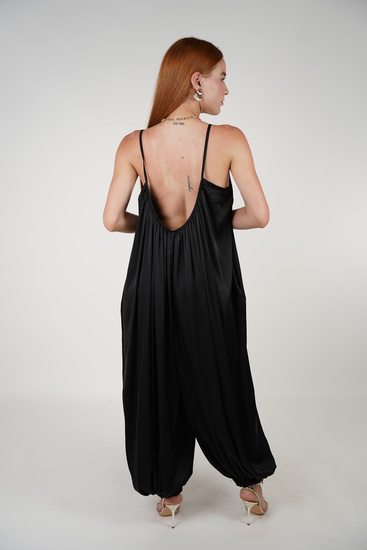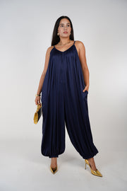 A flowy satin jumpsuit with a loose harem-style silhouette and gathered ankle cuffs. Chic, comfortable, and available in multiple colors.