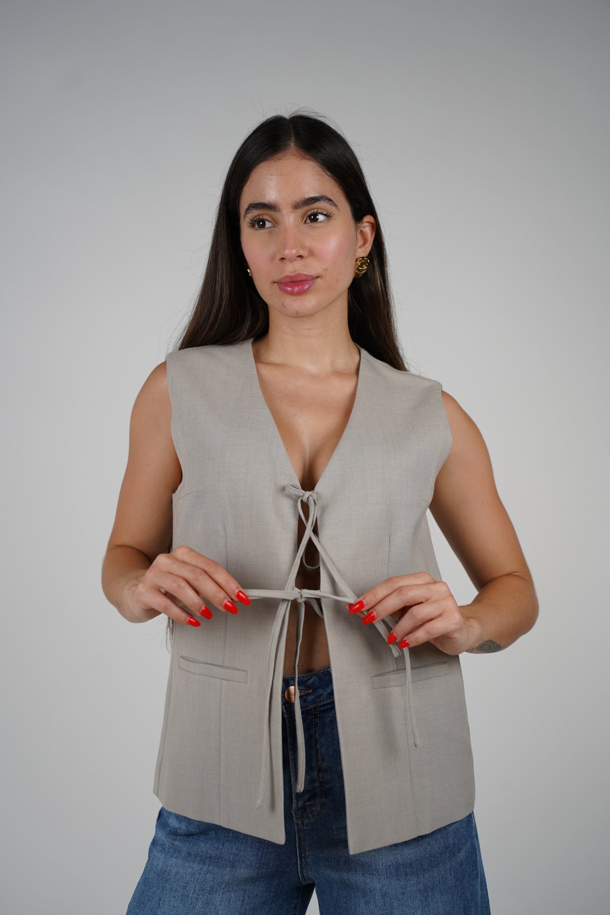 El chaleco es un elemento básico y elegante para tu guardarropa. Presenta un escote en V favorecedor y cierres con lazo en la parte delantera para mayor estilo.