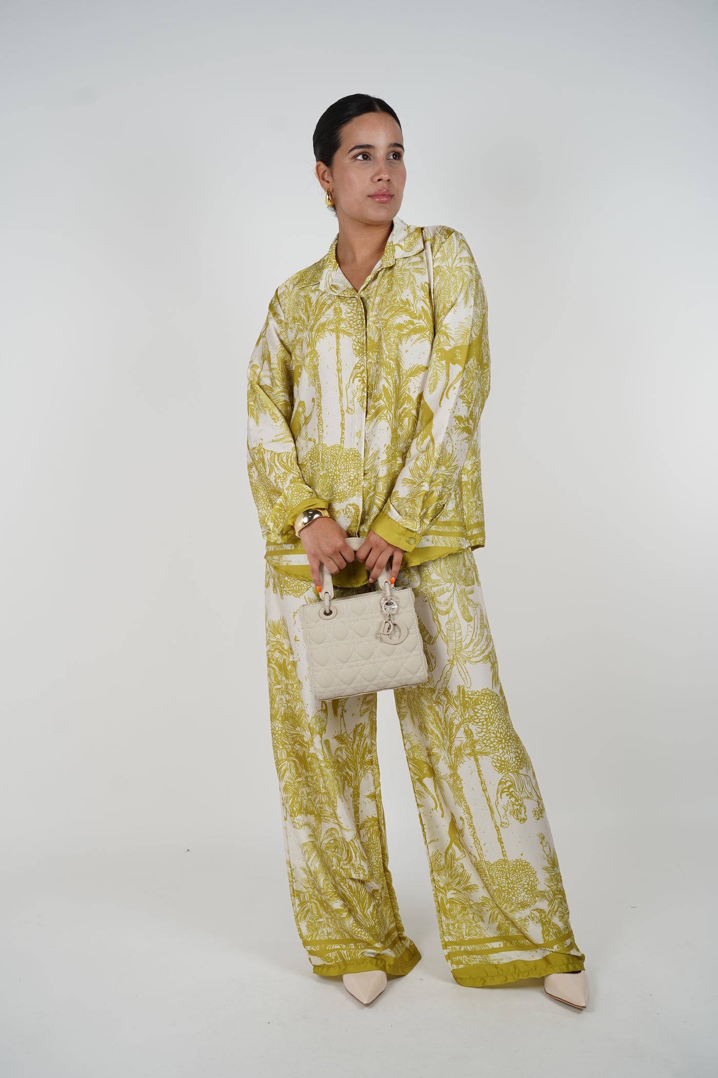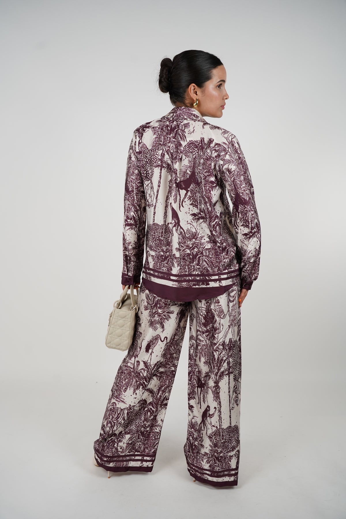Shop the Zelyn Silk Pants Set featuring a silky button-up top and wide-leg pants in a nature-inspired print. Available in other colors for versatile luxury.