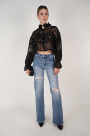 Model is 5'7", styled with a black lace top and pointed heels for a chic day-to-night look.