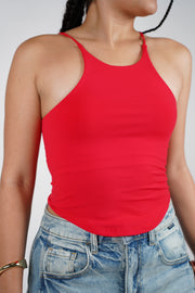 Meta Title: Zova Spaghetti Strap Crop Top – Stretchy Red Swoop Hem Tank