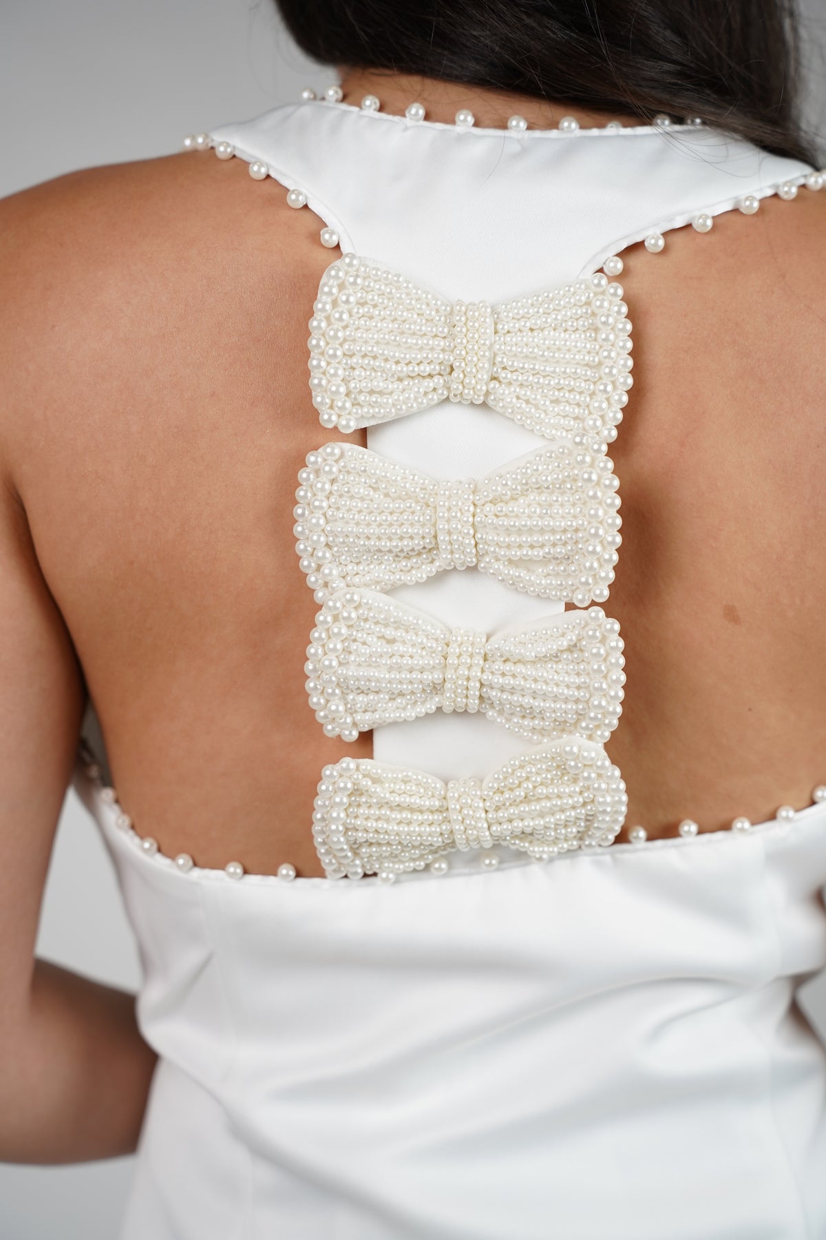 Alt text: Woman wearing white satin mini dress with open back and four pearl-embellished bows.