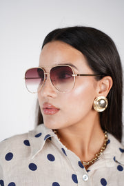 Model wears the gradient rose-tinted lenses with gold frame, paired with bold gold earrings and a linen polka dot set.