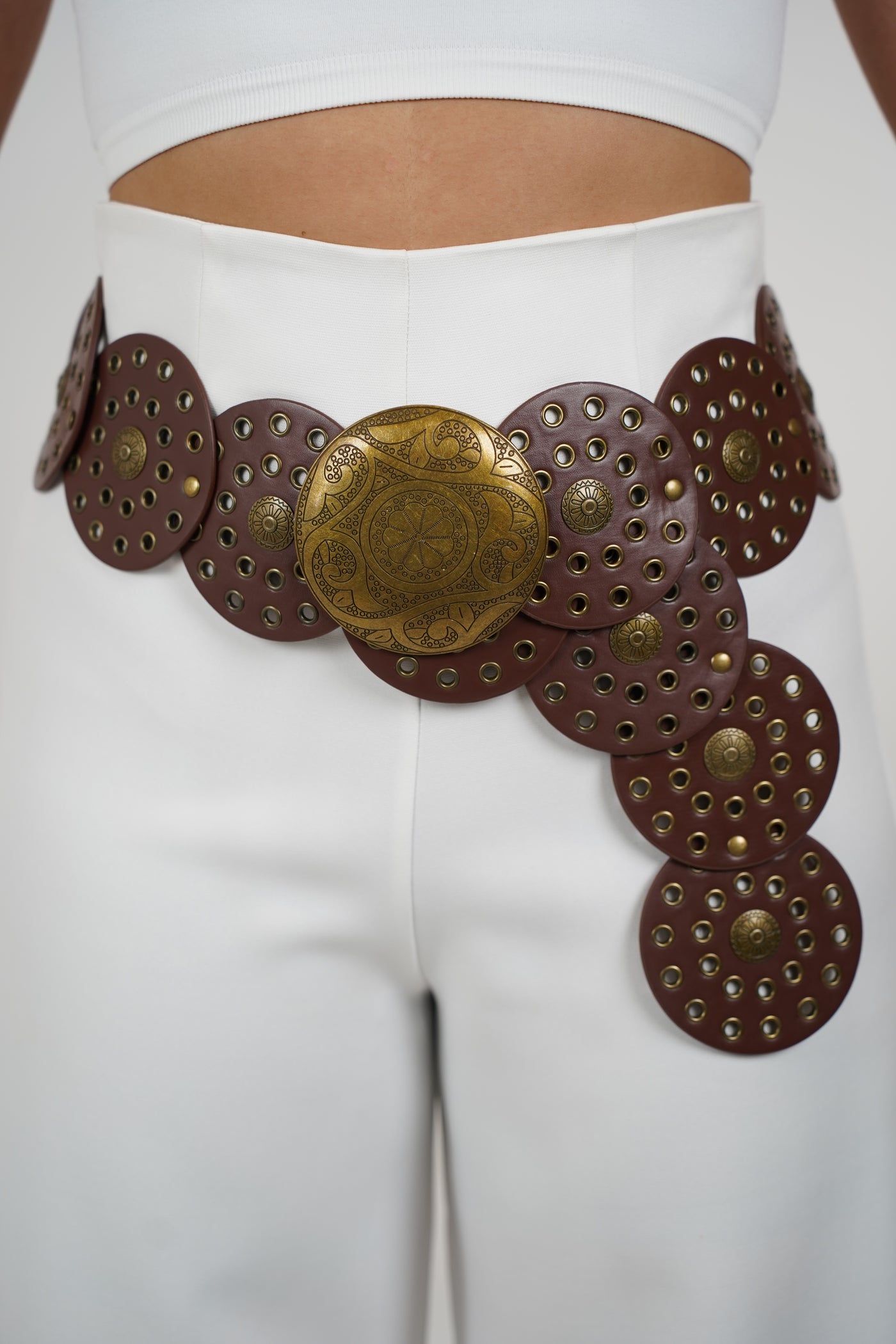 A striking statement belt with oversized discs and antique gold detailing, perfect for turning any outfit into a showstopper.