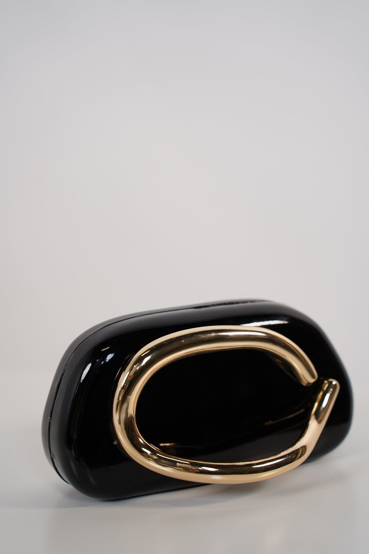 Bellora shiny black clutch with sculpted design and gold metallic accent