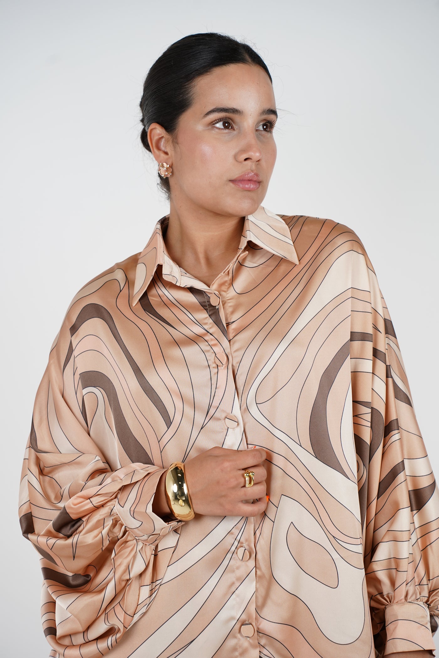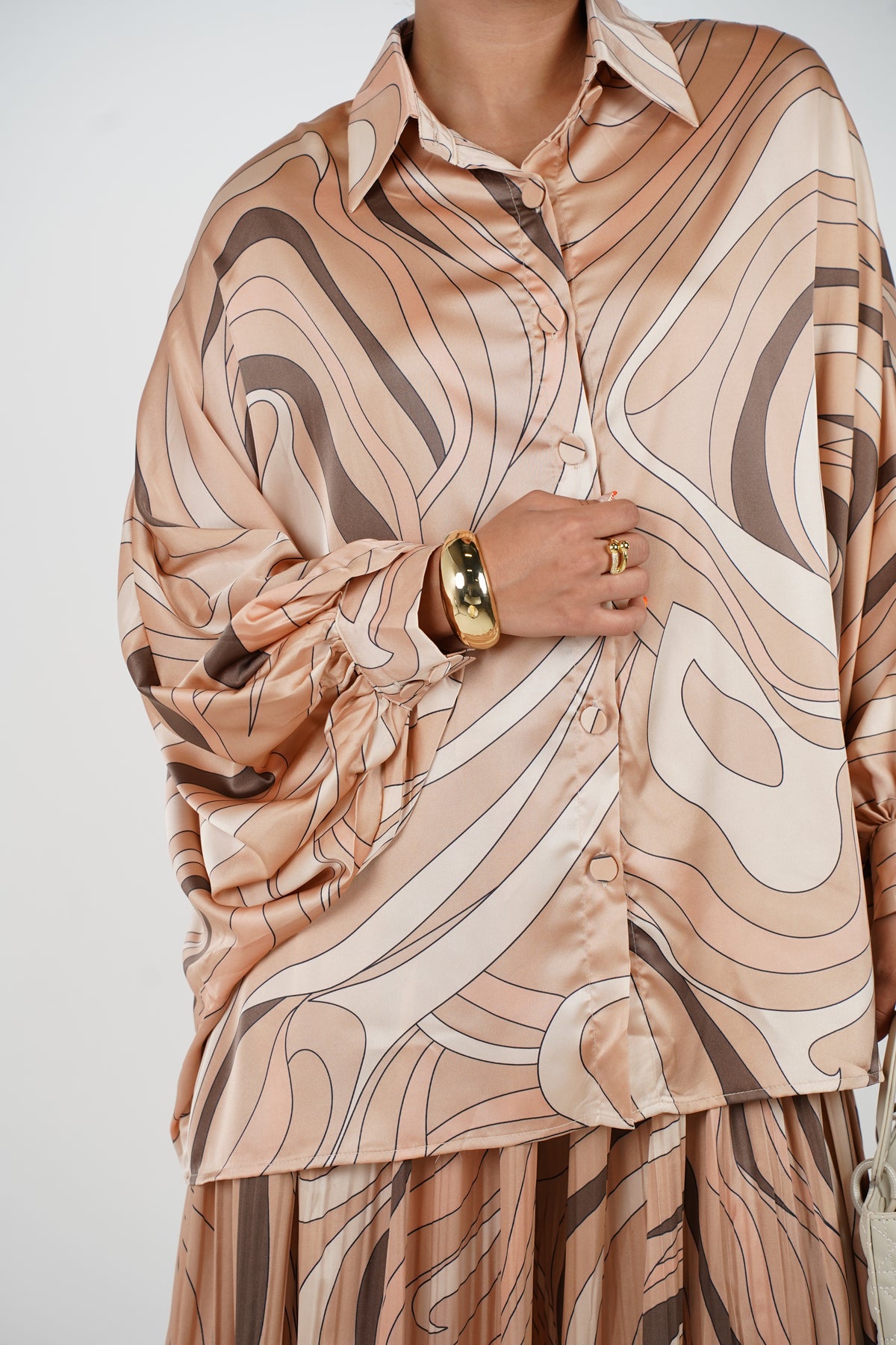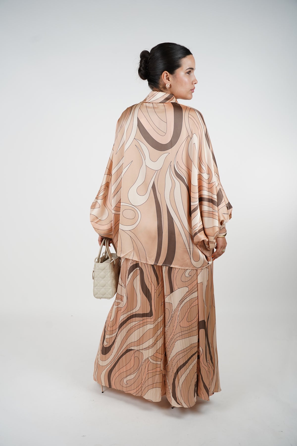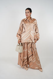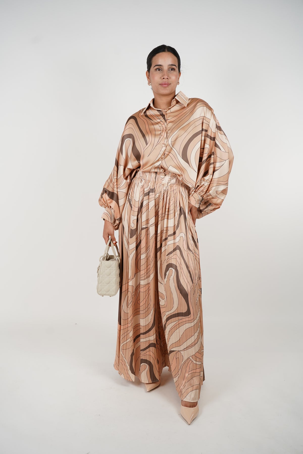 The Calira Stamped Pants Set offers effortless elegance with its fluid, artistic print and relaxed silhouette. Crafted in a silky, draping fabric, it features a button-down oversized shirt with wide sleeves and matching wide-leg pleated pants for an elevated, comfortable look. Perfect for vacation, brunch, or stylish lounging.