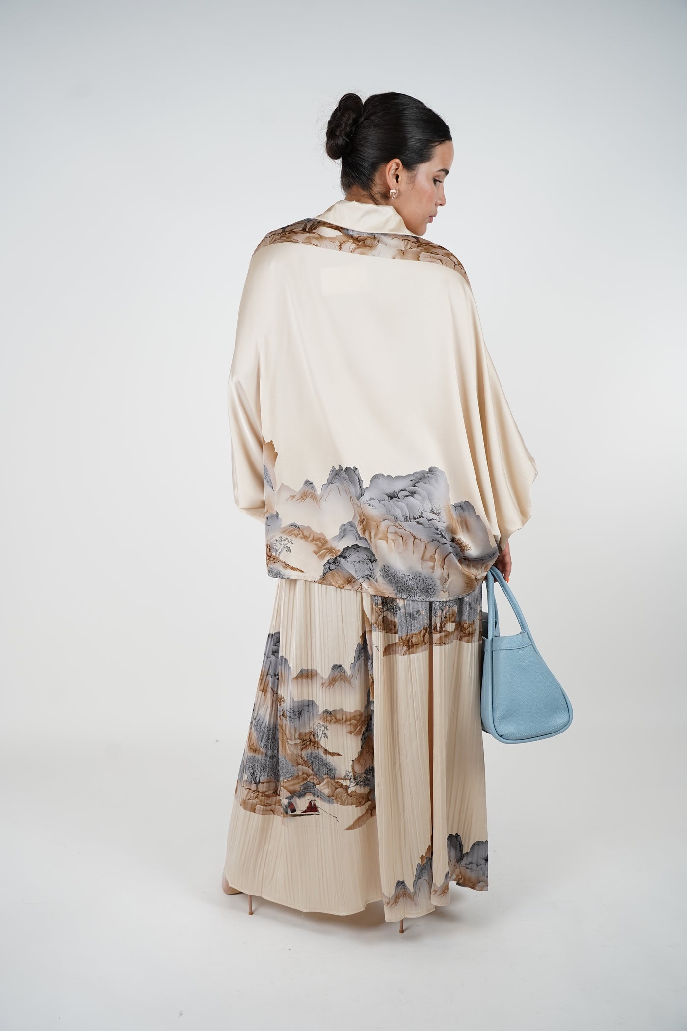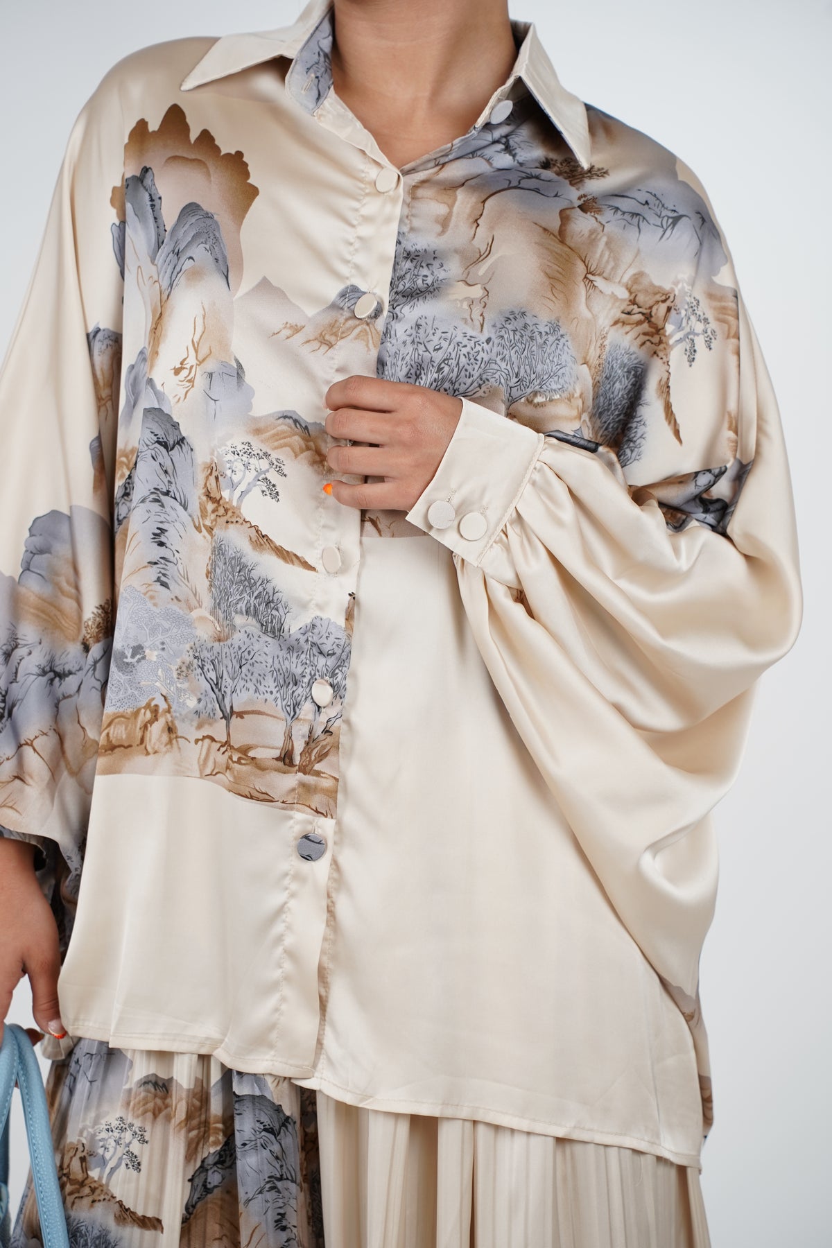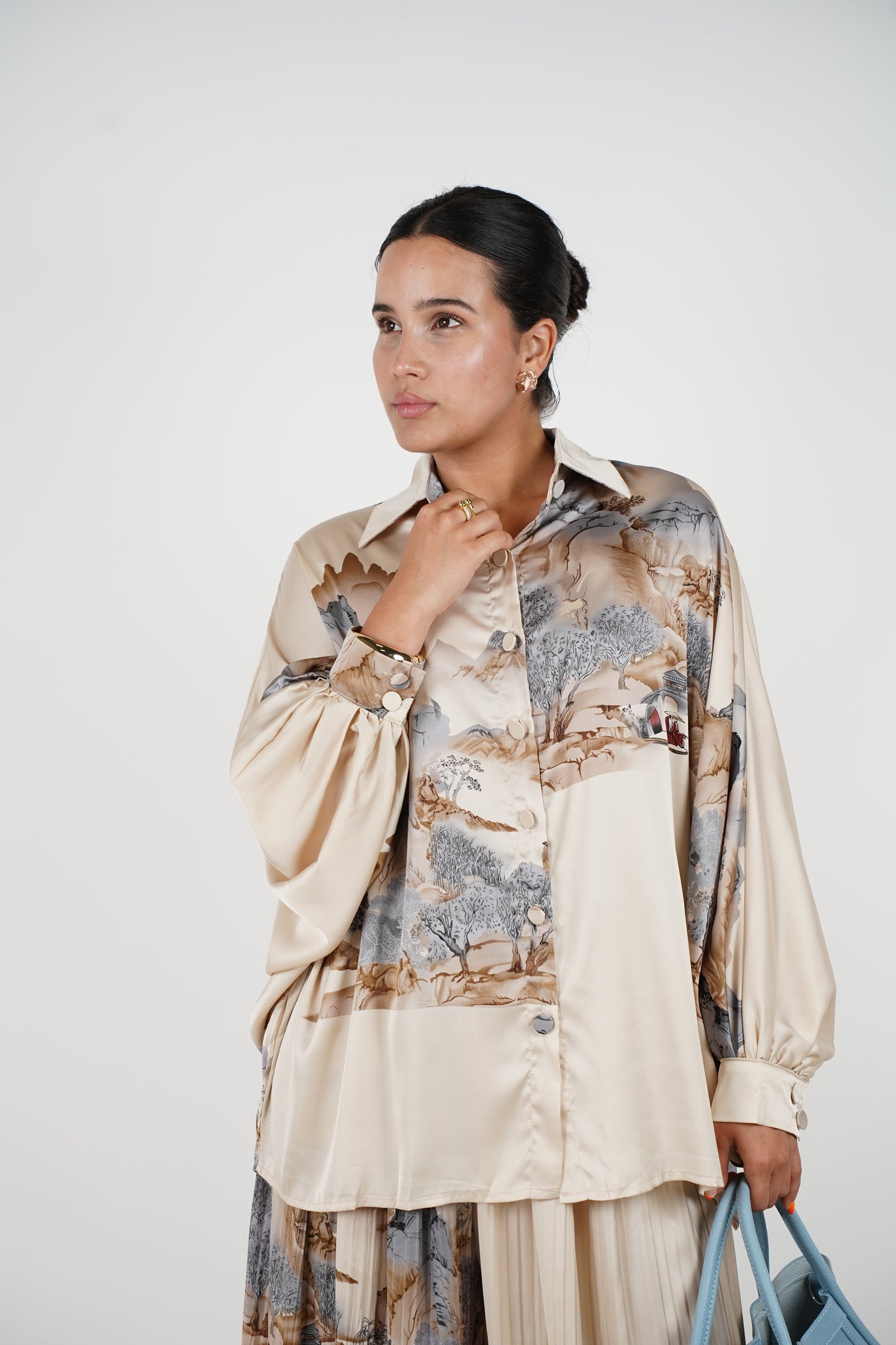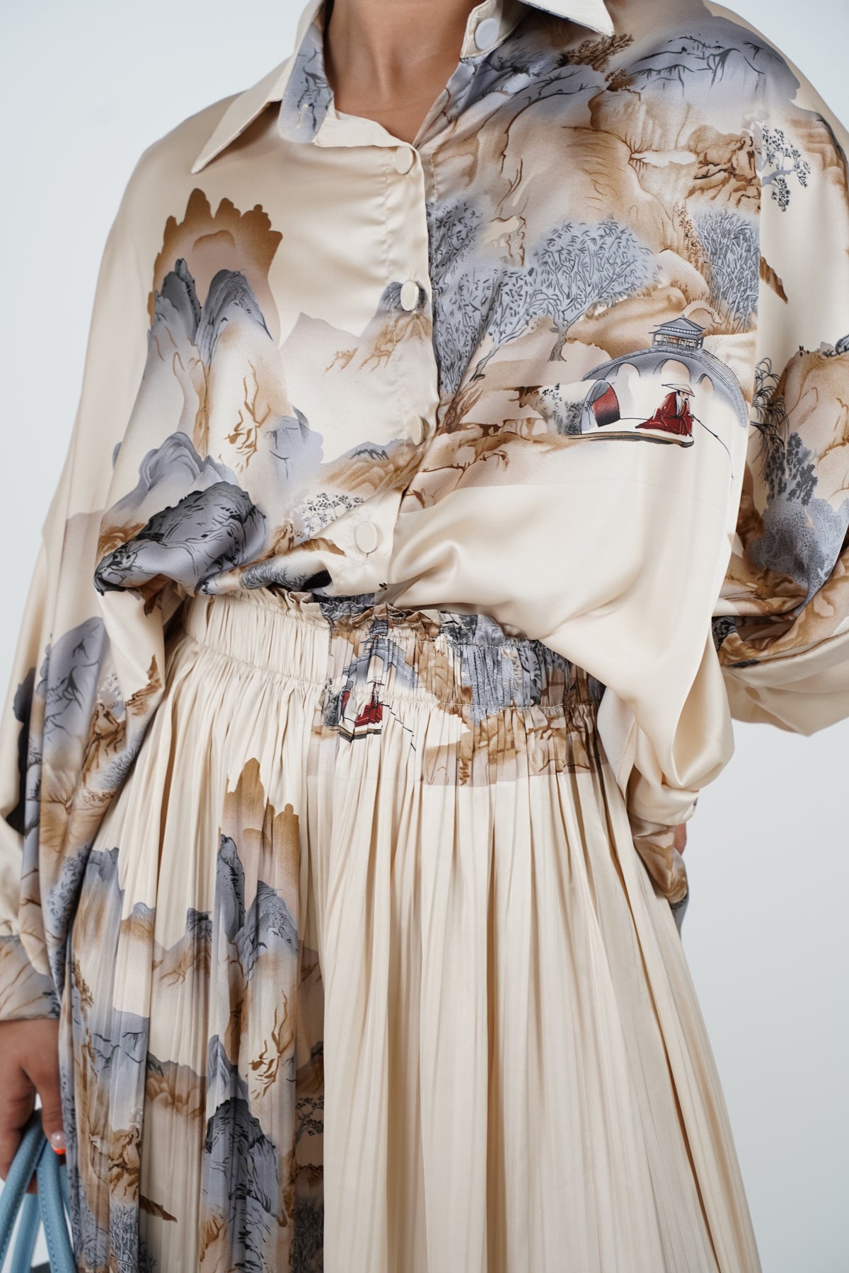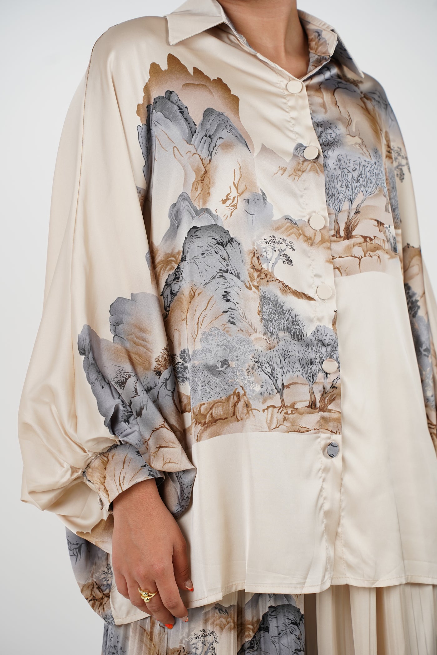 Model wearing a neutral-toned artistic print two-piece set with oversized button-down shirt and wide-leg pleated pants, styled with nude pointed heels and a cream handbag.