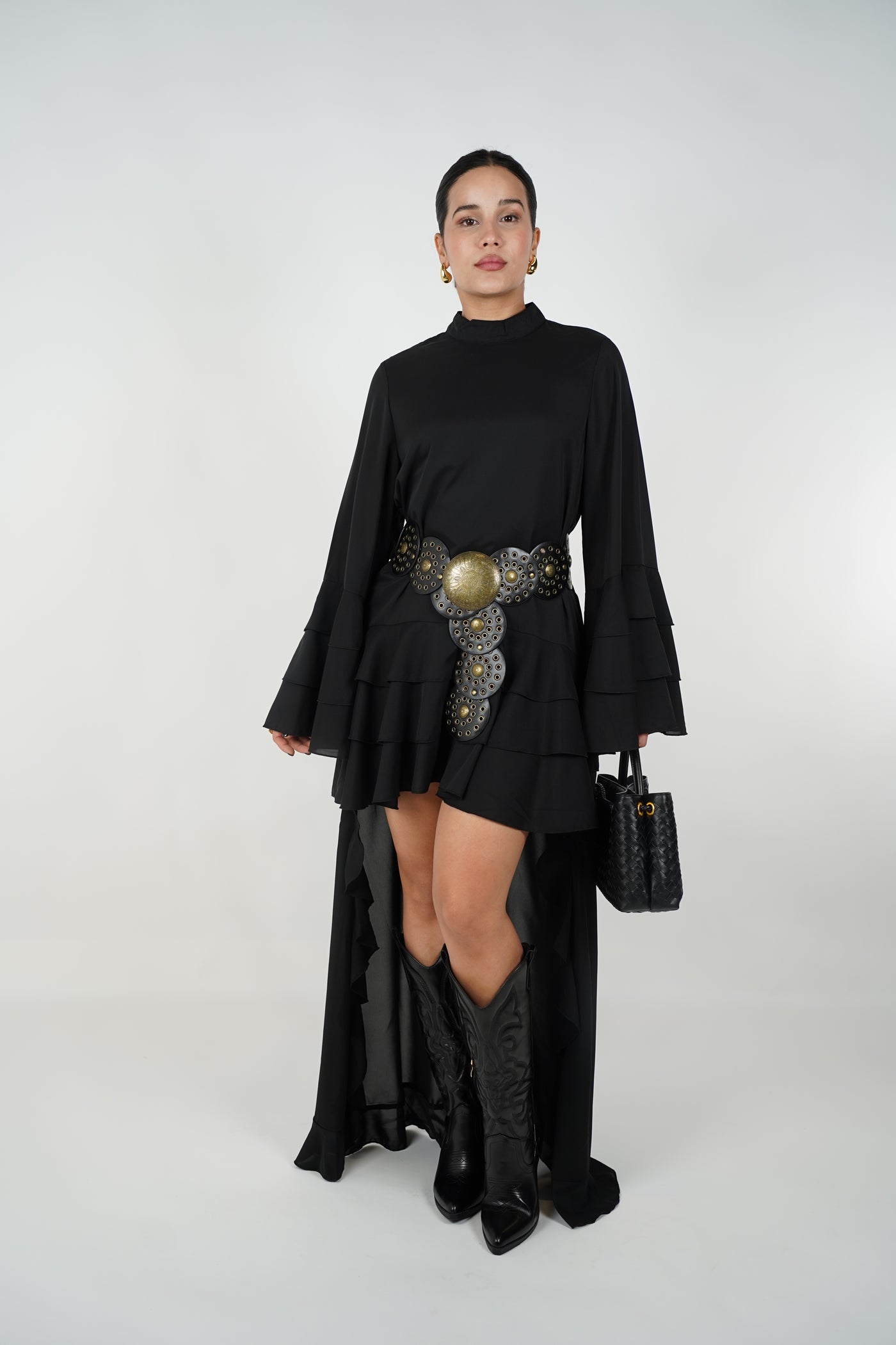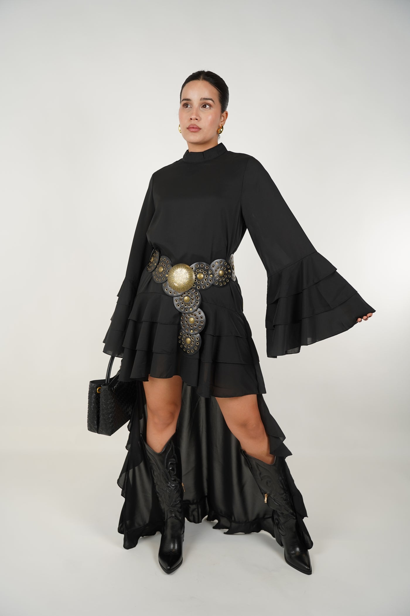 The Country Girl Maxi Dress brings effortless sophistication with a touch of rustic charm. Featuring layered ruffle bell sleeves and a cascading high-low hemline, this piece captures movement and romance in every step. Perfectly accented with a bold waist belt, this dress transitions seamlessly from chic daytime outings to elevated evening occasions. Pair it with boots for a true western vibe or style it with heels and statement jewelry for a refined, fashion-forward look.