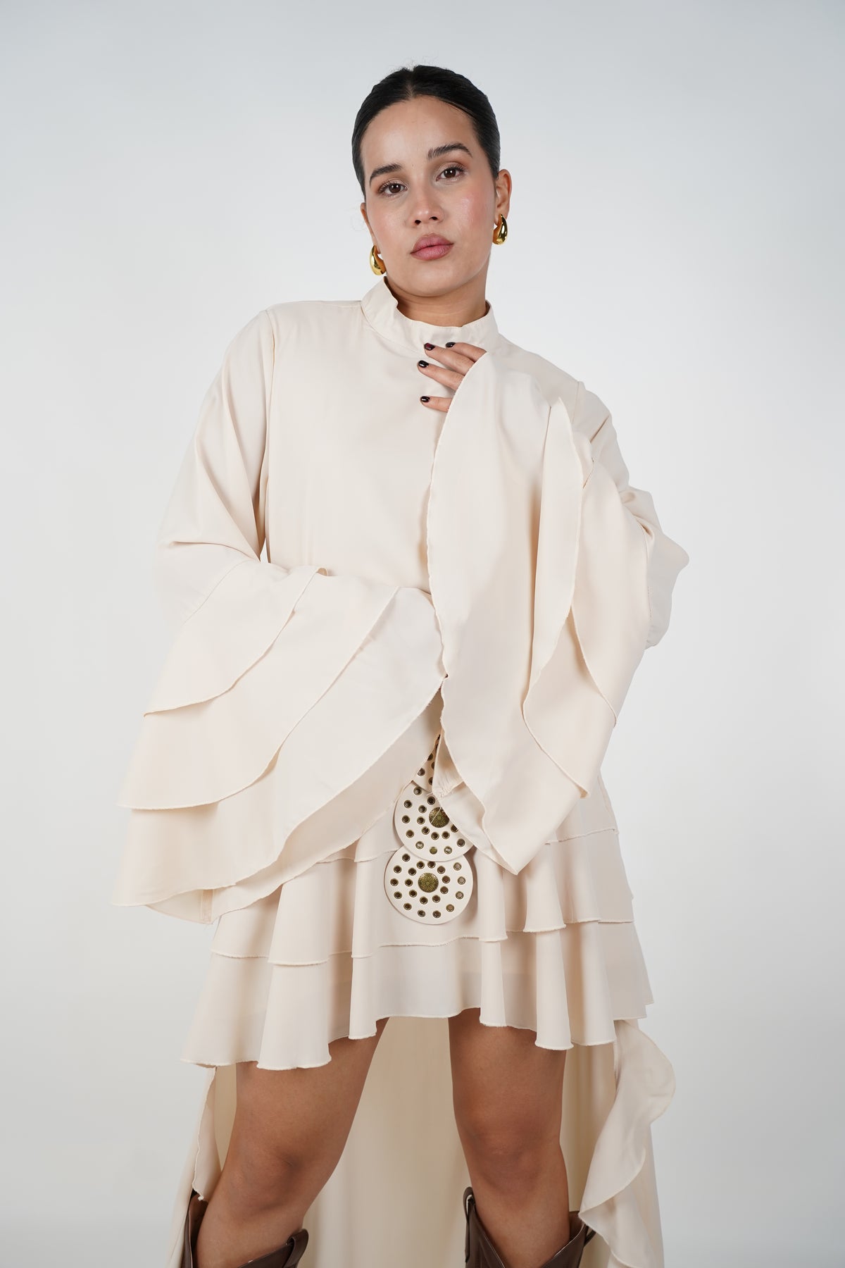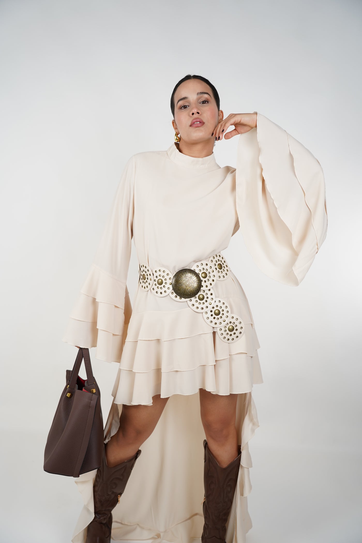 Woman wearing cream ruffle high-low maxi dress with bell sleeves, styled with western boots and statement belt.