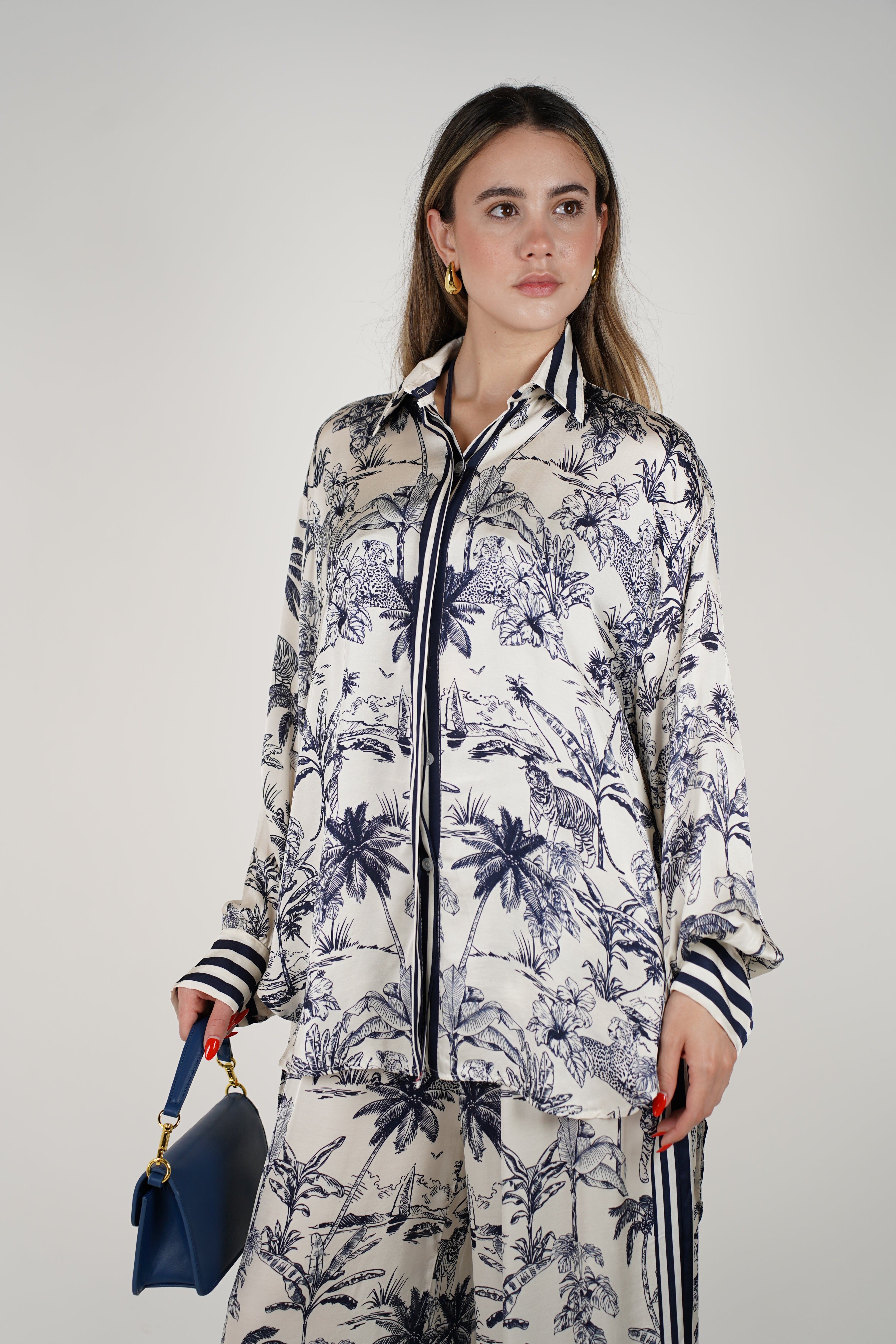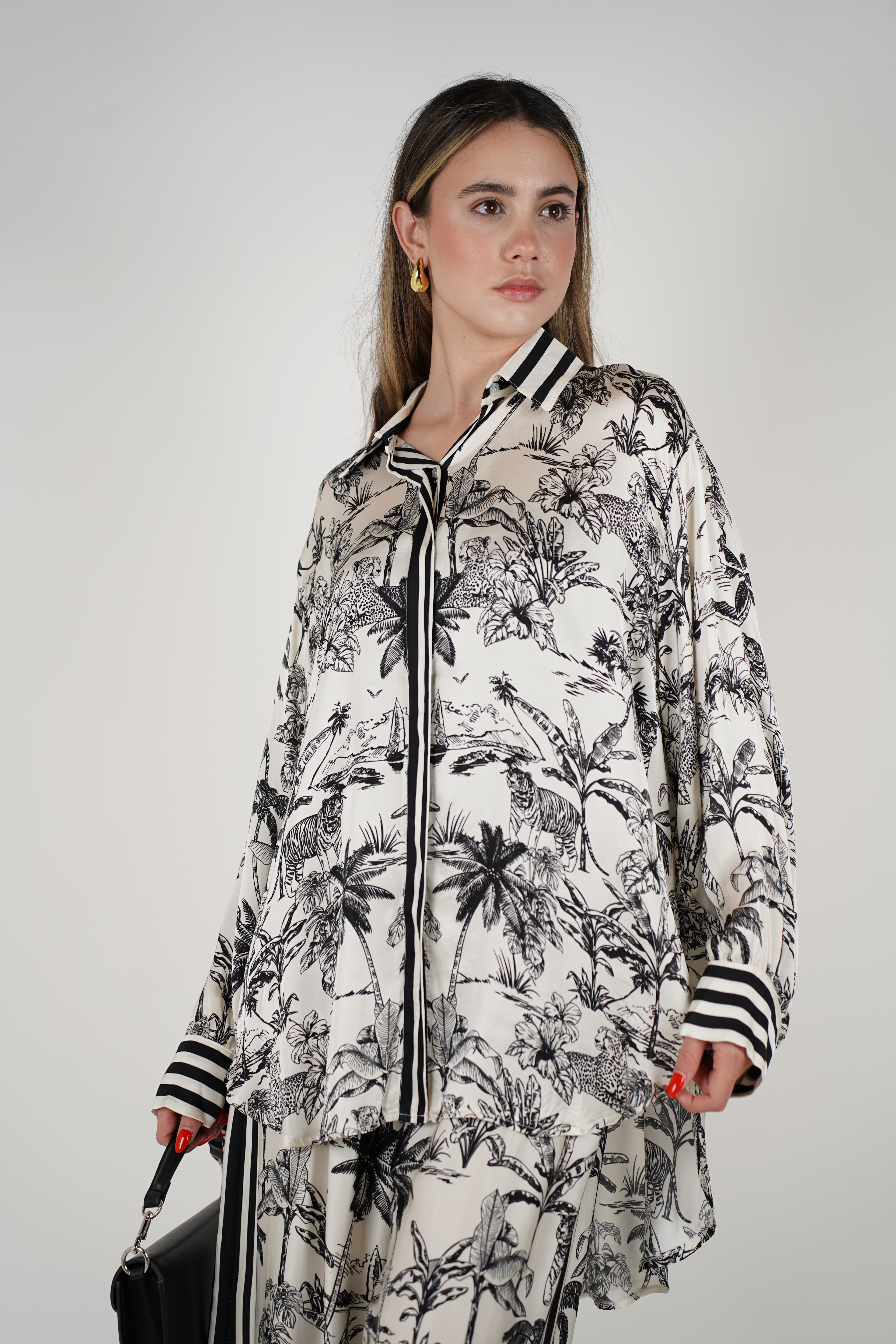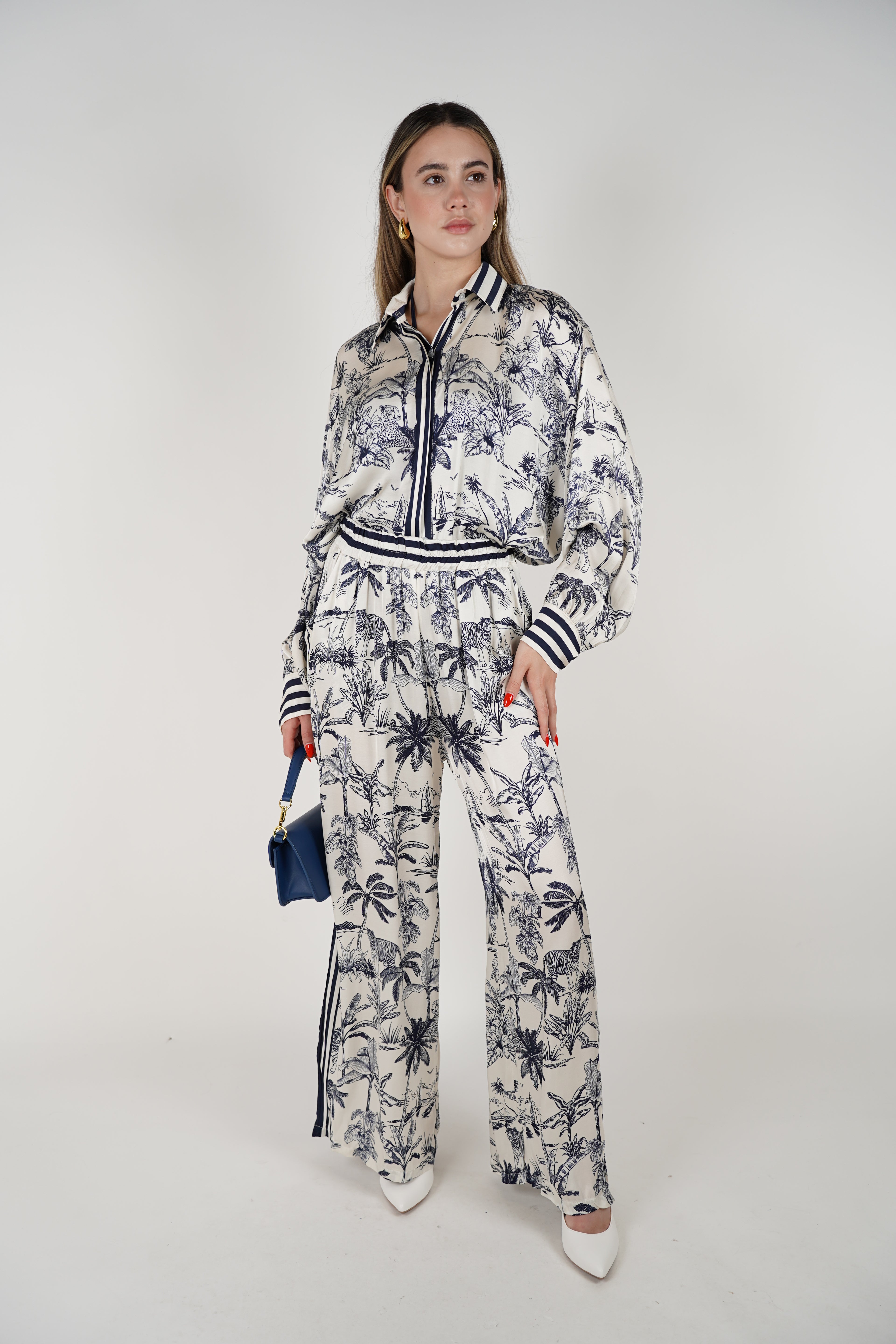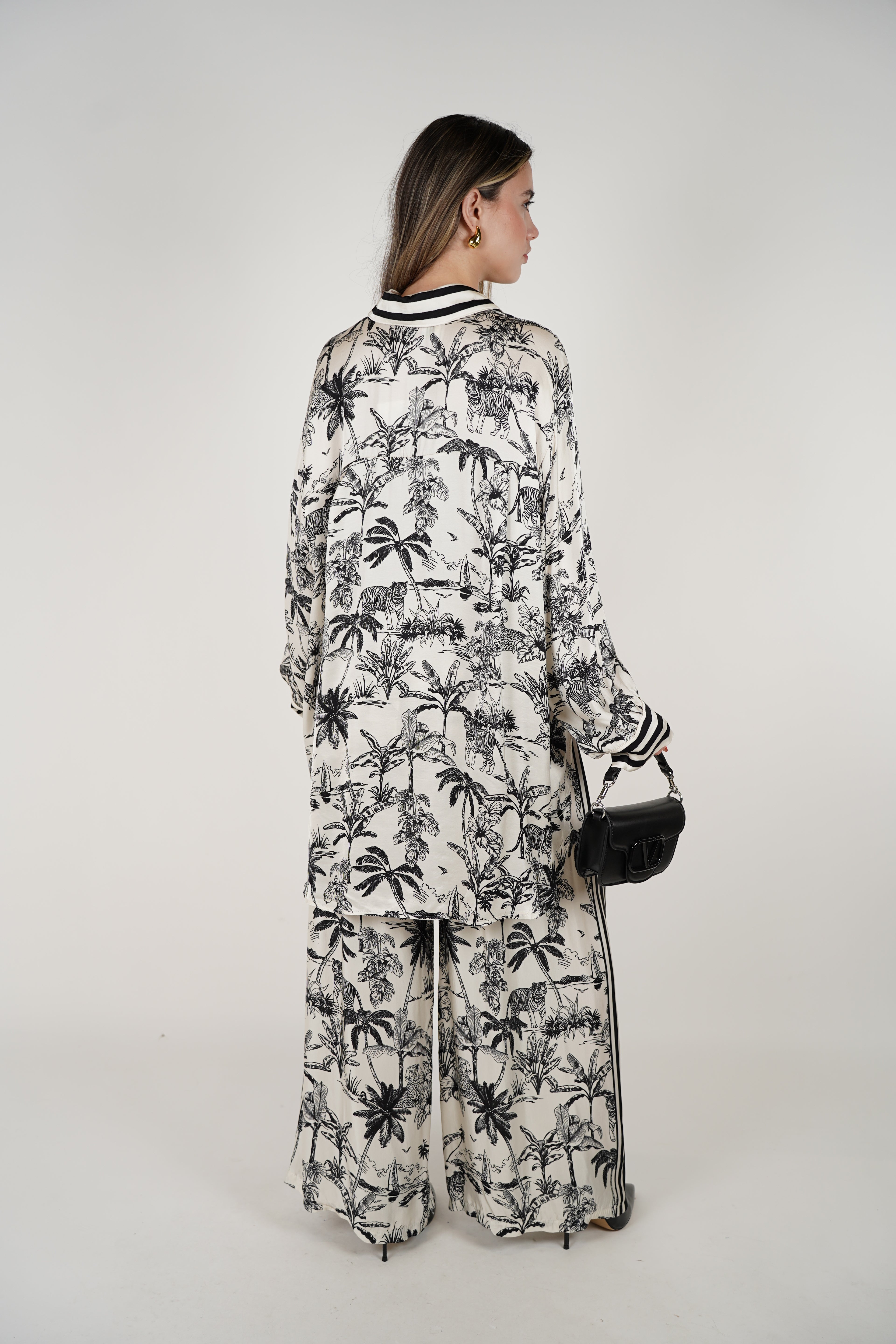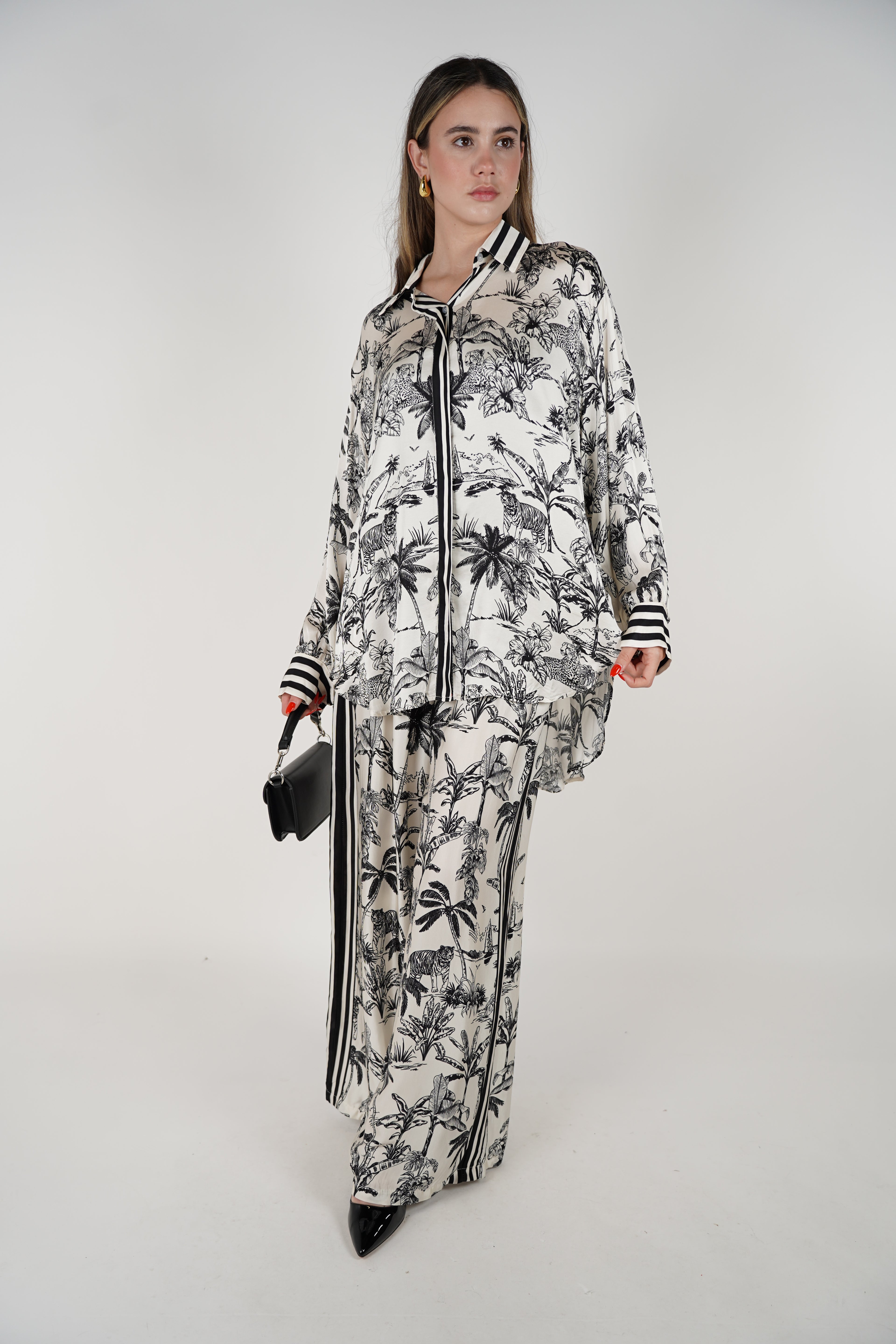 Black-and-white jungle print silk pants set with striped trim, button-up top, and relaxed wide-leg pants.