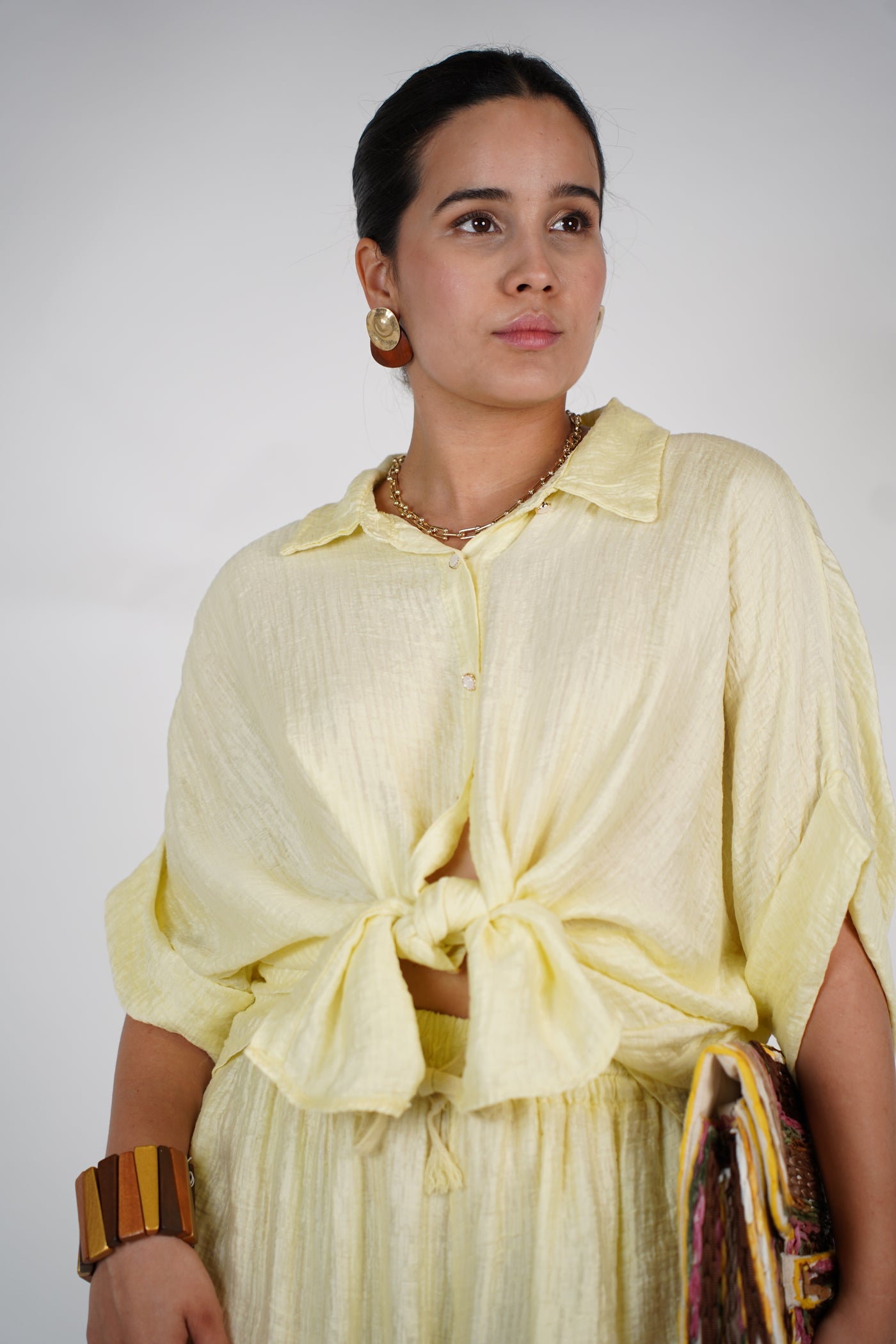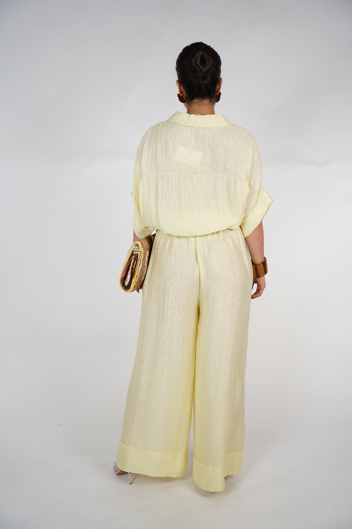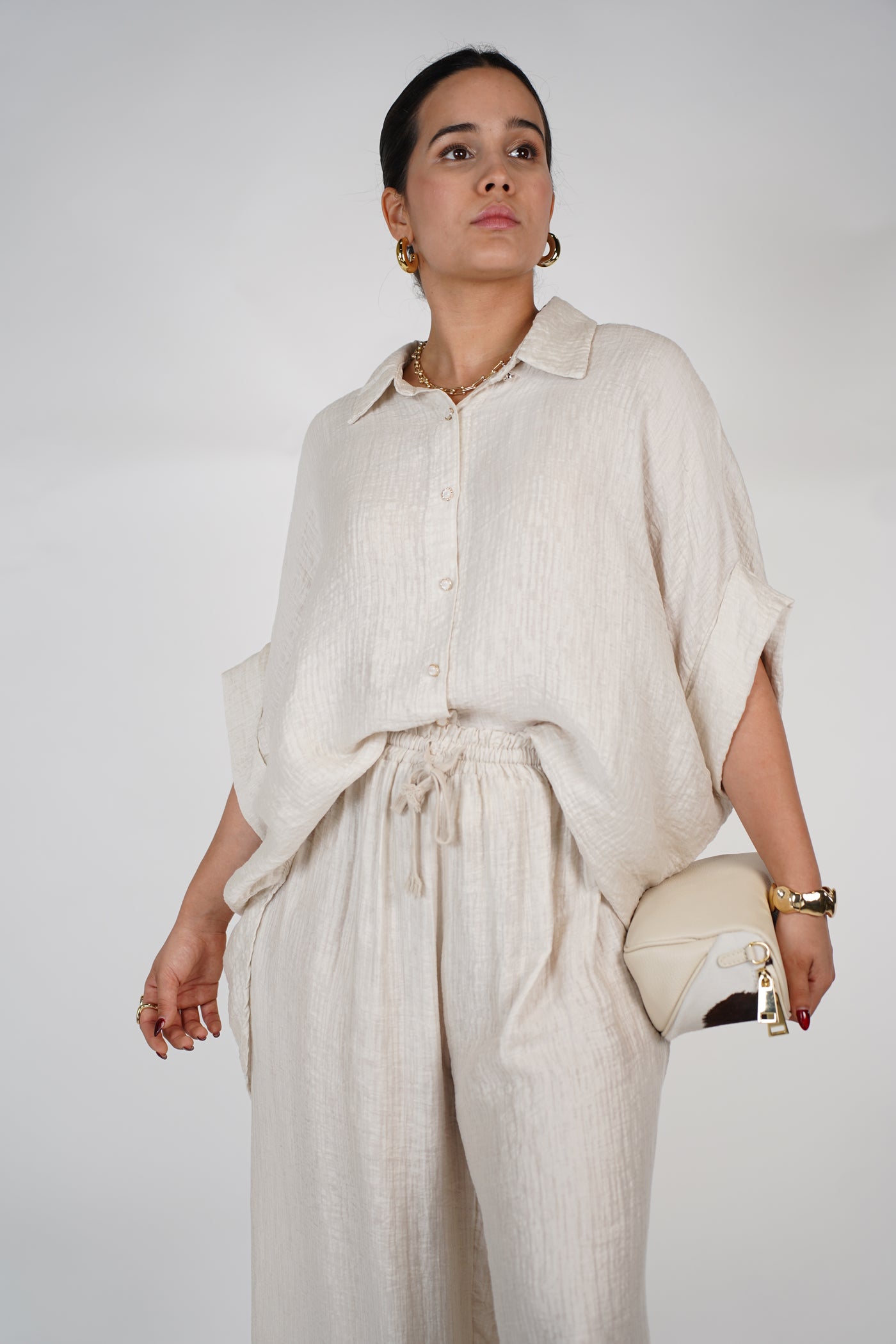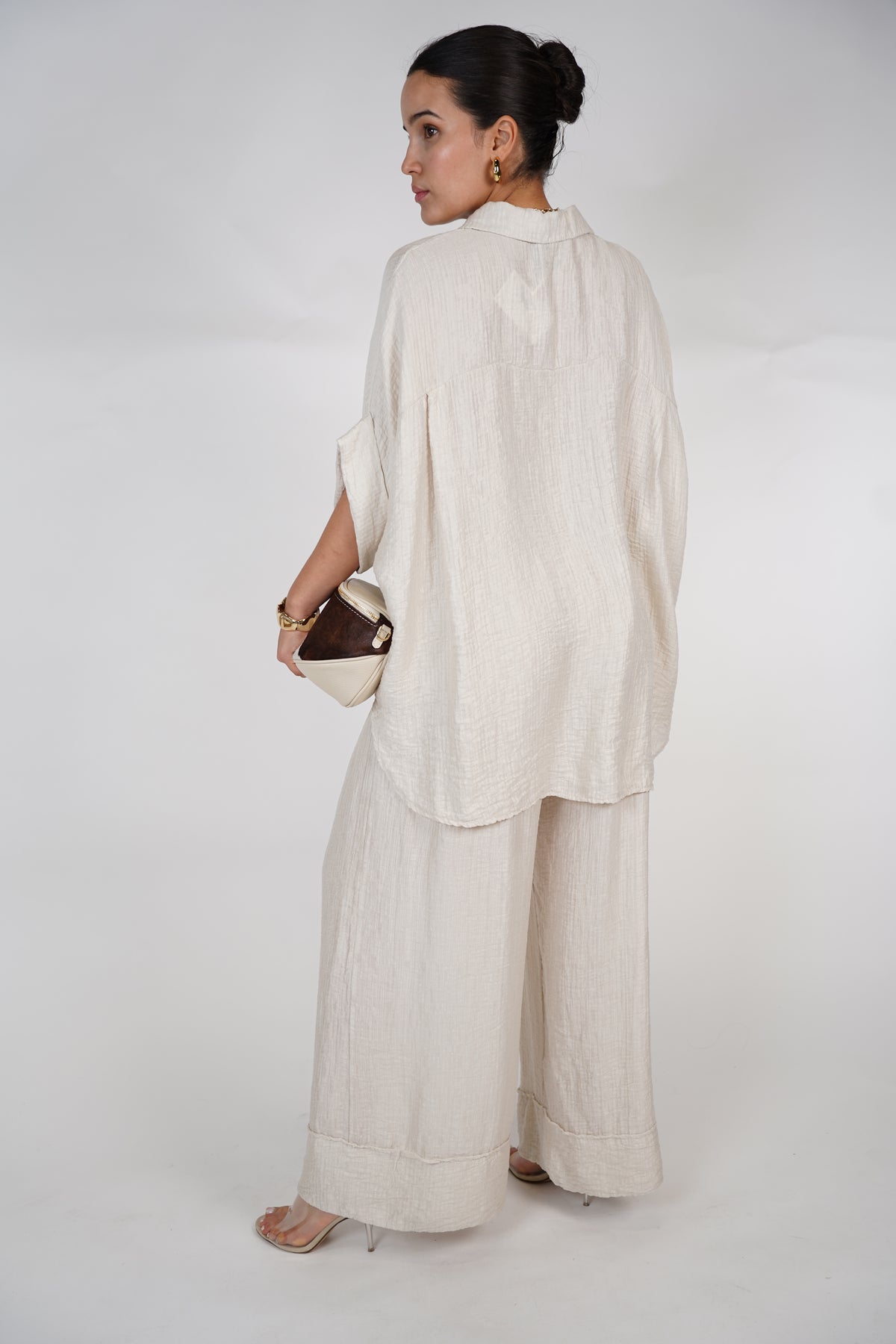 Model wearing cream oversized pants set with button-down top and wide-leg trousers, styled with clear heels and a cowhide clutch