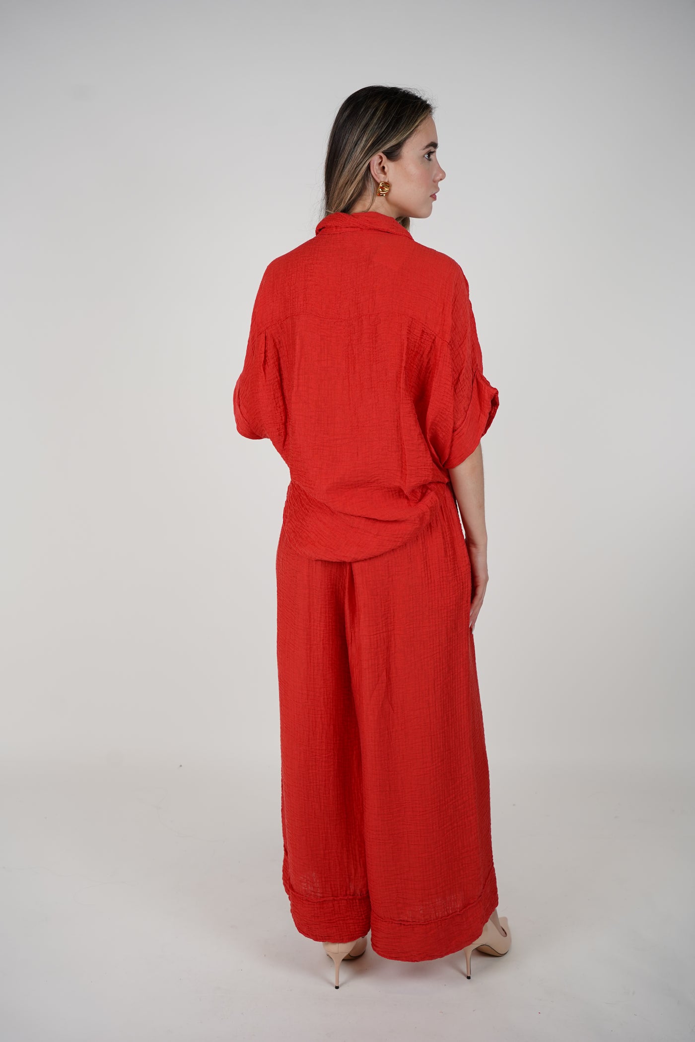 The Evelyn Oversized Pants Set is your go-to for chic, laid-back dressing. Crafted in a soft crinkle-textured fabric, this set includes a button-down oversized top with a collar and side-slit sleeves, paired with ultra-wide-leg pants that flow with every step. Designed in a versatile one-size fit, this set is available in multiple colorways to suit every mood and season. Dress it up with heels and a clutch or wear it casually with flats—Evelyn adapts to your lifestyle.