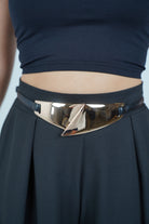 Model wearing the Firia Belt with a gold sculptural metal front and black faux leather back strap over black high-waisted trousers.