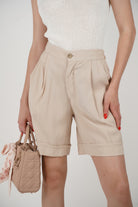 Woman wearing beige high-waisted pleated shorts with cuffed hems