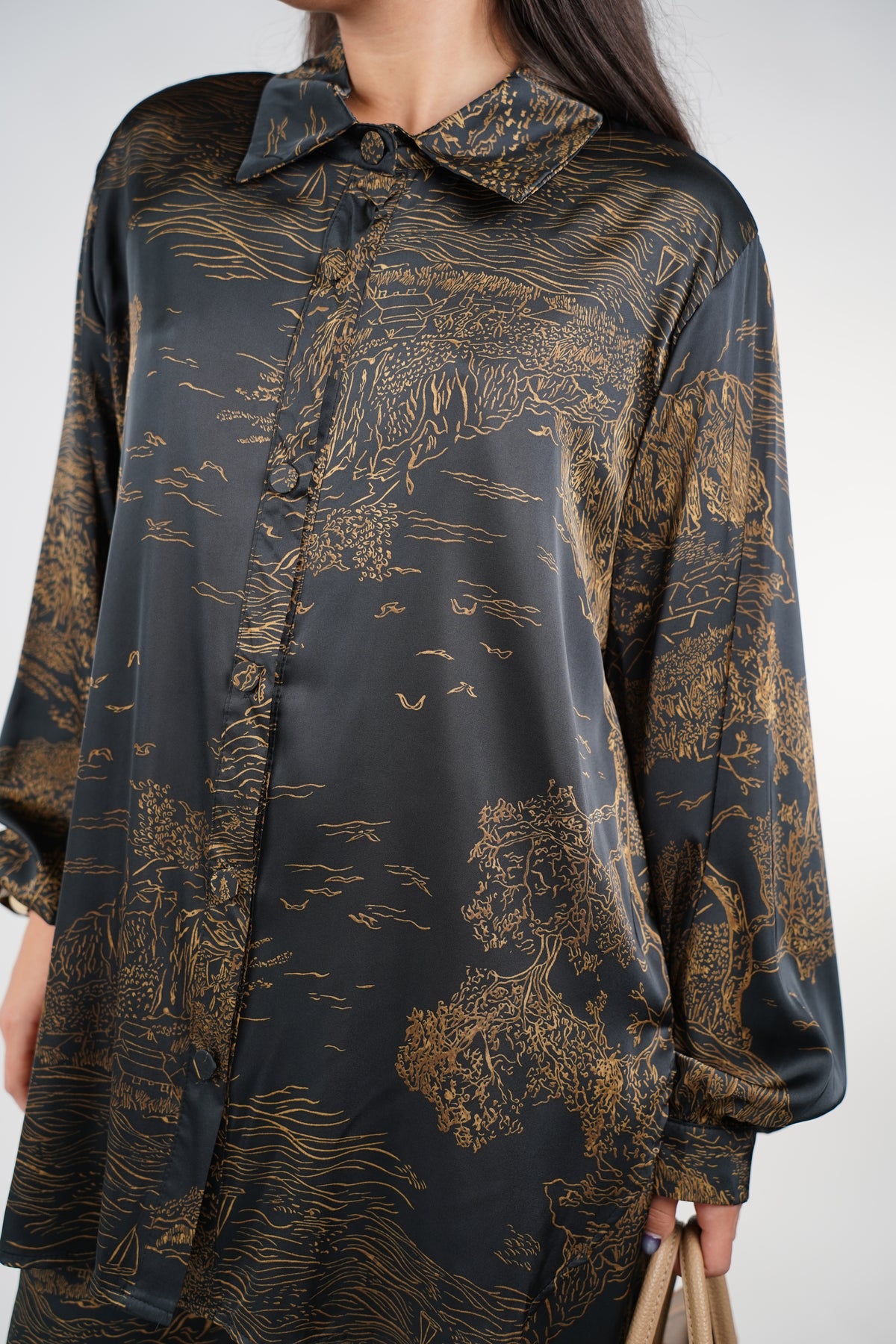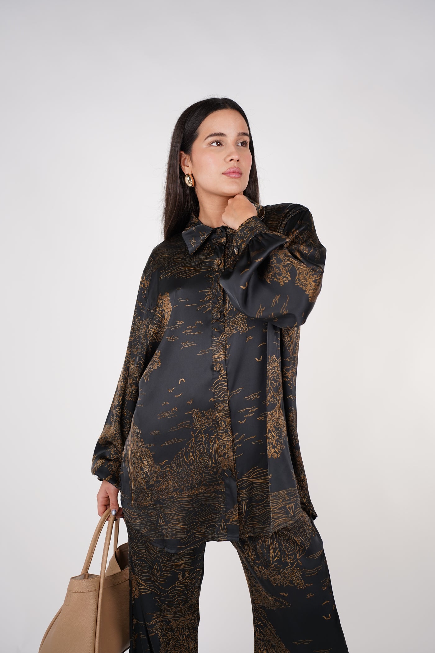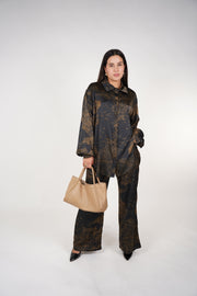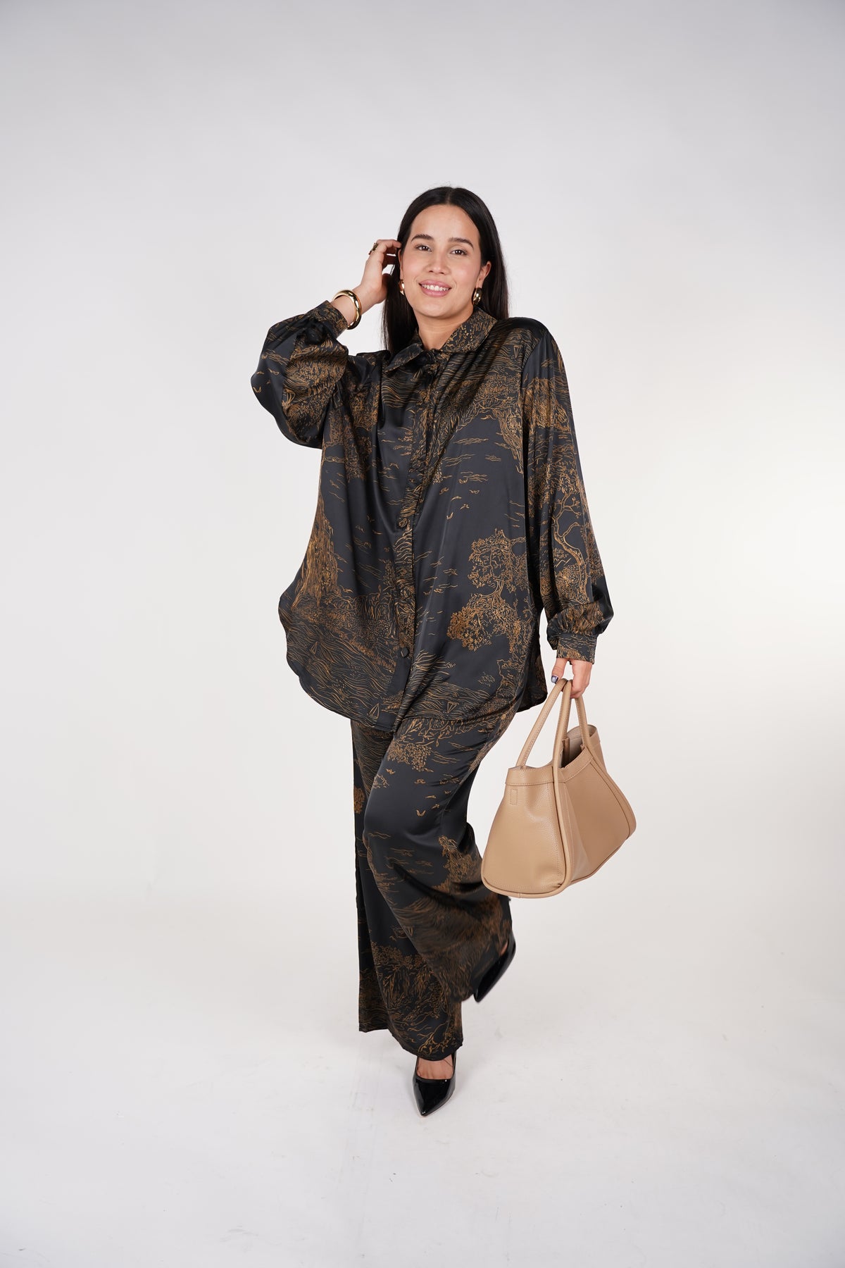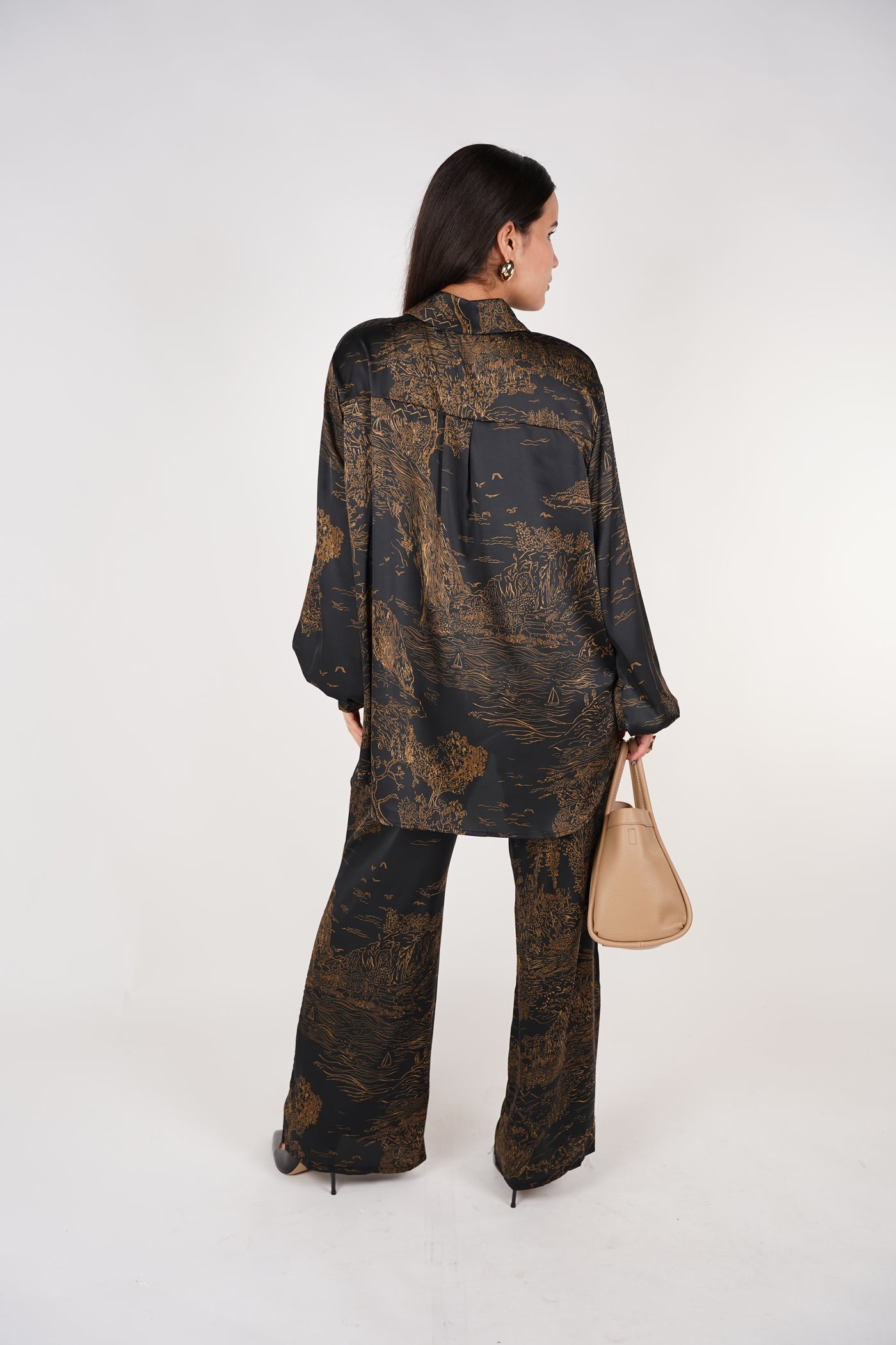 A silky, statement two-piece set featuring an elegant stamped print, relaxed tailoring, and a rich black-gold palette designed for elevated day-to-night style.
