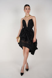 A striking black midi dress featuring a deep plunge neckline, asymmetrical hem, and sheer paneling for a sophisticated edge.