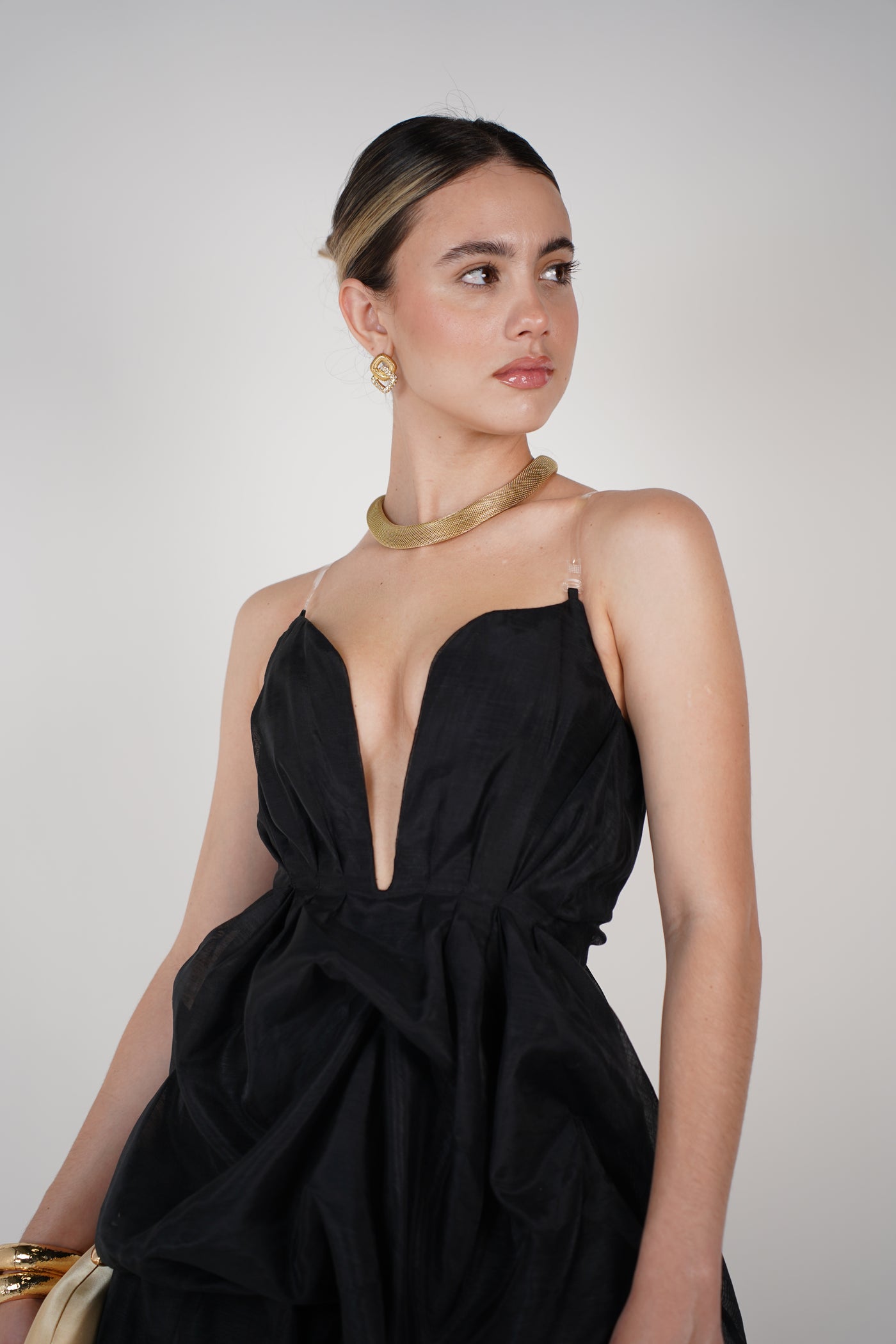 Meta Title: Lani Elegant Midi Dress – Black Plunge Evening Dress | Carema Boutique