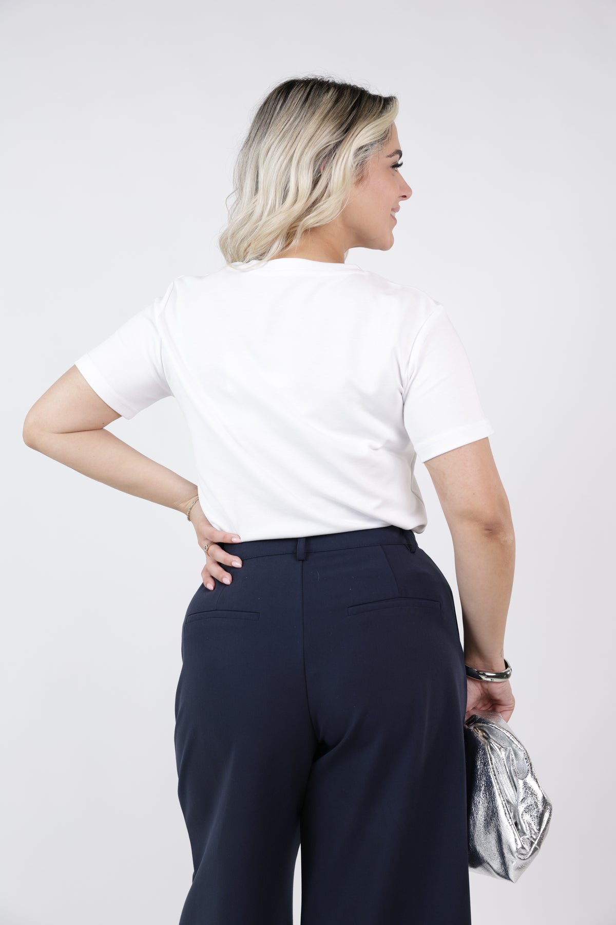 White fitted t-shirt with crystal smile embellishment styled with navy tailored trousers and metallic clutch.