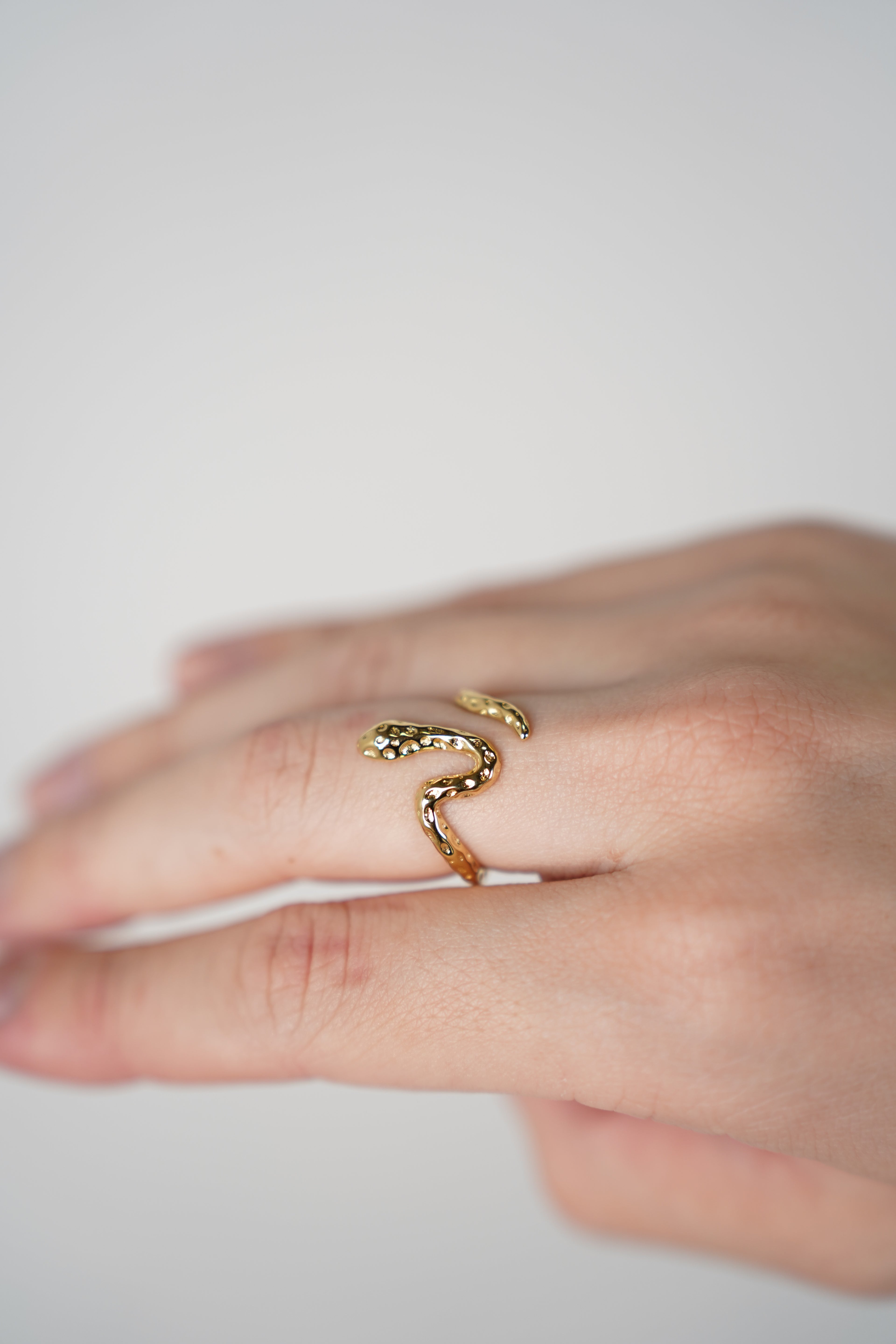 Shop the Malia Thin Snake Ring — a delicate gold serpent wrap band with hammered texture. Adjustable, lightweight, and perfect for stacking.