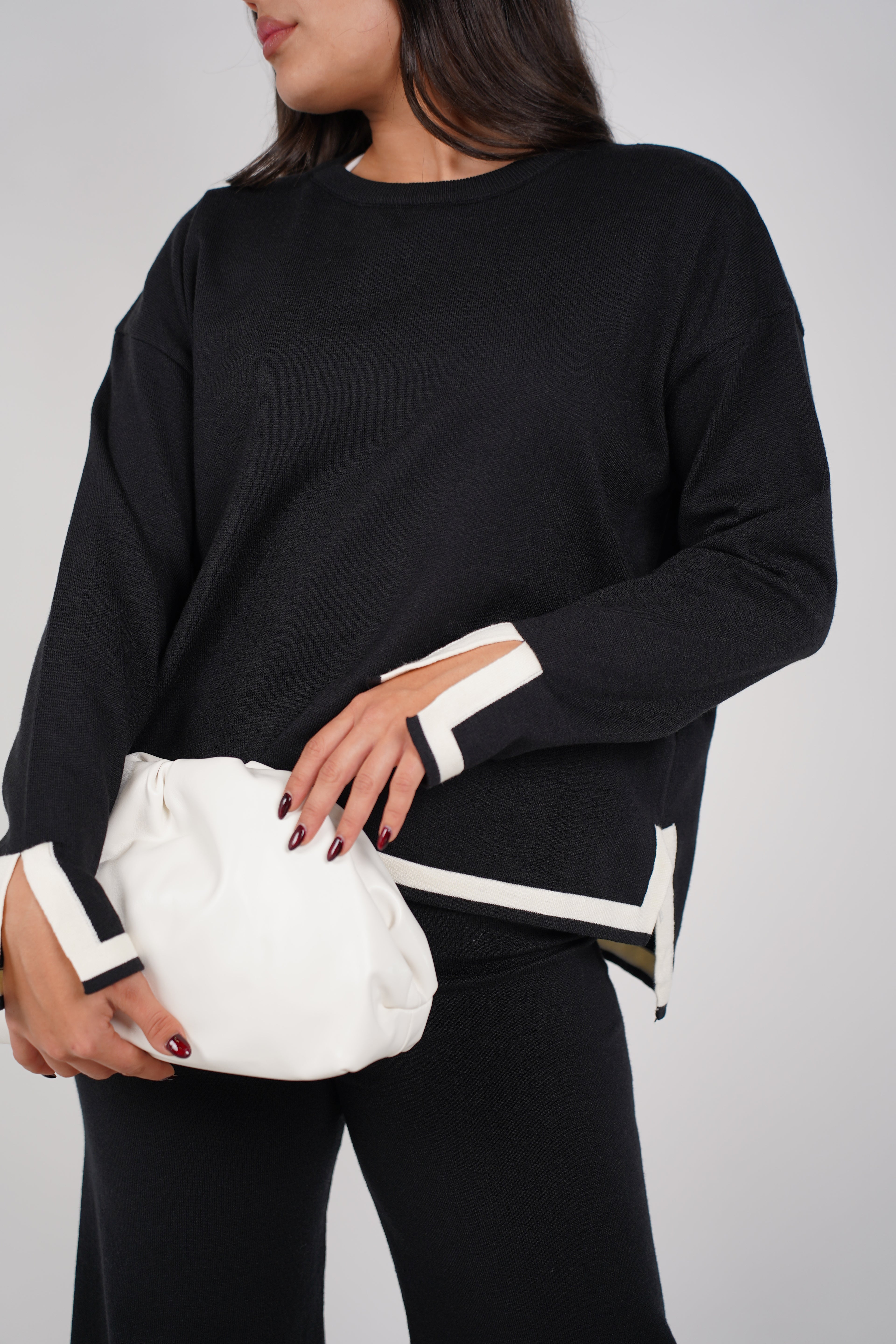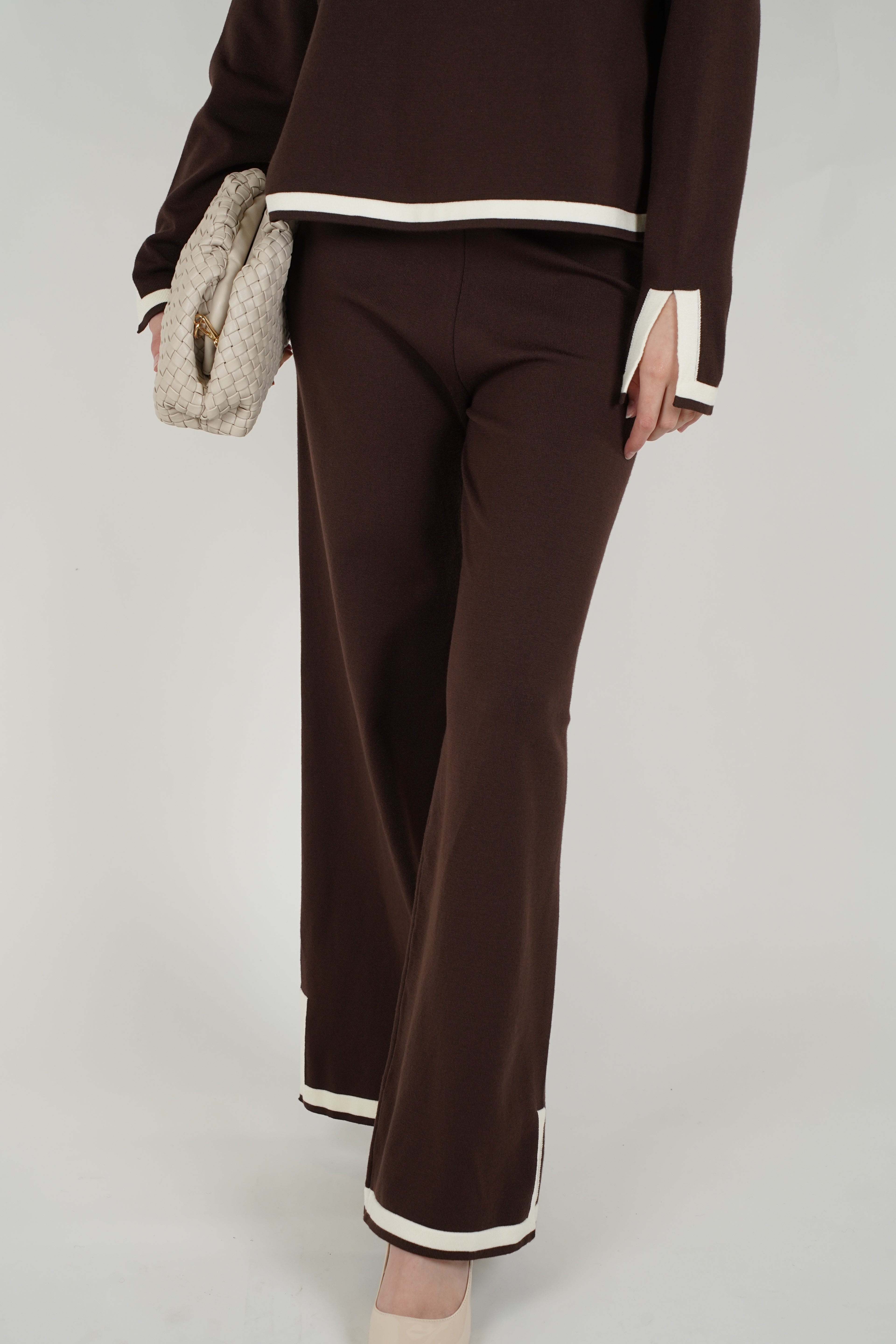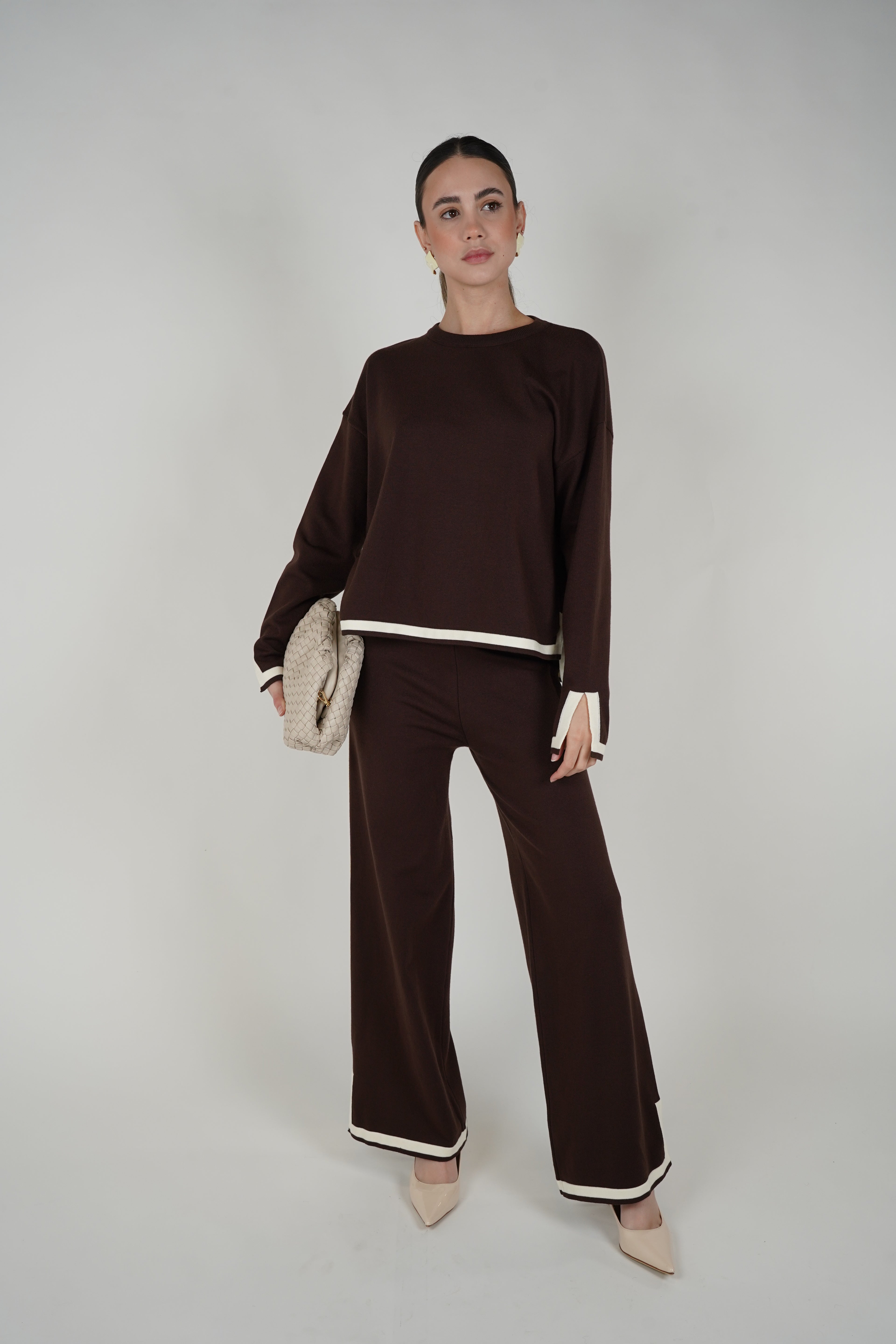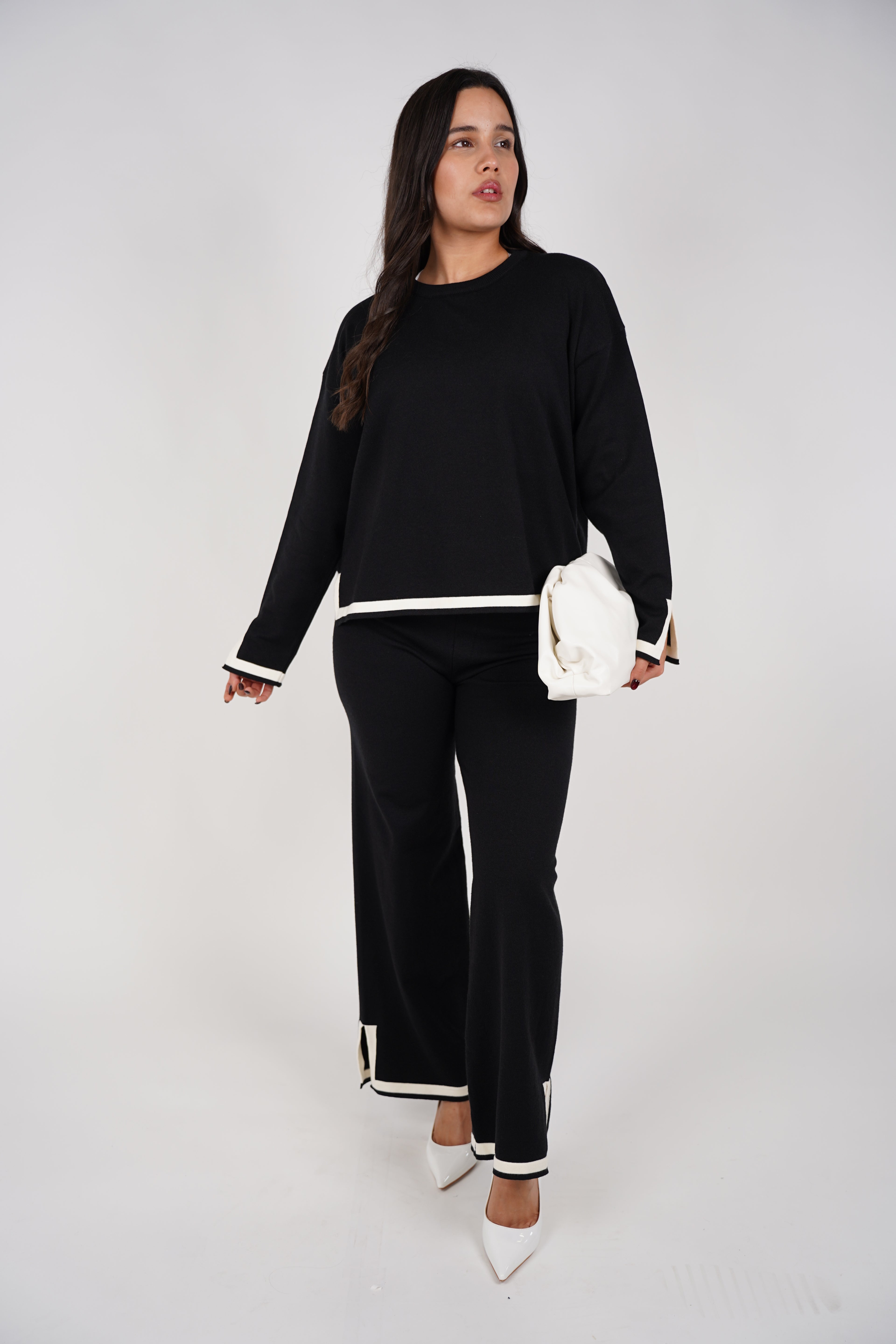 A coordinated knit set featuring a relaxed long-sleeve top and wide-leg pants with contrast trim for an elevated, effortless look.