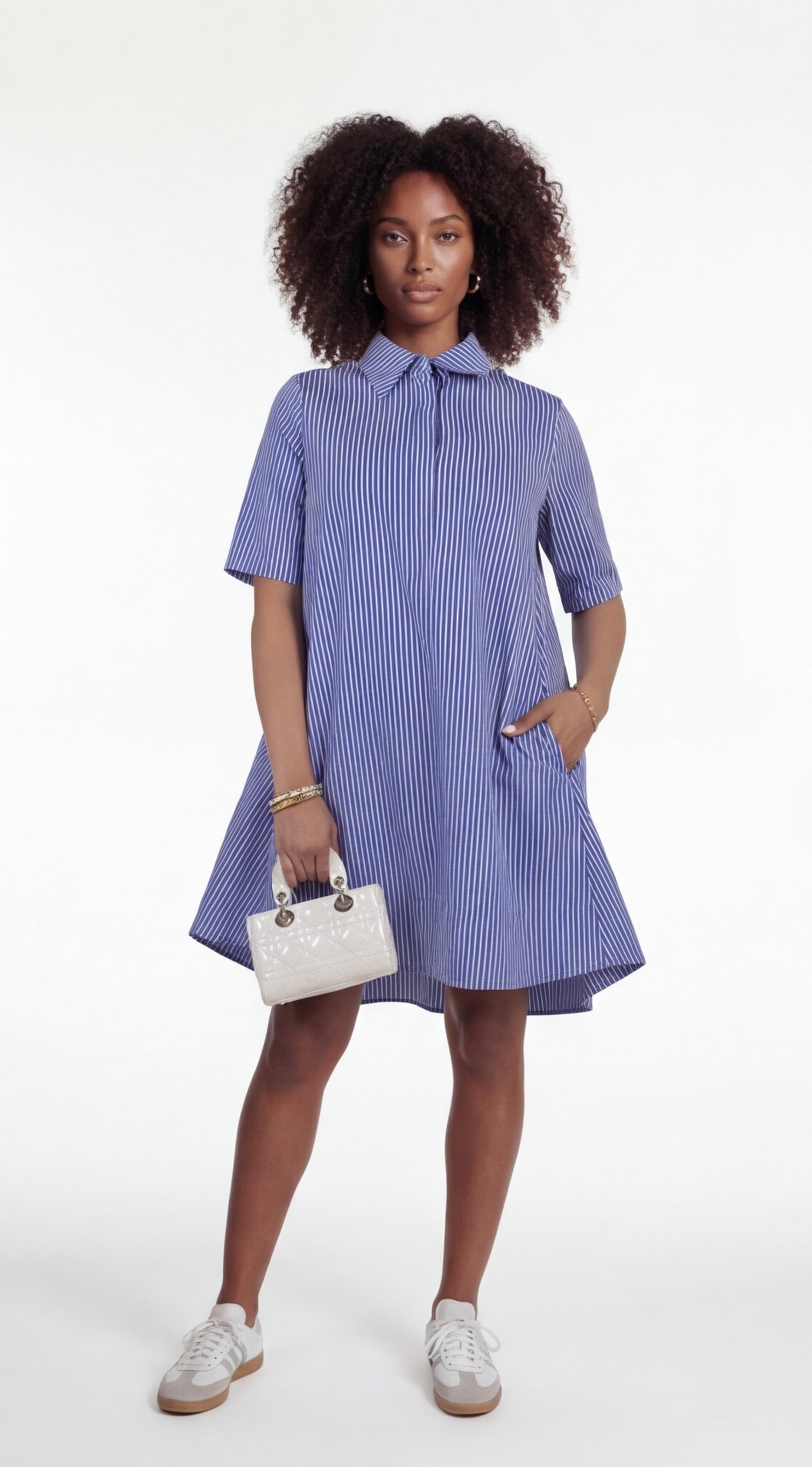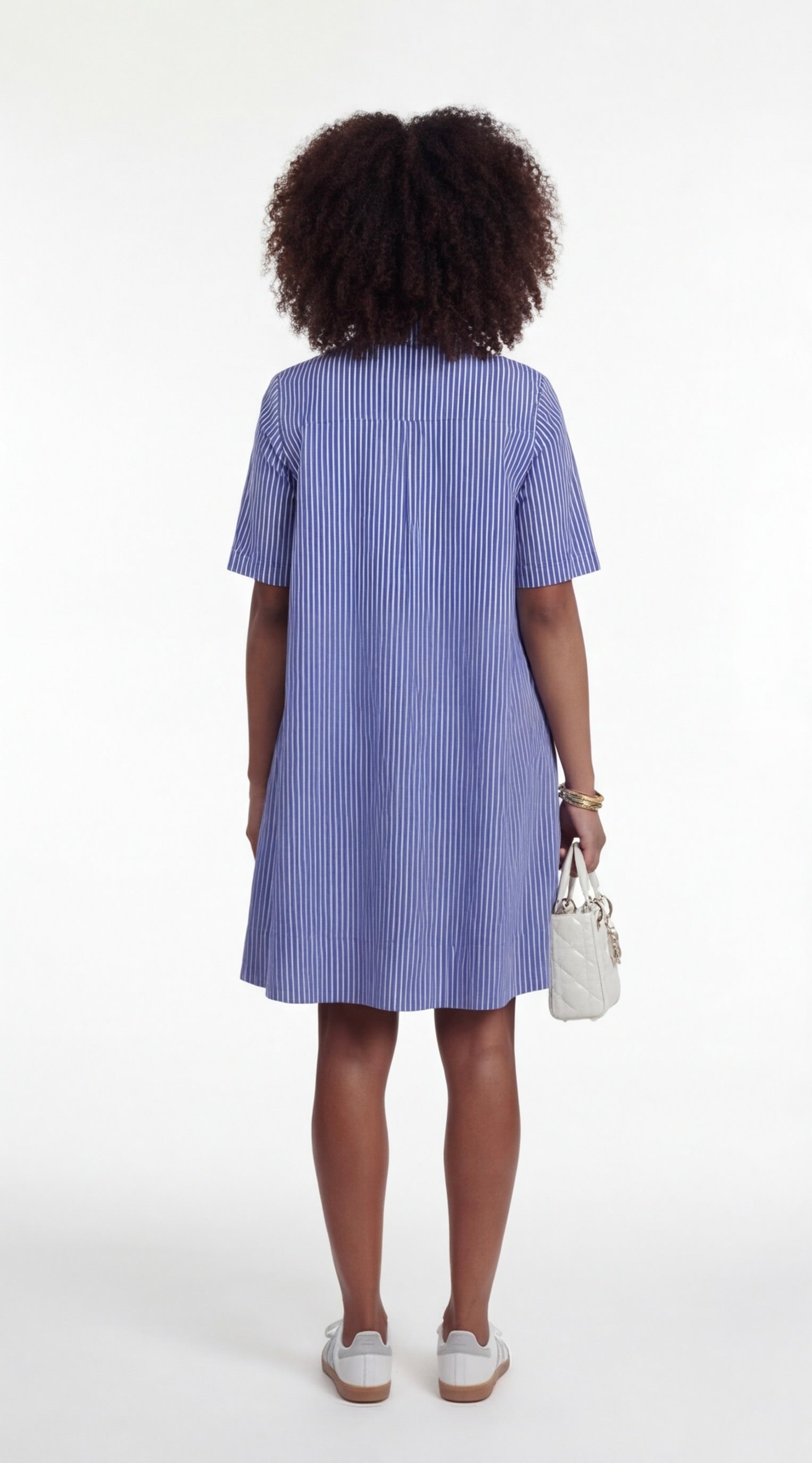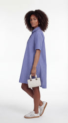 Model wearing blue and white striped A-line shirt dress with collar, short sleeves, and relaxed structured silhouette.