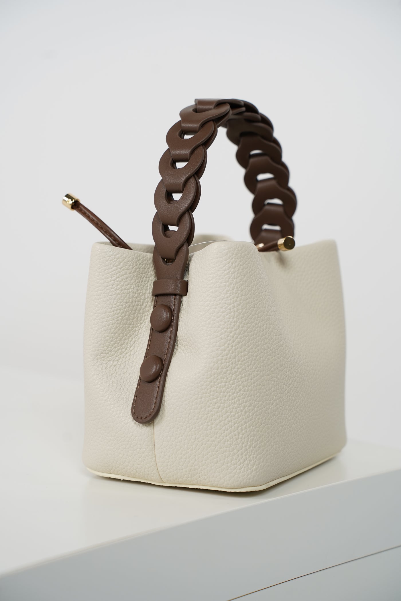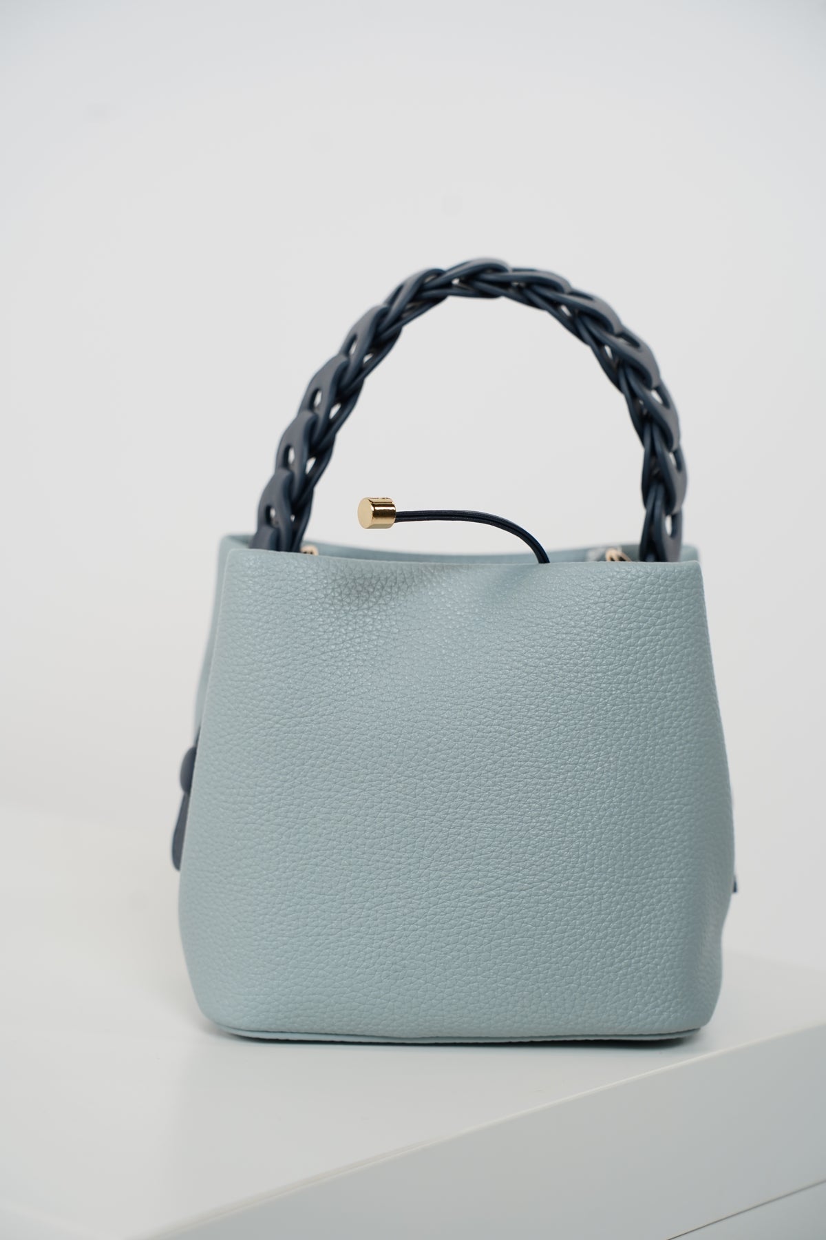 Structured mini bucket bag with chunky chain-style handle. Available in multiple colors for a standout everyday accessory.