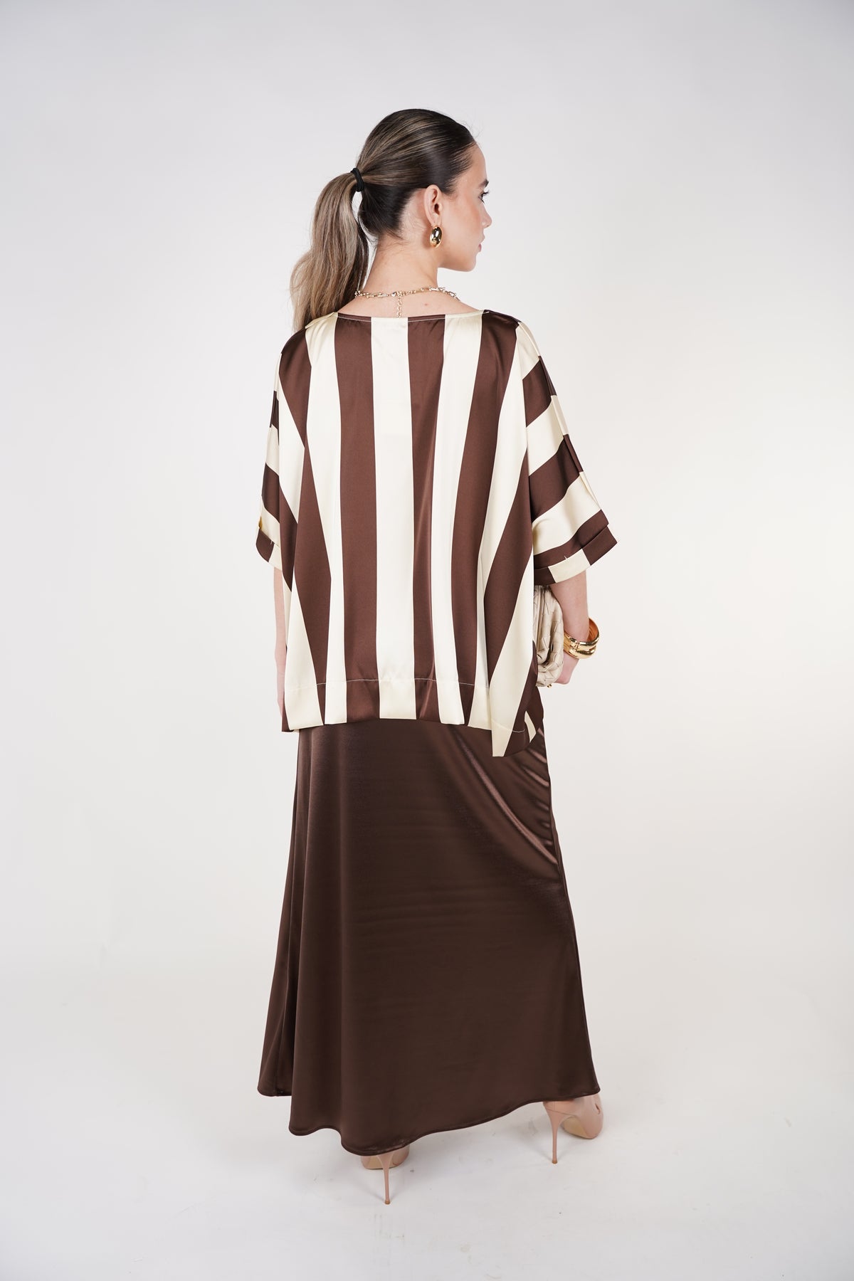 A silky, oversized striped top in rich brown and cream tones—elegant, modern, and effortlessly chic.
