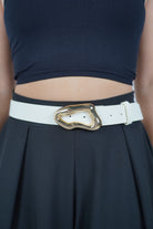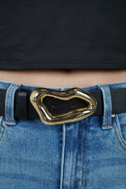 A bold black belt elevated by a unique, abstract gold buckle that redefines everyday styling