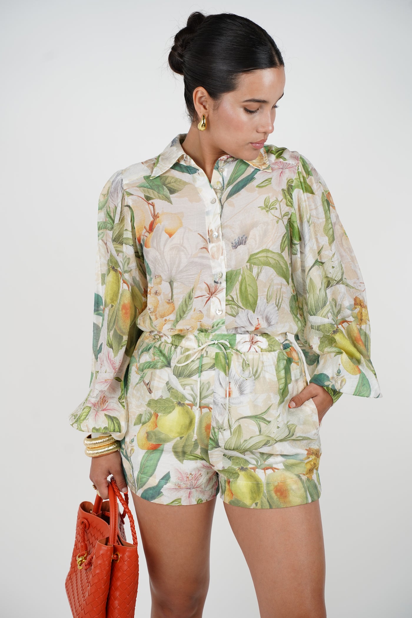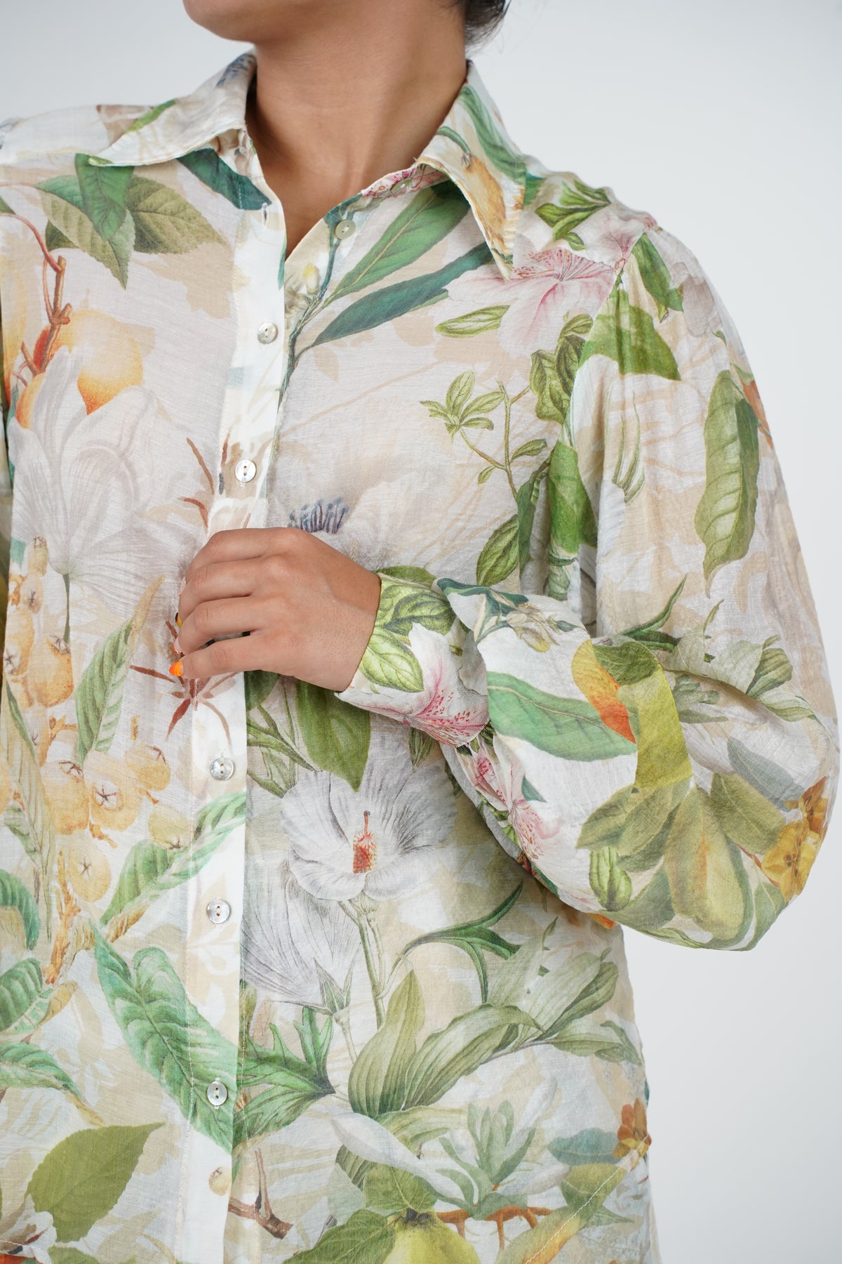Model wearing the Rilora Floral Shorts Set featuring a botanical fruit and flower print in green, yellow, and cream tones. The set includes a long-sleeve button-down top and drawstring shorts.