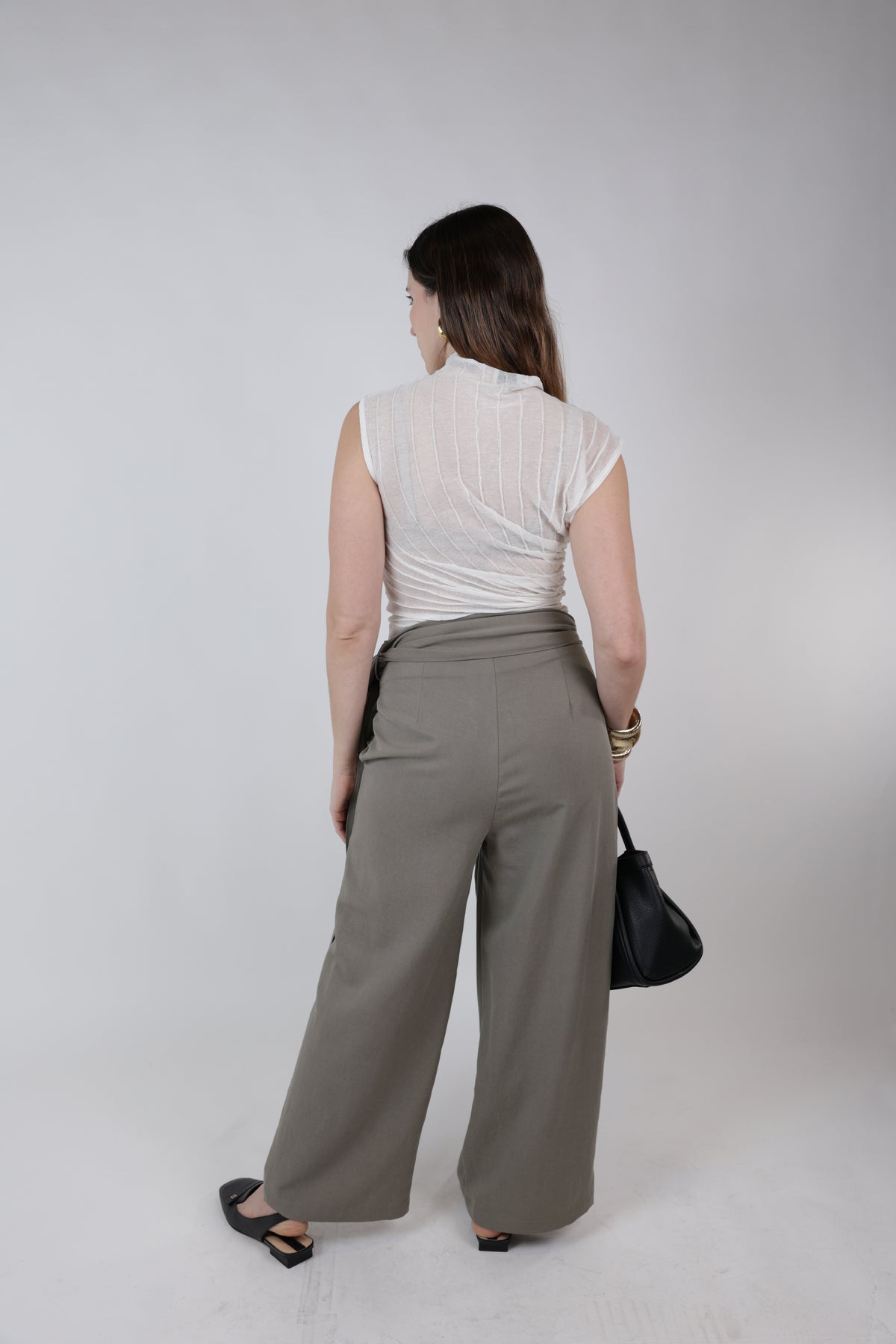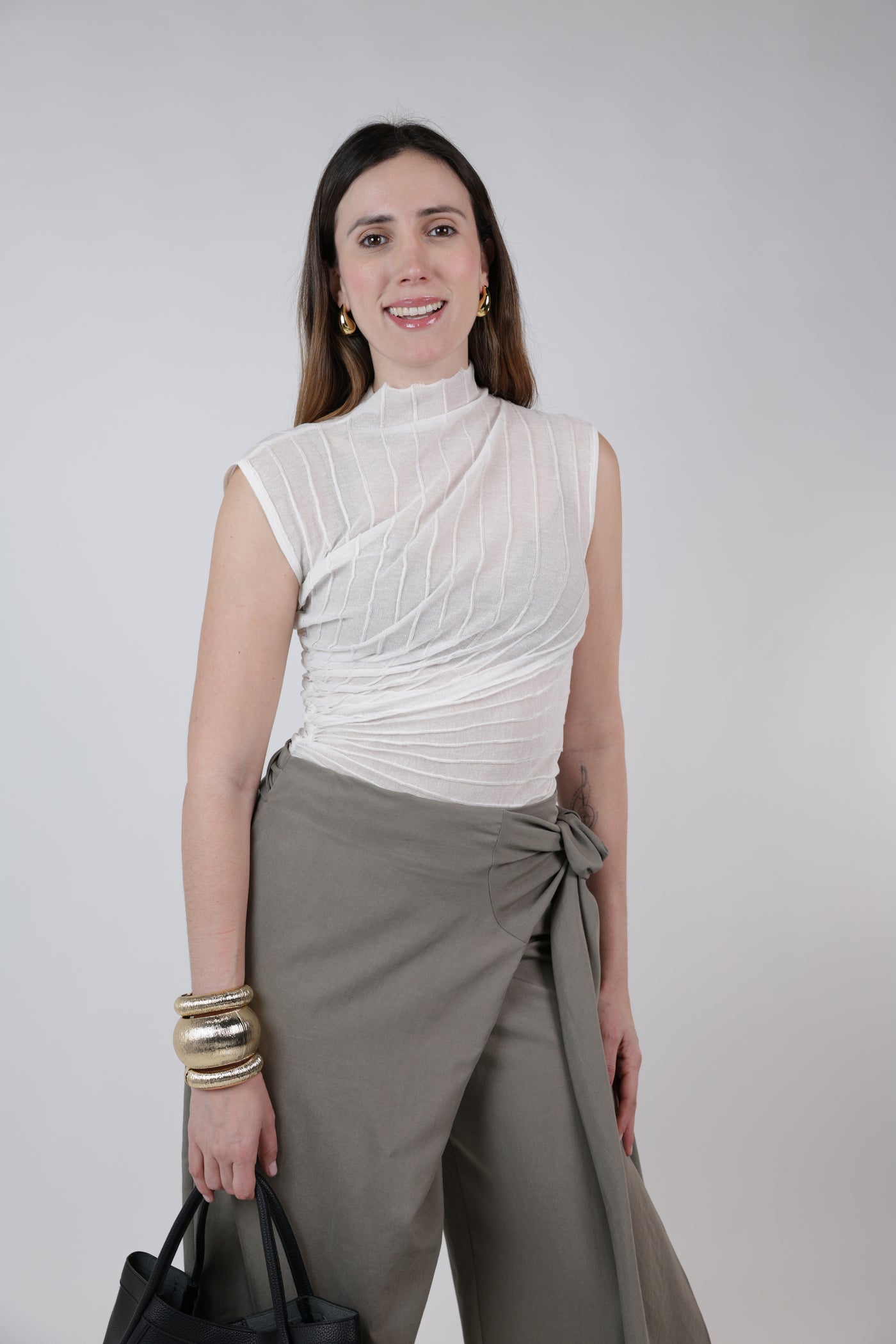 White ribbed sheer asymmetrical draped fitted top with mock neckline styled with taupe tailored trousers and gold cuff bracelets.