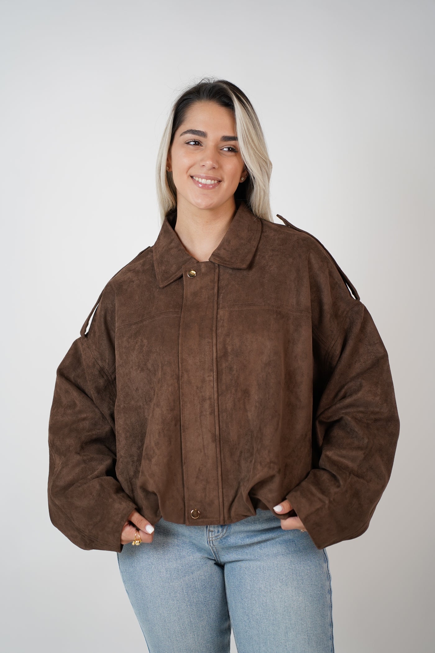 Shop the Select Suede Bomber Jacket – soft oversized faux-suede jacket in rich brown. Modern, cozy, and perfect for layering through the season.