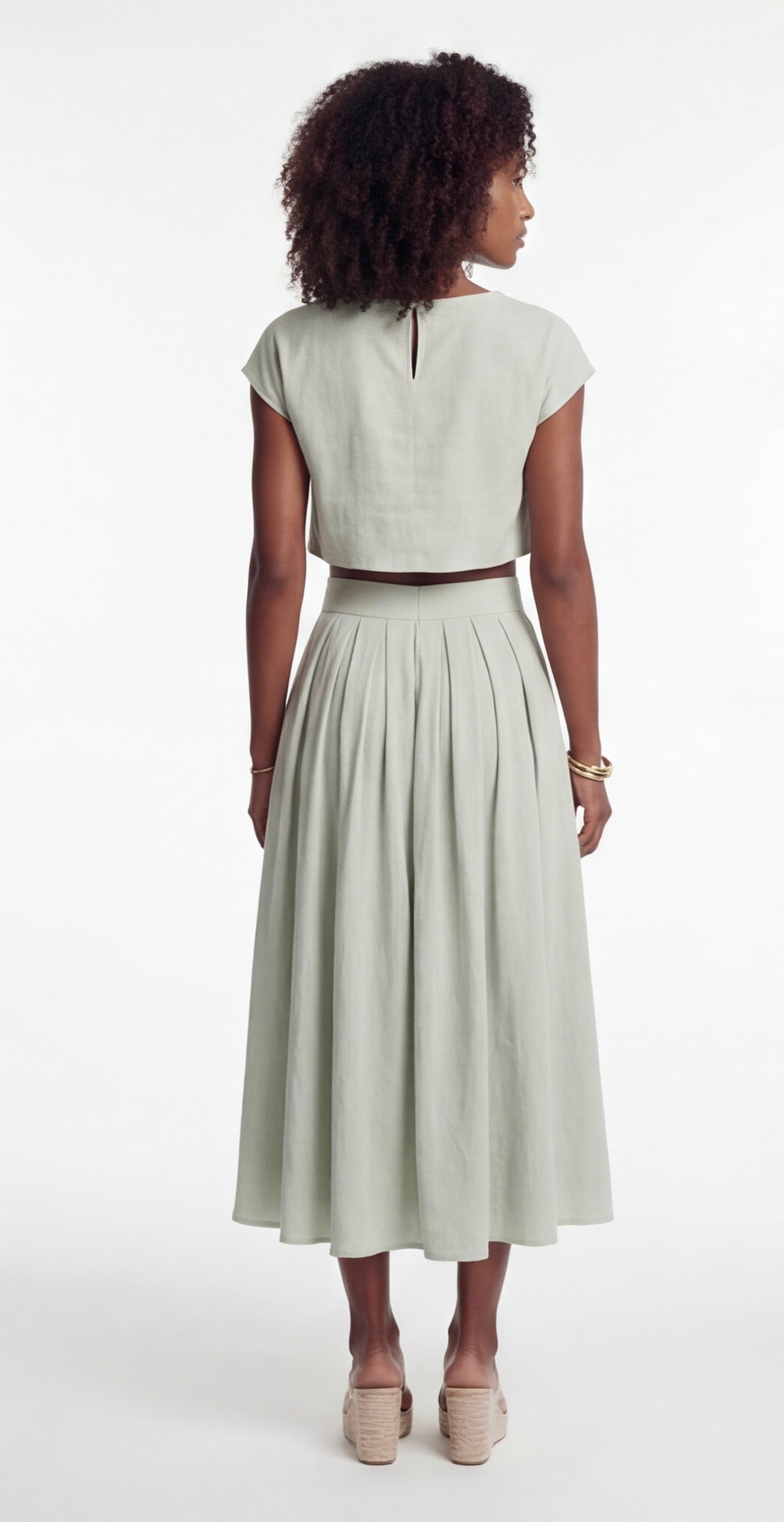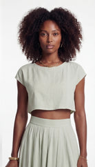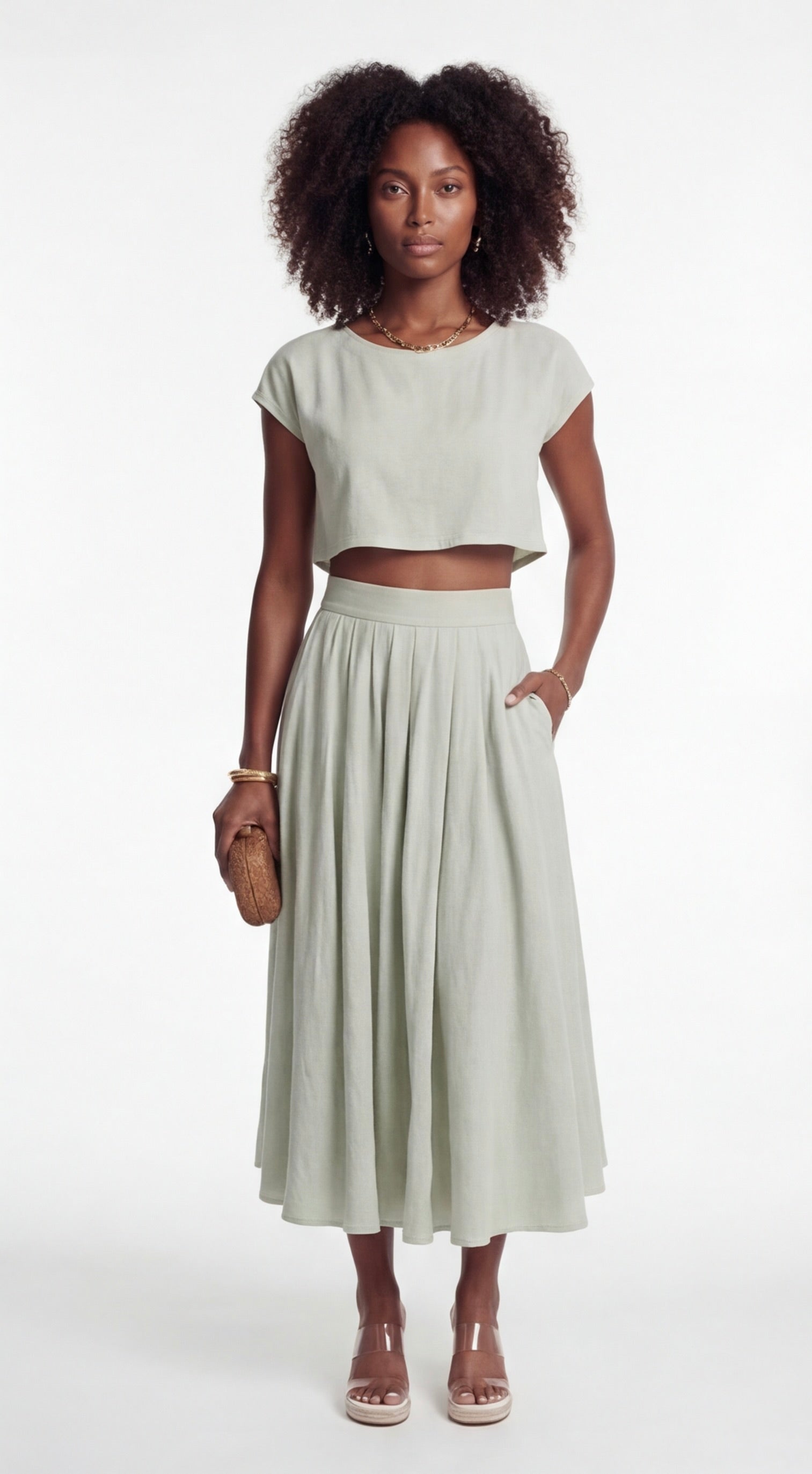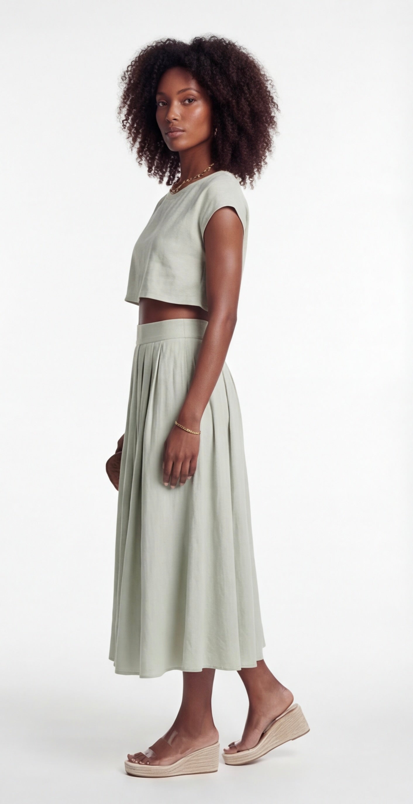 Model wearing sage green two-piece set with cropped top and flowing high-waisted midi skirt.