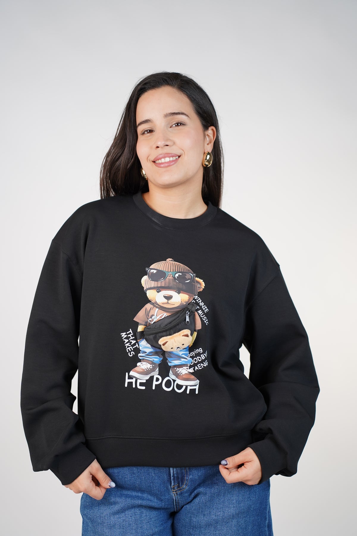The Teddlyn Double Bear Sweater brings the perfect mix of comfort and playful charm. Designed with a bold graphic of a stylish bear and a mini bear tucked inside a faux pouch detail, this sweater adds a cute and trendy twist to your casual looks. Its soft fabric and relaxed silhouette make it ideal for cozy days, errands, or laid-back outings. Pair it with denim, leggings, or joggers for an effortless and adorable everyday outfit.