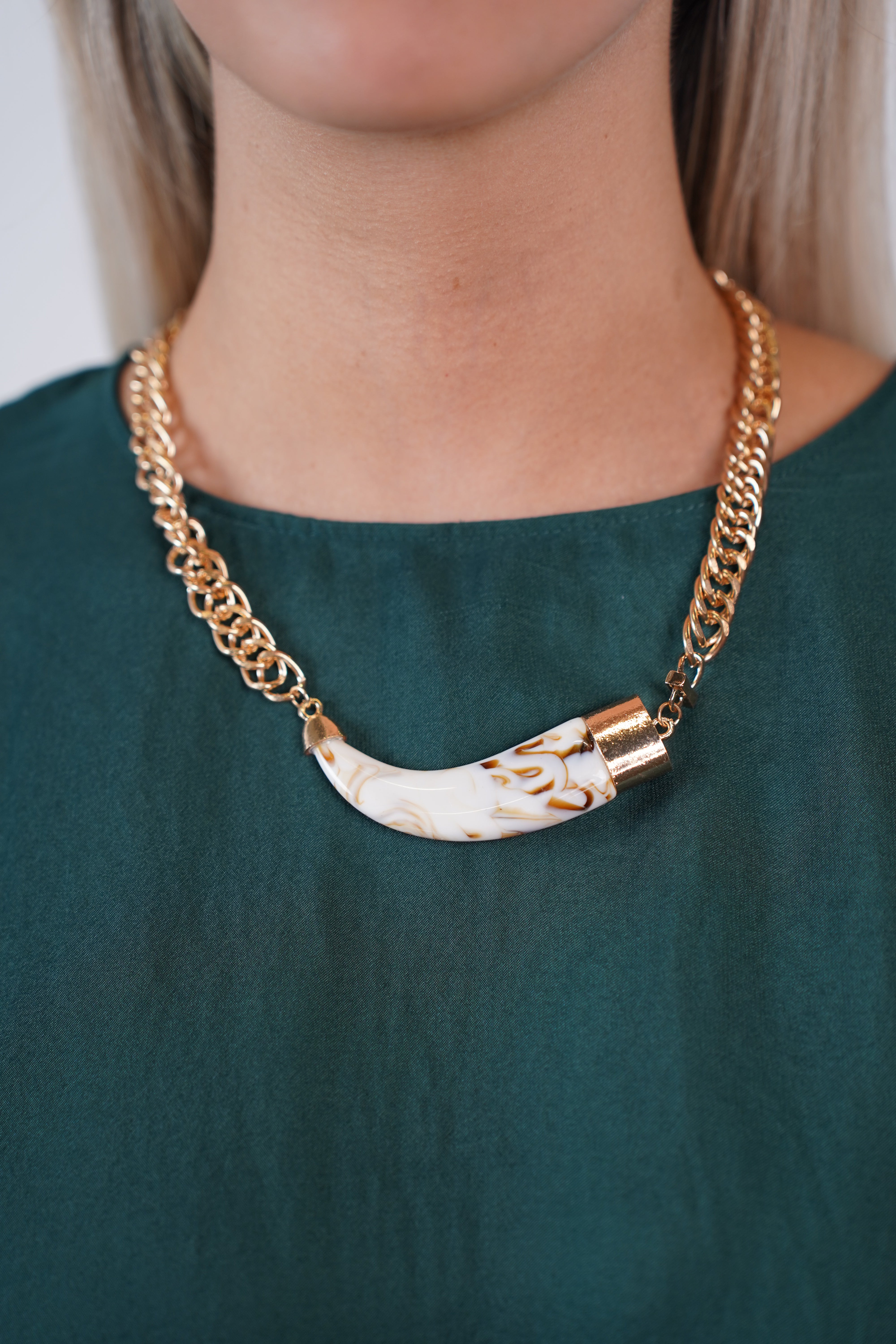 Shop the Thick Horn Necklace – gold statement chain with a marbled horn pendant in white and caramel tones. Elegant and bold accessory for any outfit.