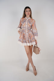 The Vanys Stamped Mini Dress brings sophistication and flair in one effortless piece. Crafted from silky, lightweight fabric, this mini features a vibrant, vintage-inspired print in warm tones of orange, cream, and mauve. It has long puffed sleeves, a mandarin collar, and delicate gold-tone buttons running down the front. The matching belt with a round buckle defines your waist, while the flared skirt adds movement and grace. Ideal for brunch, date night, or any stylish occasion.
