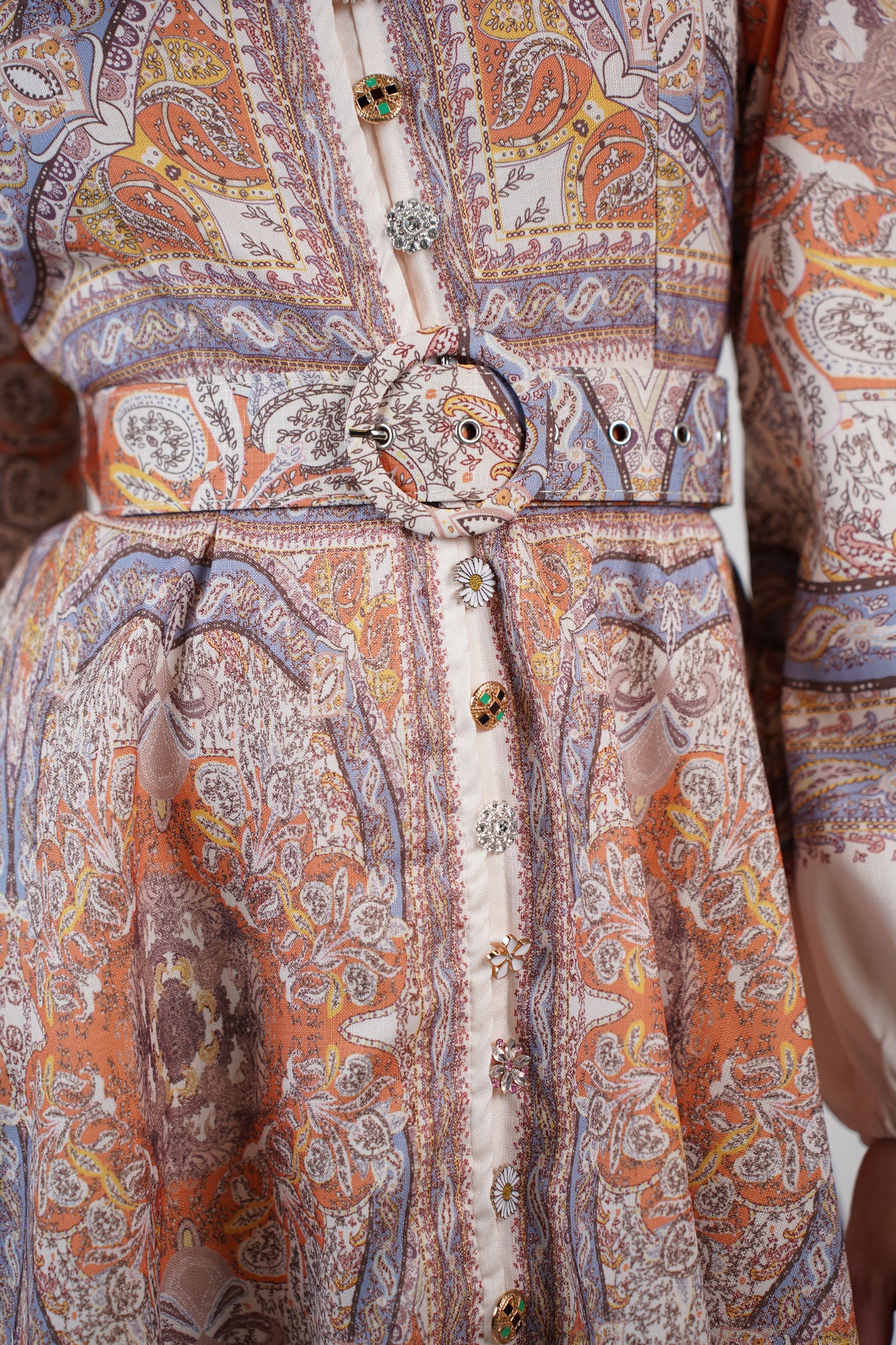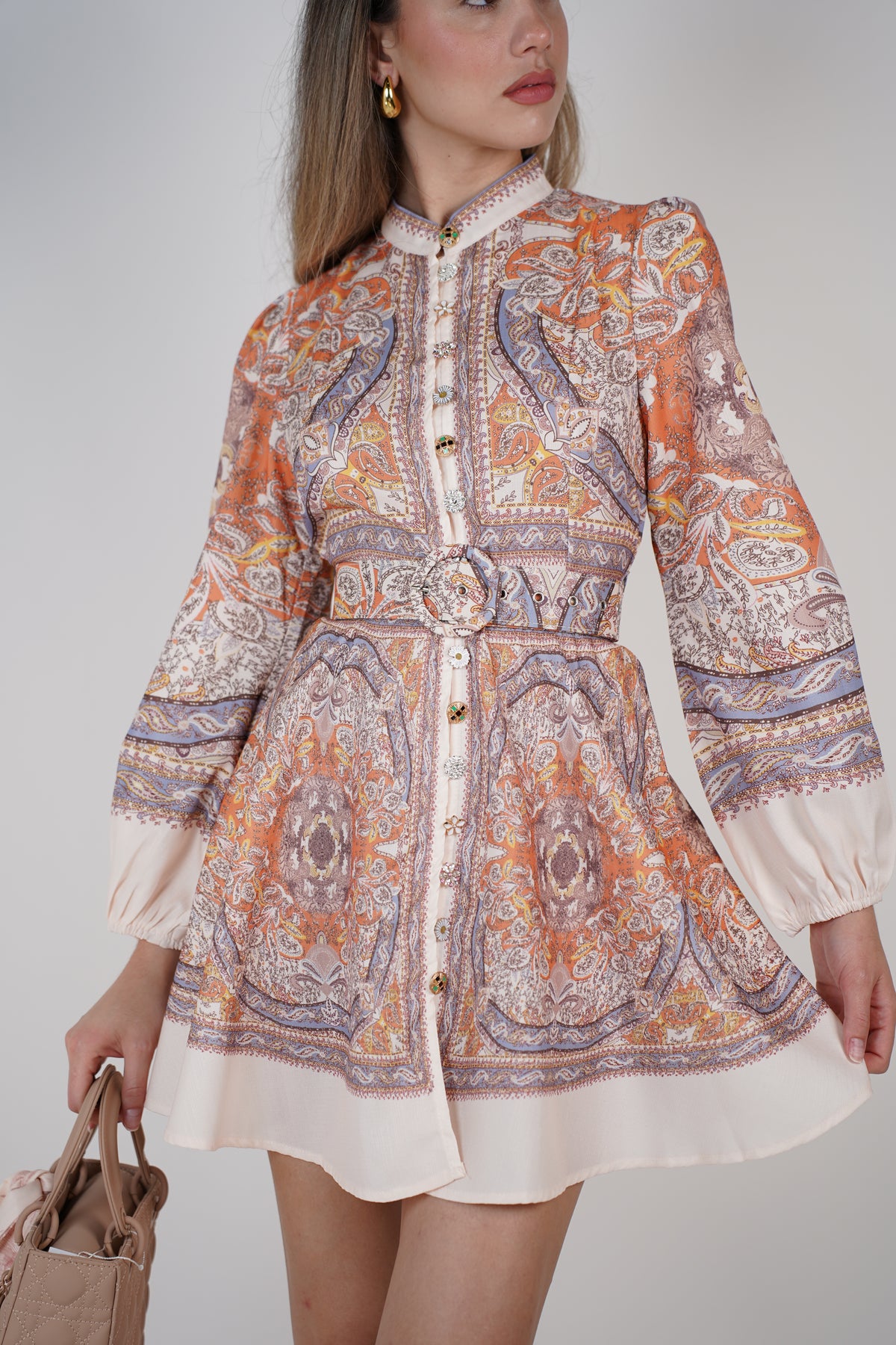 A stunning mini dress with a rich, ornamental print, decorative buttons, and a matching belt for a chic, elevated look.