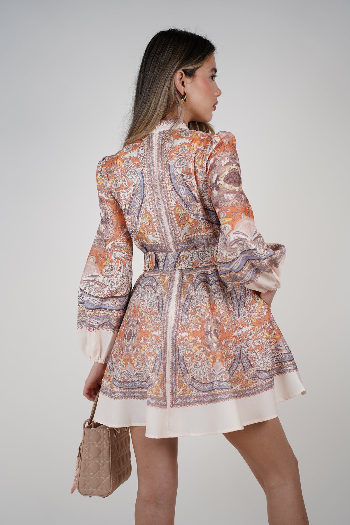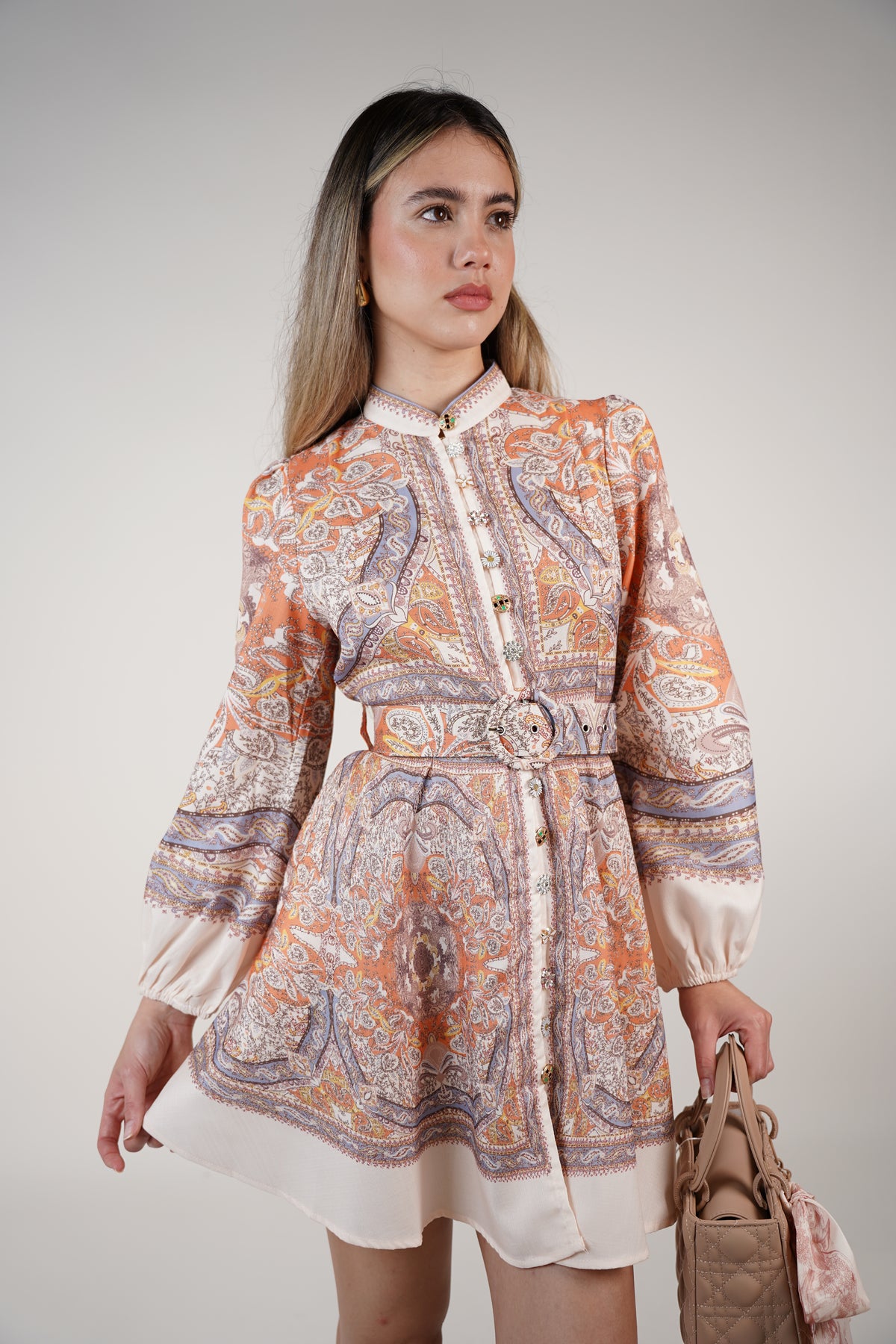 Meta Title: Vanys Stamped Mini Dress – Ornate Print Dress with Belt | Carema Boutique